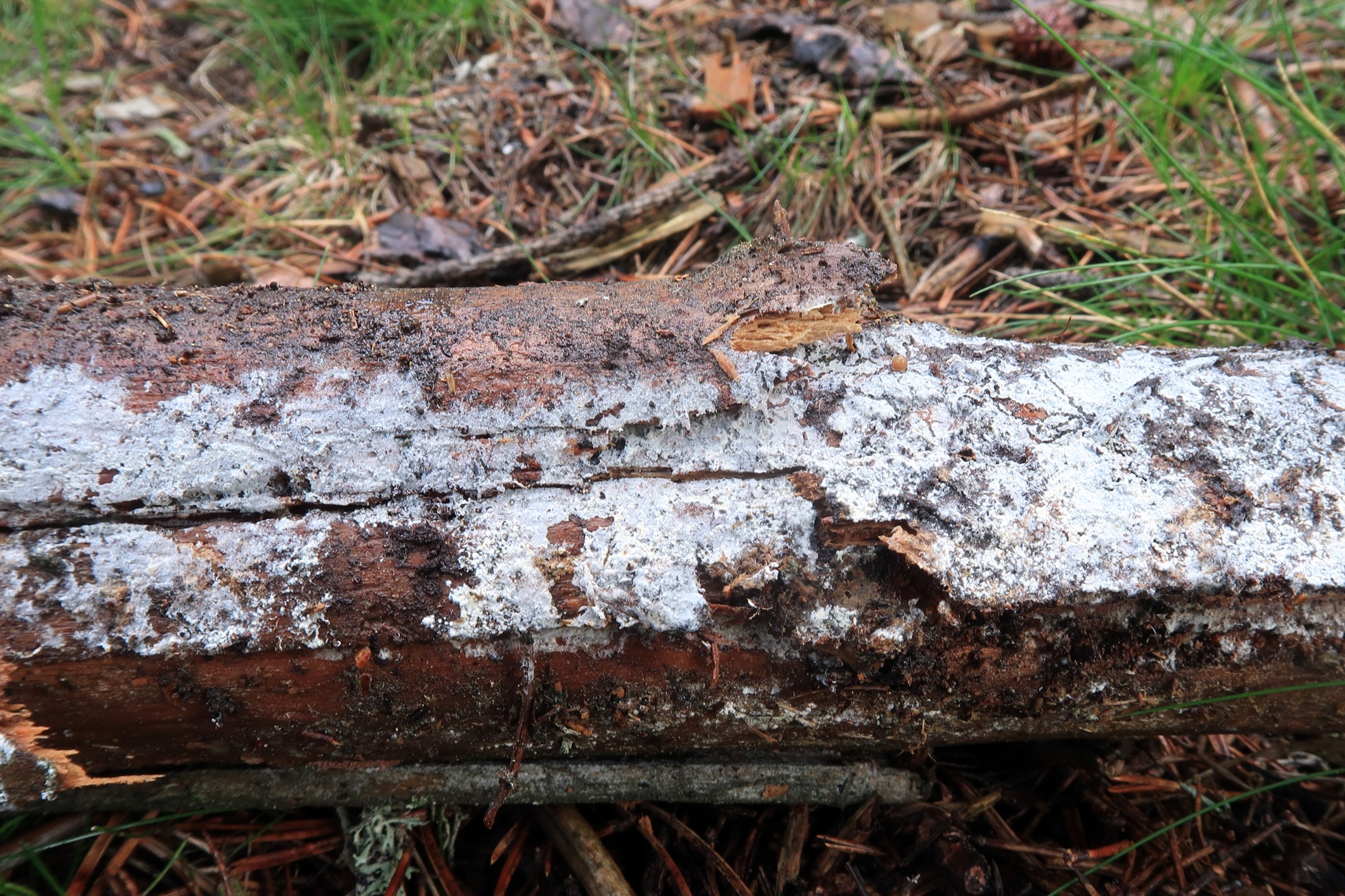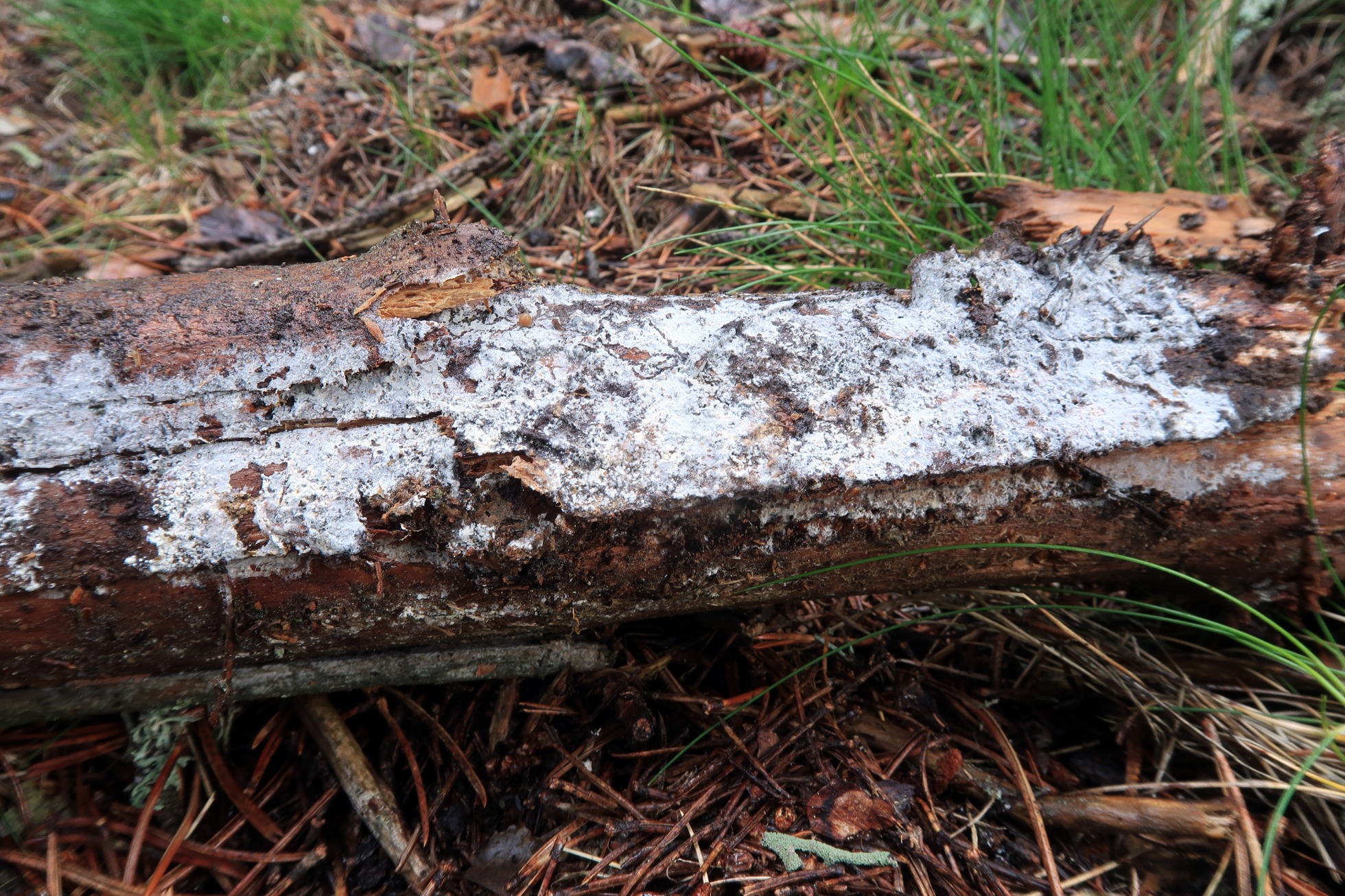 Un hongo resupinado fotografiado el domingo 18 de junio, en el Pirineo Catalán a 1800 metros de altitud, brotando sobre la superficie de un tronco tumbado en el suelo de Pinus mugo.