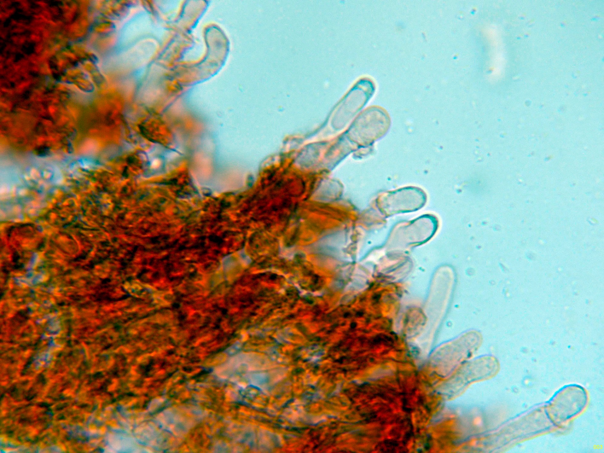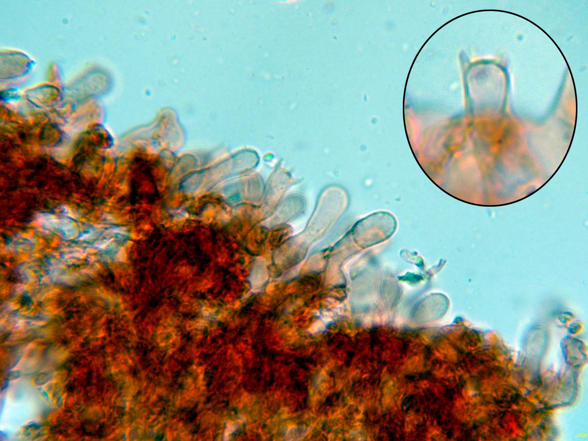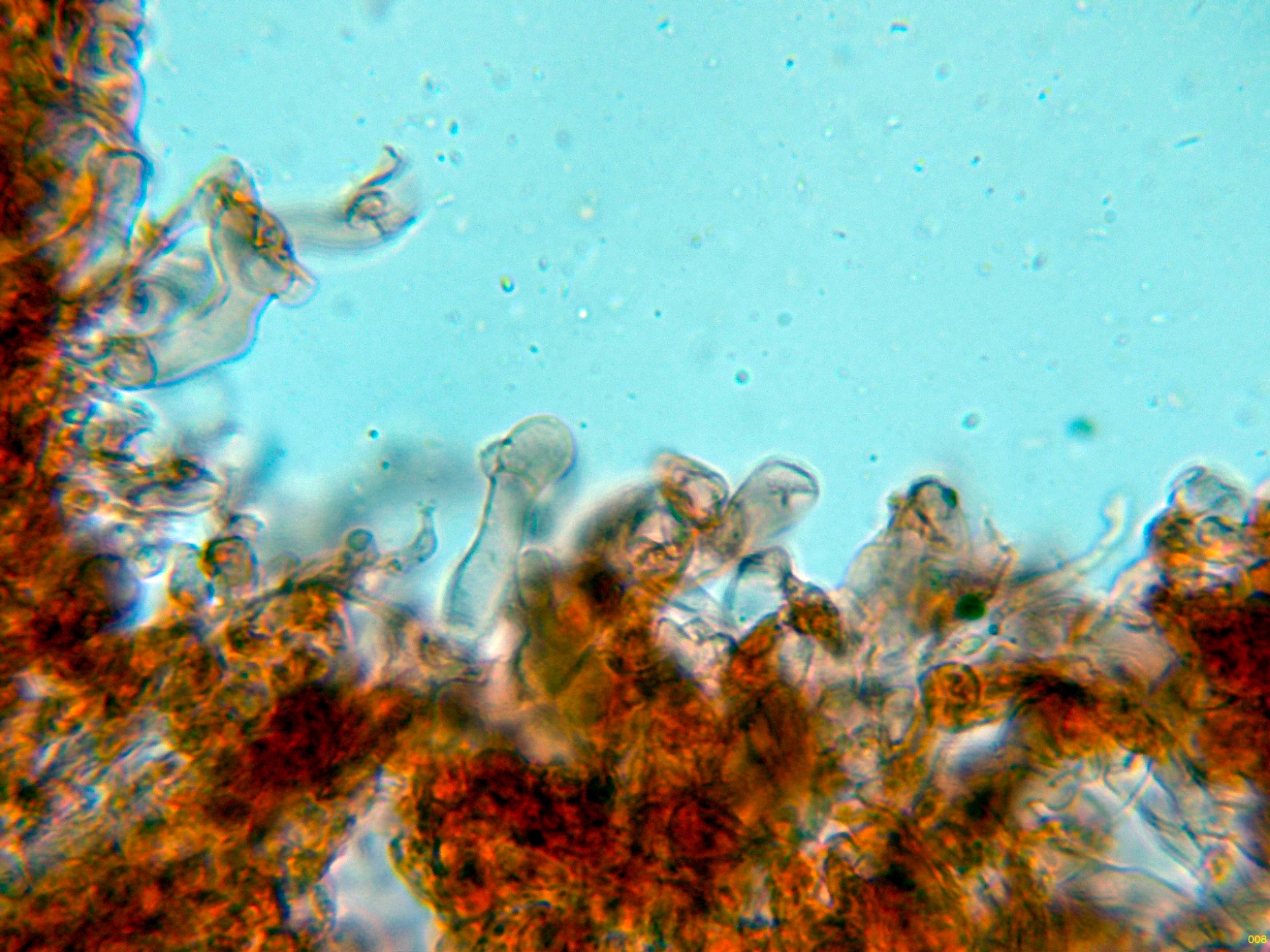 Aunque la especie se describe como “sin cistidios”, si que se pueden observar en el himenio unas hifas terminales estériles que se corresponderían con basidiolos, y que no sobresaldrían por encima de los basidios, con fíbulas basales presentes.