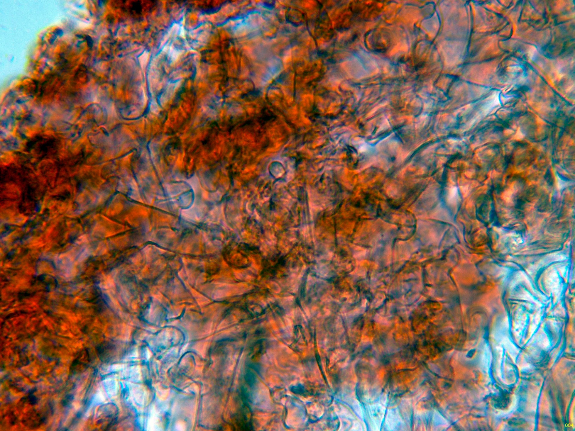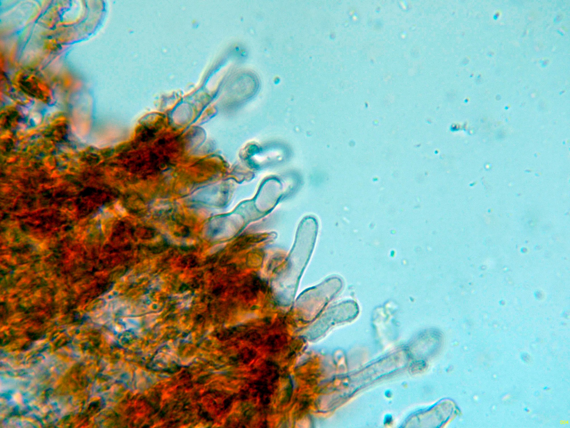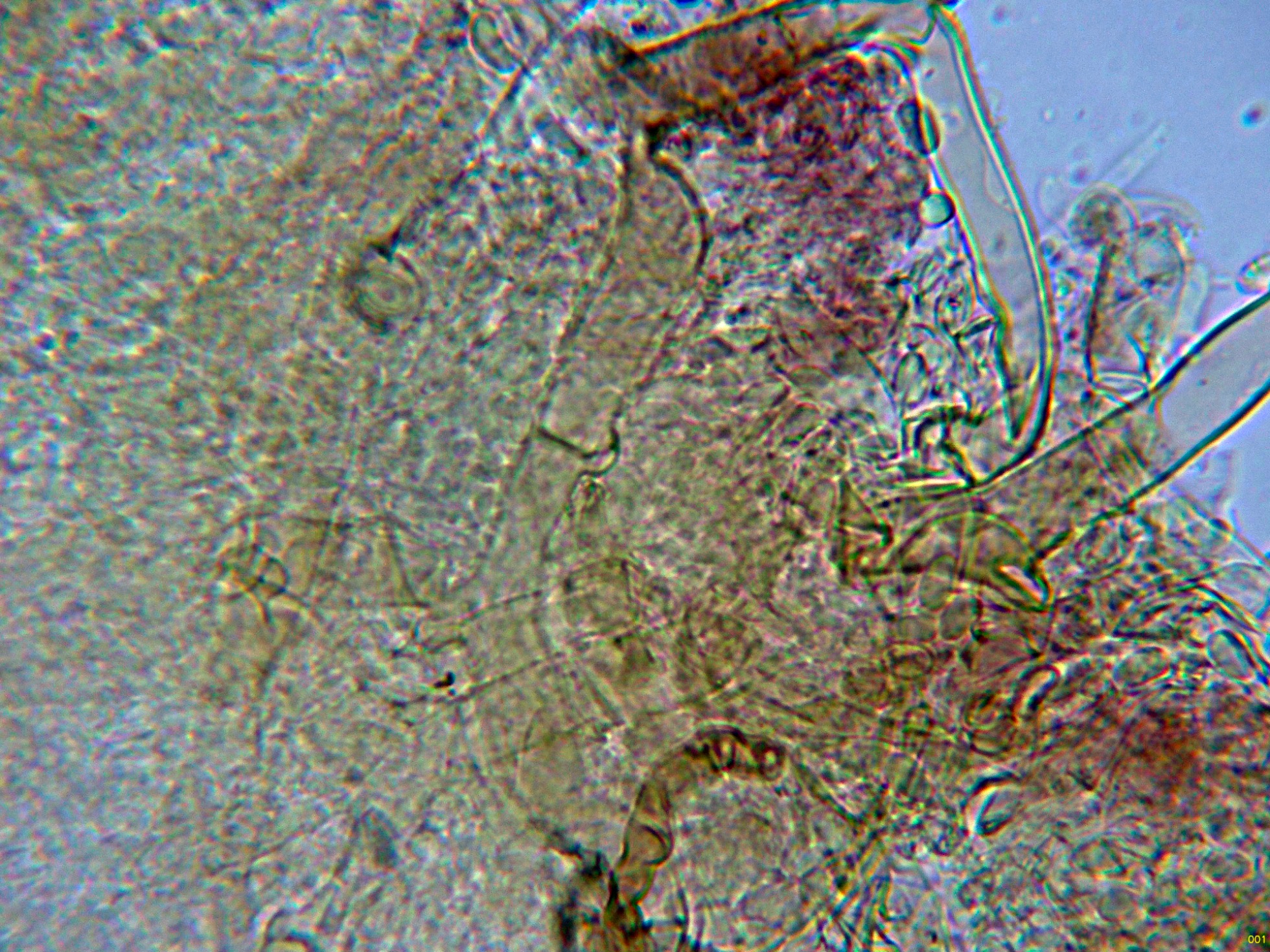 Aunque la especie se describe como “sin cistidios”, si que se pueden observar en el himenio unas hifas terminales estériles que se corresponderían con basidiolos, y que no sobresaldrían por encima de los basidios, con fíbulas basales presentes.