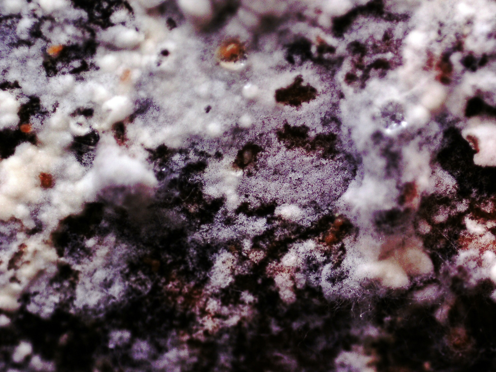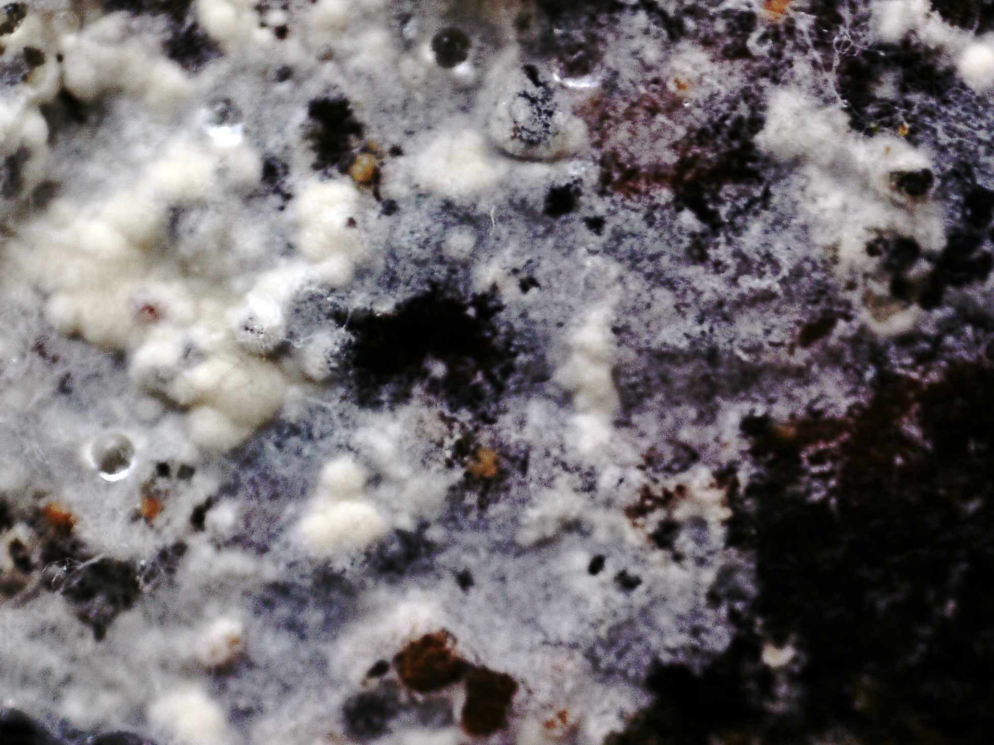 Fructificación blanquecina con ligeros matices grisáceos, de muy poco grosor, aspecto pulverulento y sin un claro borde de crecimiento plumoso.