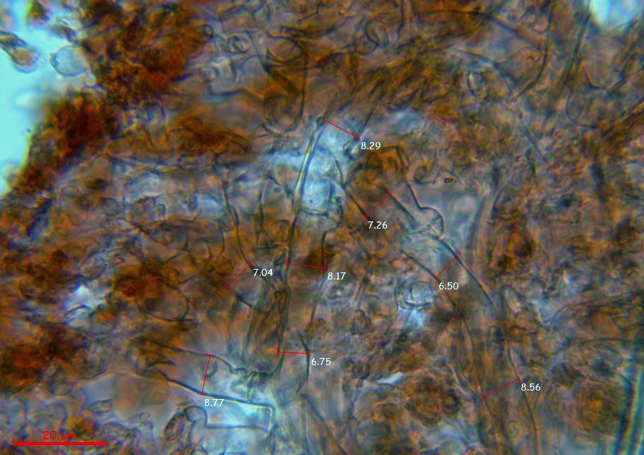 Hifas subiculares con una anchura de entre 5,3 y 8,8 micras, con los tabiques provistos de gruesas y marcadas fíbulas.