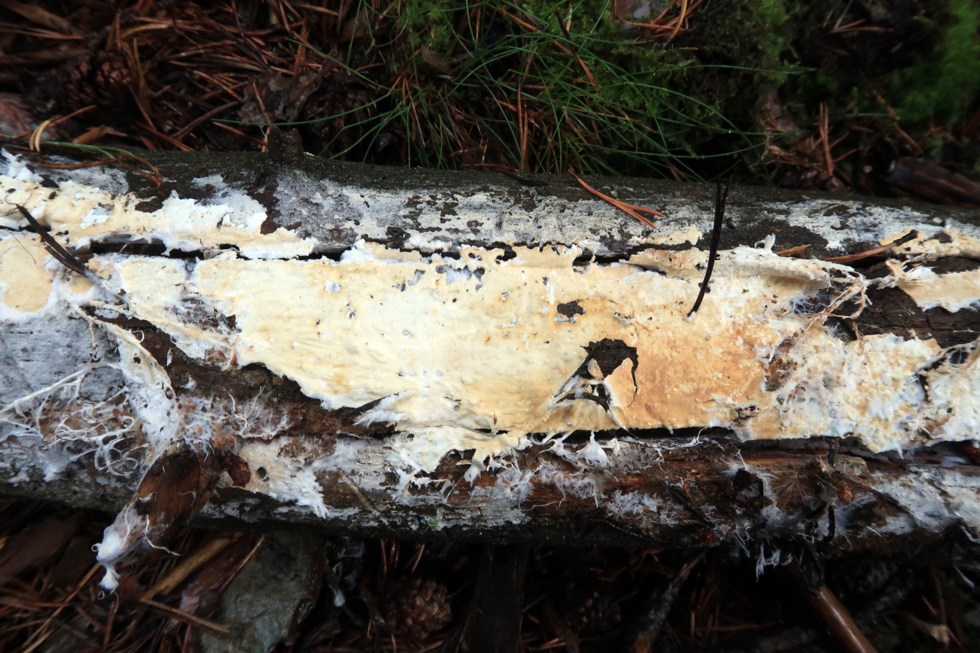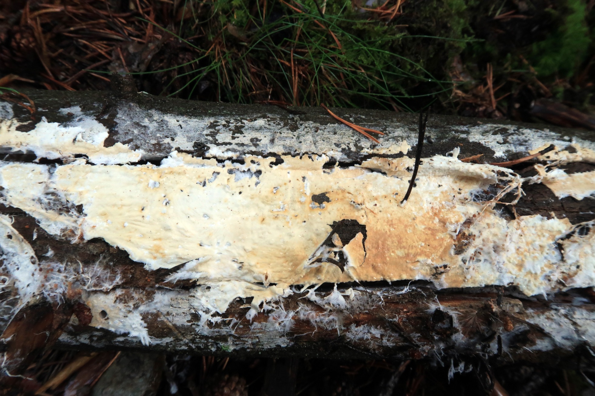 Un Corticial de color crema sobre un pequeño tronco, en pinar de altura.