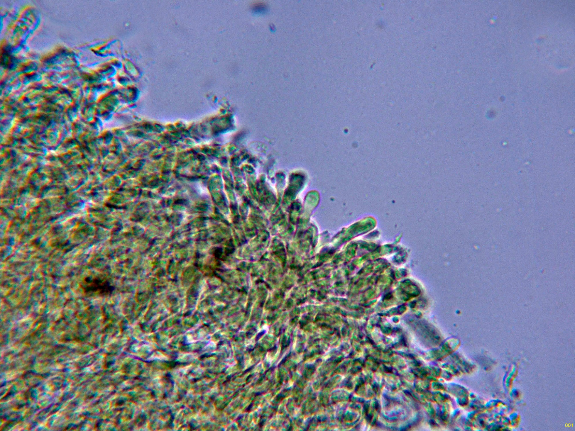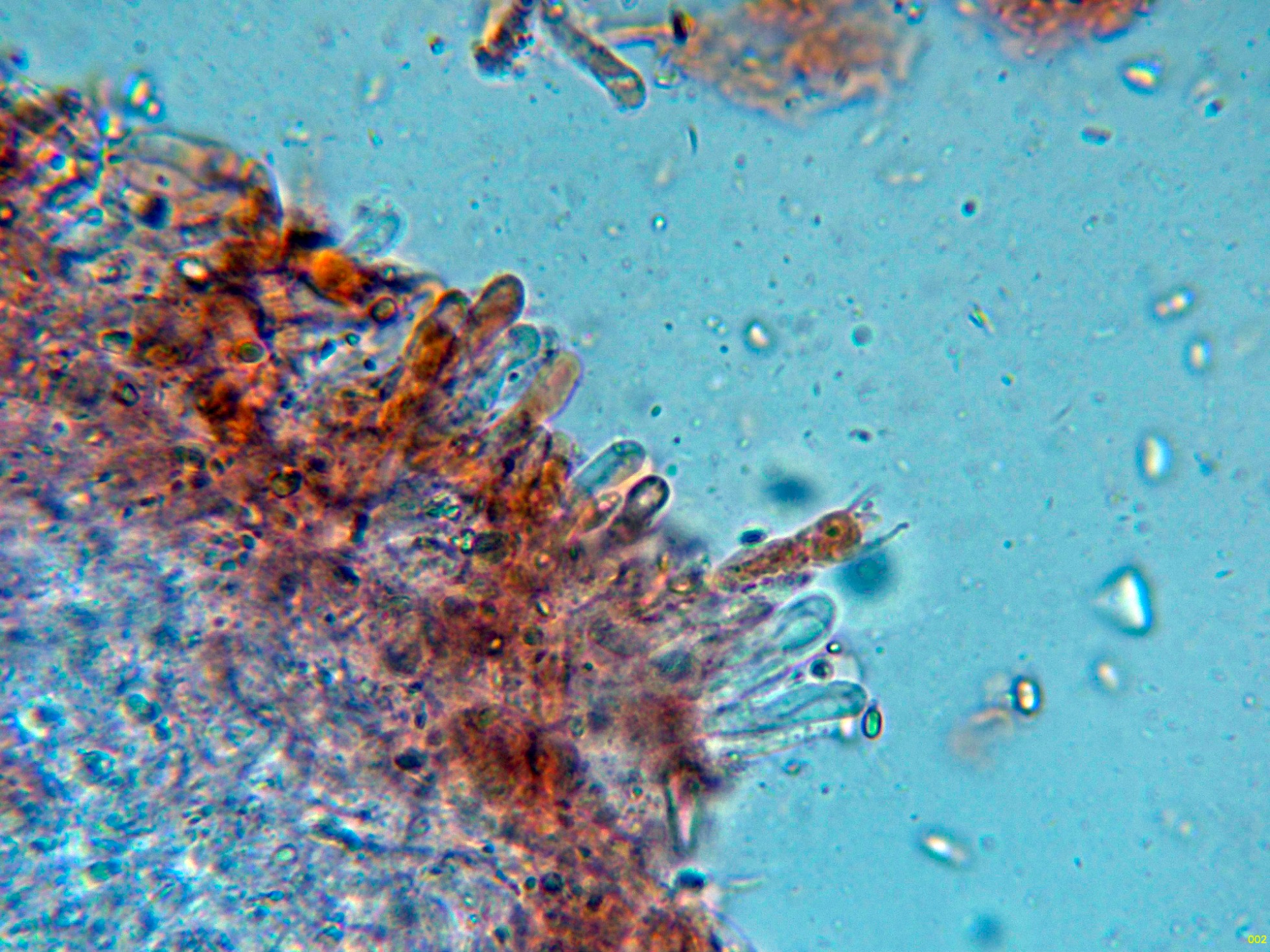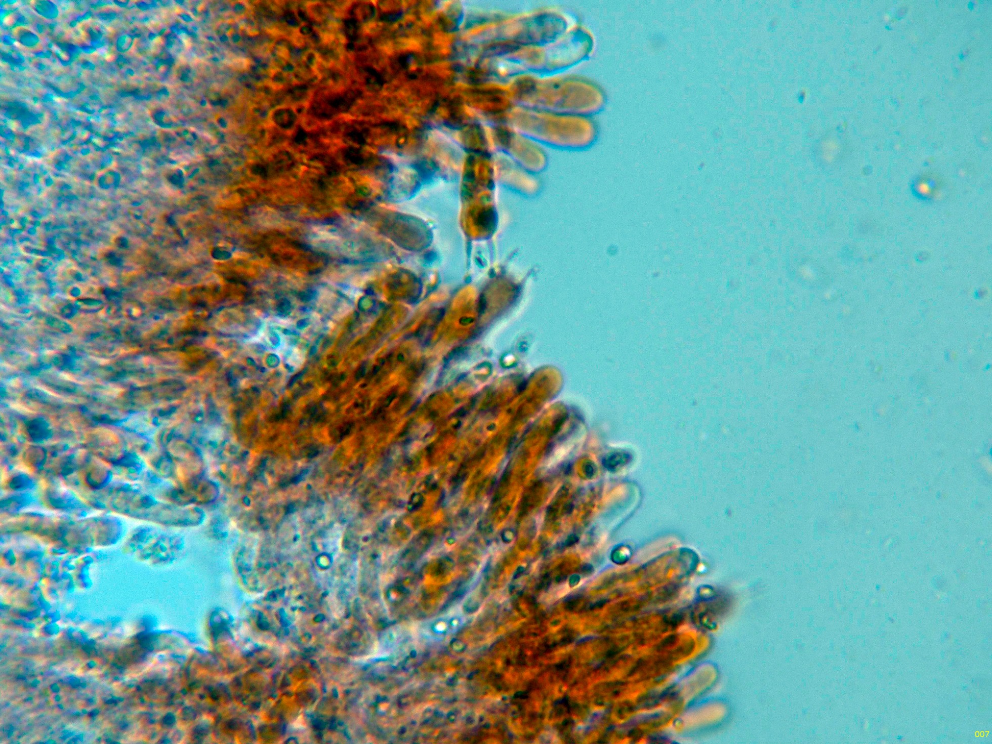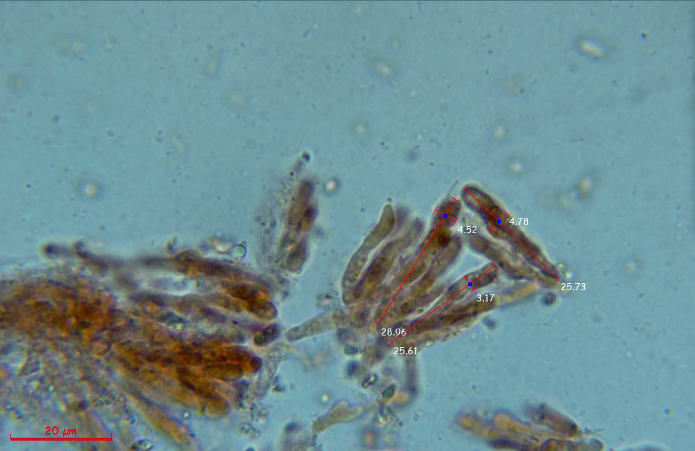 Observaciones: Me surgen algunas dudas en cuanto a su correcta identificación ya que las medidas esporales en cuanto a la anchura se encontrarían por debajo de la que se atribuye a la especie según bibliografía de 2,8-4 um., además del sustrato, dado que la Efibula tuberculata estaría relacionada con maderas duras, y la recogida la hice bajo Pinus mugo.