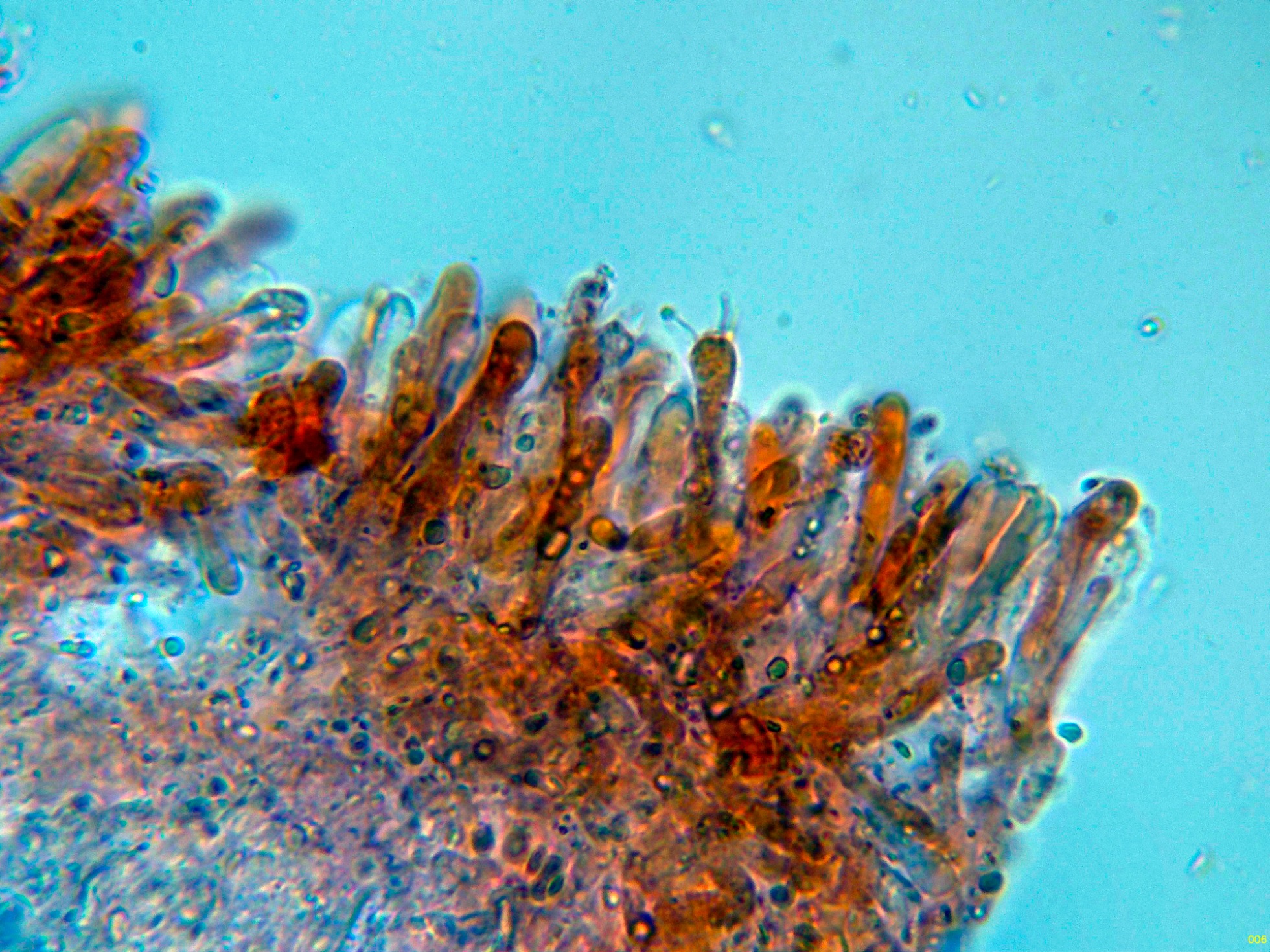 Te añado la descripción de la microscopía de la Phanerochaete tuberculata = Effibula tuberculata de "Les Champignons de Suisse", autor con el que en muchos casos contrasto mis trabajos.