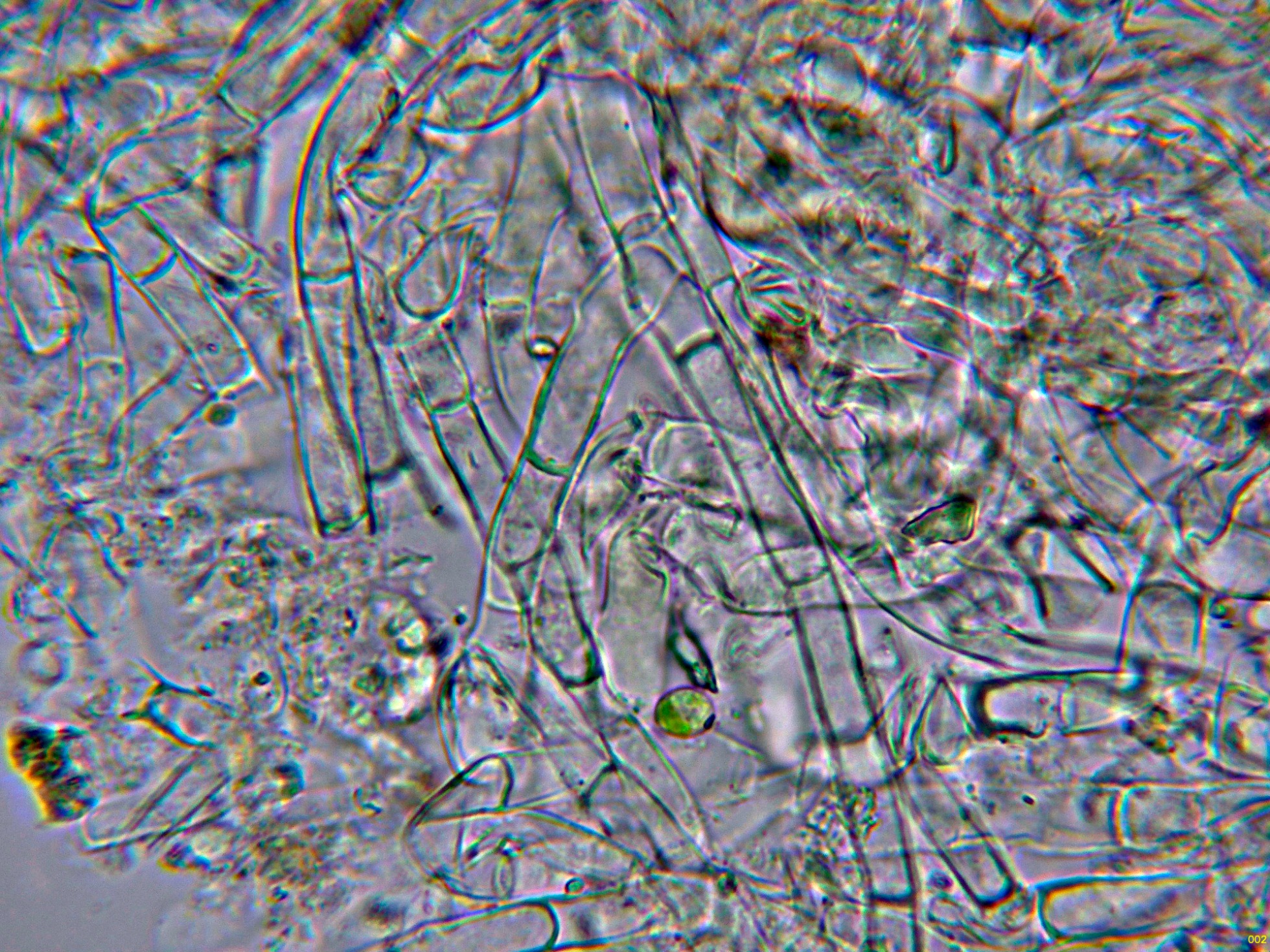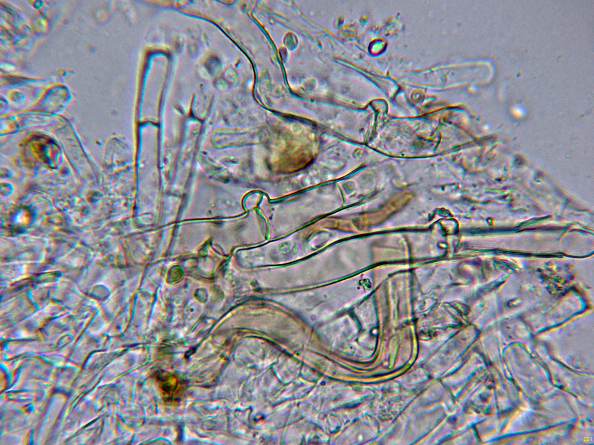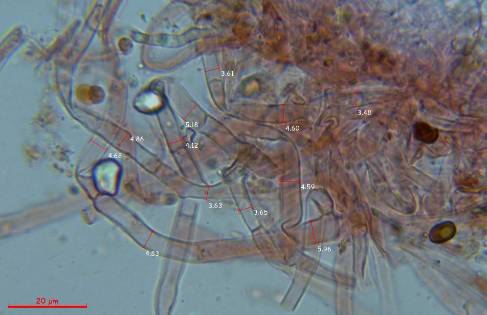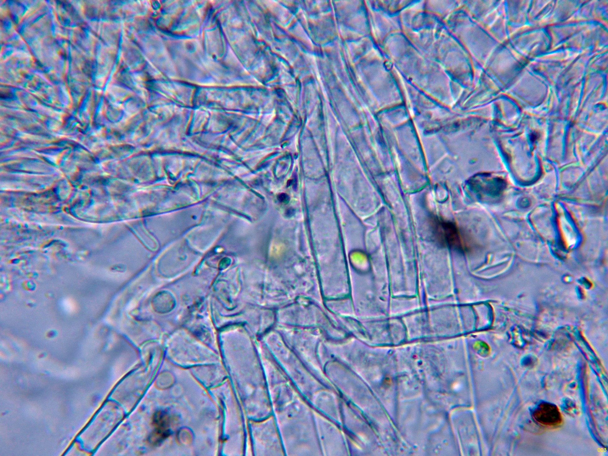D: Sistema hifal monomítico: hifas de paredes delgadas o engrosadas, hialinas, de 2 a 5 de ancho, septadas sin fíbulas, aunque se observan algunas raras fíbulas en las hifas del subículo.
