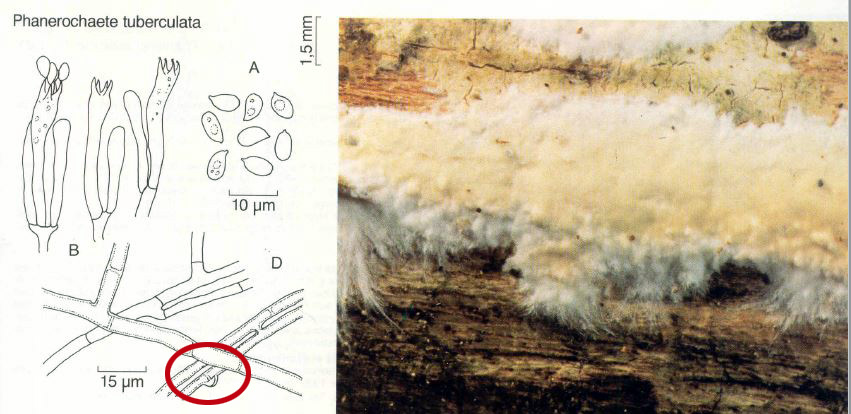 Aunque el género Efibula, tal y como su nombre nos indica hace referencia a la ausencia de fíbulas, según el criterio de Les Champignons de Suisse, la Phanerochaete tuberculata si que ocasionalmente podría presentar alguna que otra fíbula dispersa, añado un pantallazo de la microscopía de la misma fuente, remarcando este detalle.