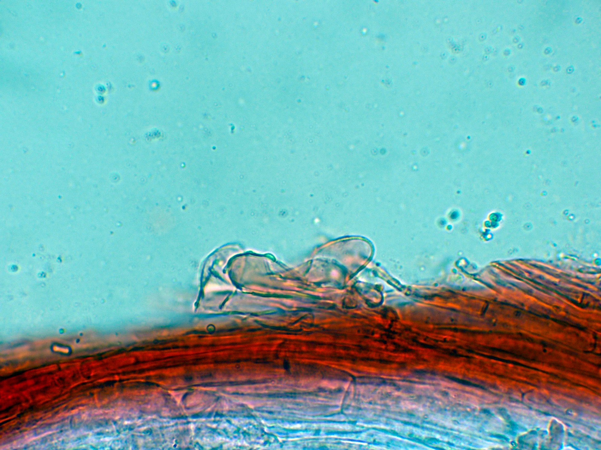 Caulocistidios muy escasos y solo observados de manera muy aislada en la parte alta del pie.