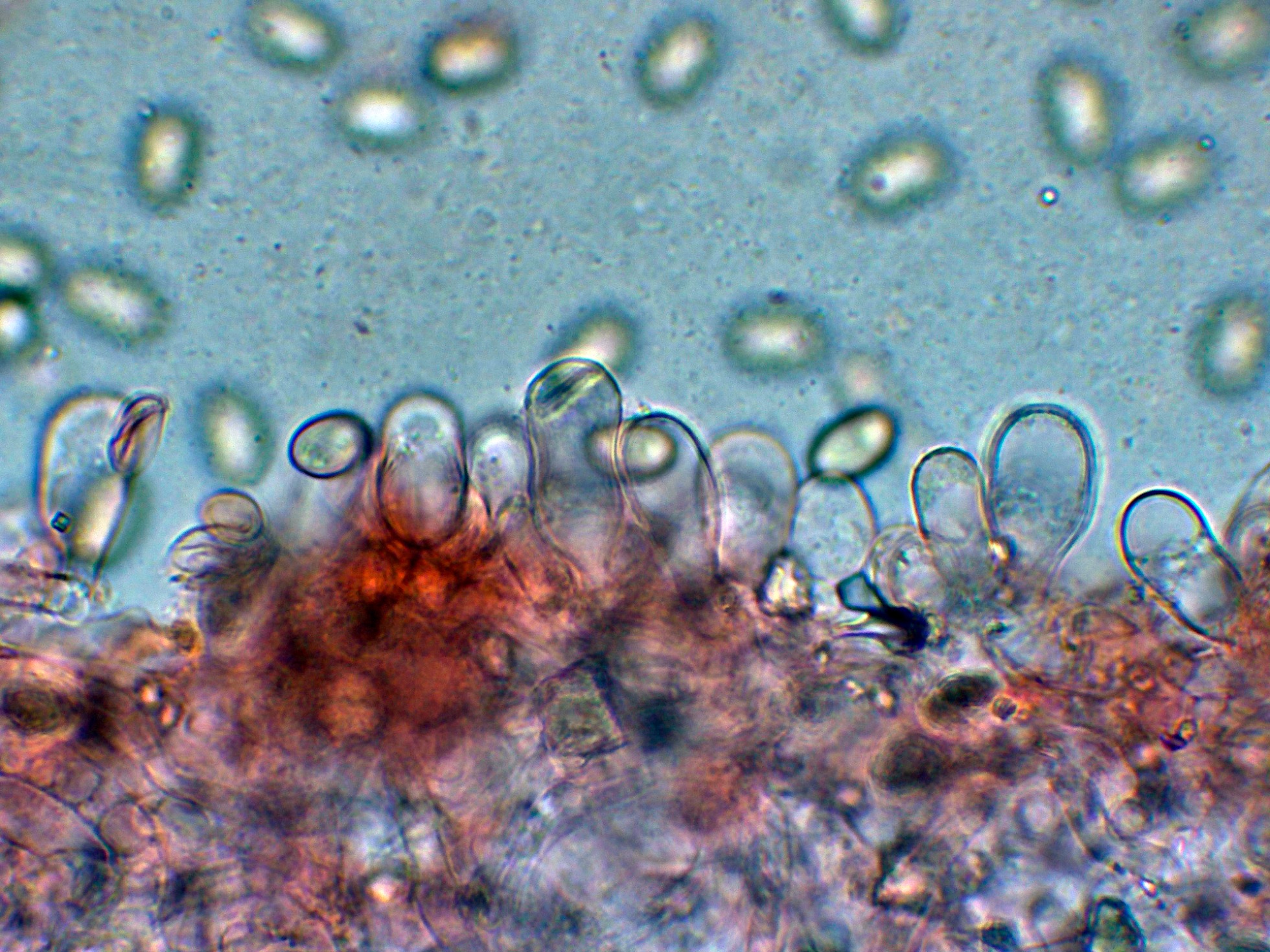 Queilocistidios entre cilíndricos y piriformes, algunos con un leve constreñimiento en su parte central, hialinos y con unas medidas de (15.5) 18.3 - 25.1 (26.5) × (8.8) 9.1 - 10.8 (11.8) µm.