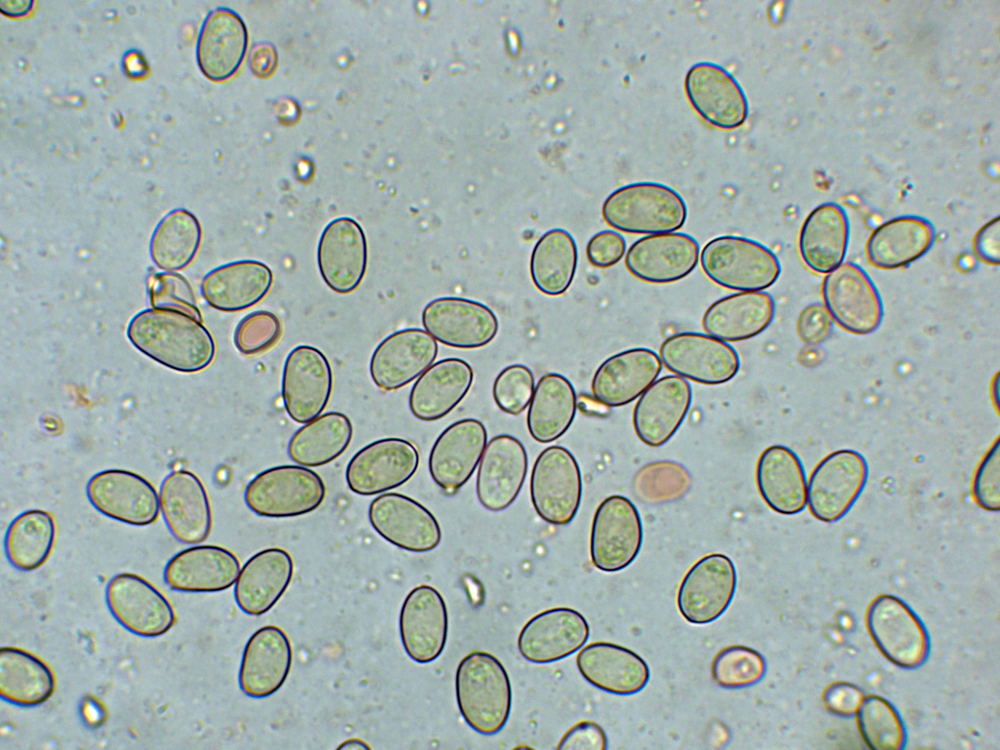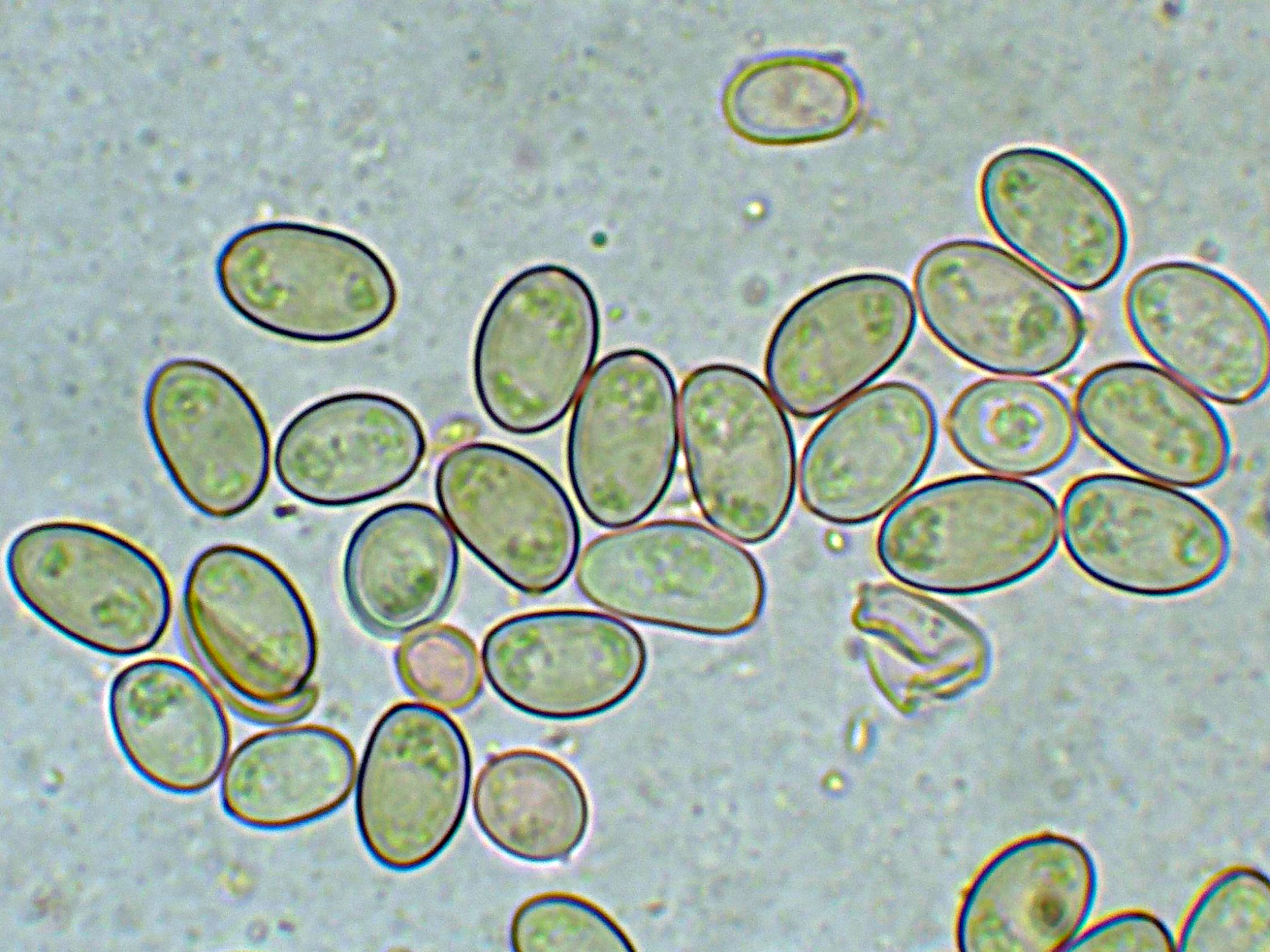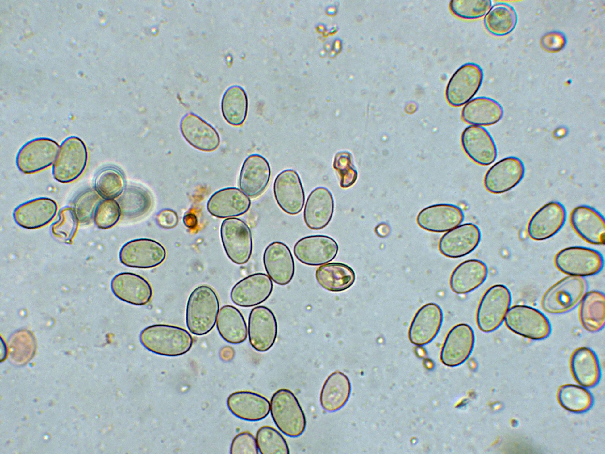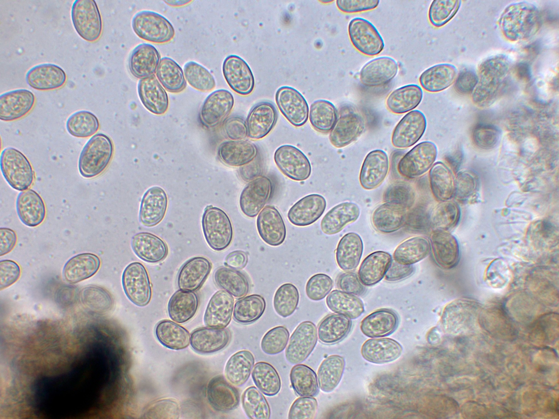 Las esporas elipsoidales, prácticamente sin pigmento, de pared gruesa y con tenues granulaciones en su interior.