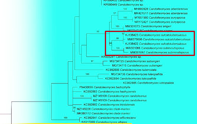 Con esporas poco pigmentadas deberíamos considerar la Candolleomyces sulcatotuberculosus, en este caso ya encajaría su aspecto con el sombrero sulcado, pero ya no las medidas esporales, ya que se citan unas medidas esporales para la Candolleomyces sulcatotuberculosus de (7.6)7.9–8.5(9) × (4.5)4.6–5.0(5.2) μm. muy por debajo de las medidas de este estudio, muy cercano a nivel molecular al Candolleomyces sulcatotuberculosus, tenemos el Cadolleomyces subminutisporus, este último con esporas de un tamaño ligeramente menor de (6,2)6,9–7,8(8,9) × (3,6)4,1–4,7(5,0) μm, añado una imágen de su posición dentro del género.