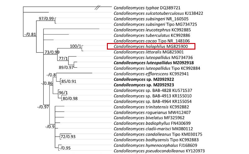 Tampoco puedo considerar la Candolleomyces halophilus ya que desde 2022 disponemos de una secuencia de la misma y no coincide molecularmente con mi propuesta.