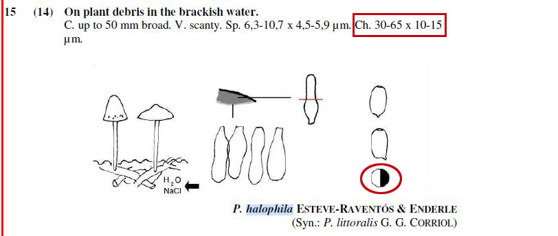 Utilizando las Claves de 2021 del género del documento "Two new rare species of Candolleomyces with pale spores from China", con esporas de hasta 11 micras y asociado a aguas salobres, me conducen a la Candolleomyces halophilus, la que no puedo ni tan siquiera considerar porqué en este caso debería presentar esporas medianamente pigmentadas, la Candolleomyces halophilus se la conocía como Psathyrella halophila, añado un pantallazo de las Claves de Andreas Melzer en el que se describen sus características.