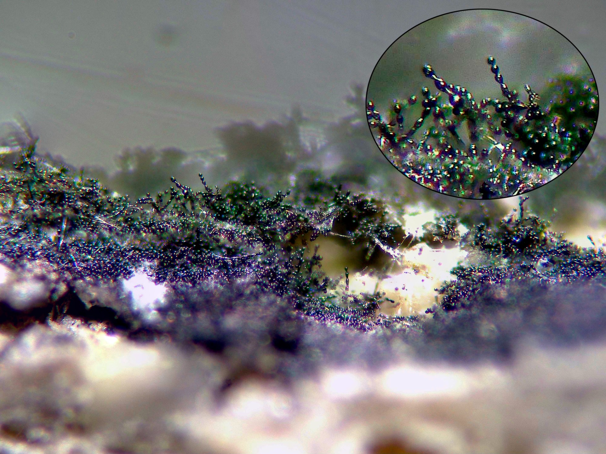 Fusionado a 100 aumentos, en la miniatura ya se intuyen bien las hifas conidiógenas con los conidios.