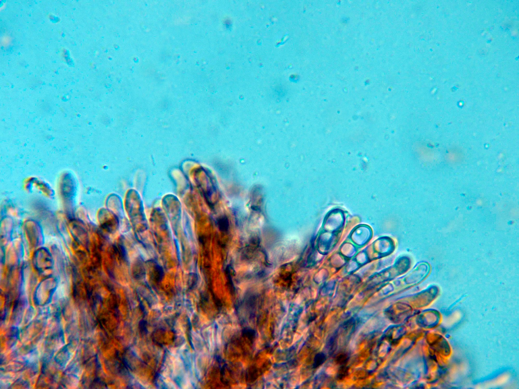 Observaciones: Las medidas esporales de este estudio entran bien dentro de las indicadas en las Claves de Bernicchia & Gorjon (2010), que atribuyen a la Hyphodermella rosae unas medidas para sus esporas de 5,5-8 x 3,5-6 µm., no obstante aunque la especie se describe como "sin cistidios", si que debería presentar unas hifas terminales con cristalizaciones no observadas en el presente estudio.