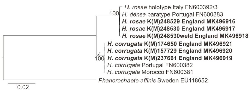 En base a estos estudios moleculares ambas especies (la Hyphodermella corrugata y la Hyphodermella rosae) se separan ambas de la Phanerochaete affinis, muy cercana a nivel molecular.