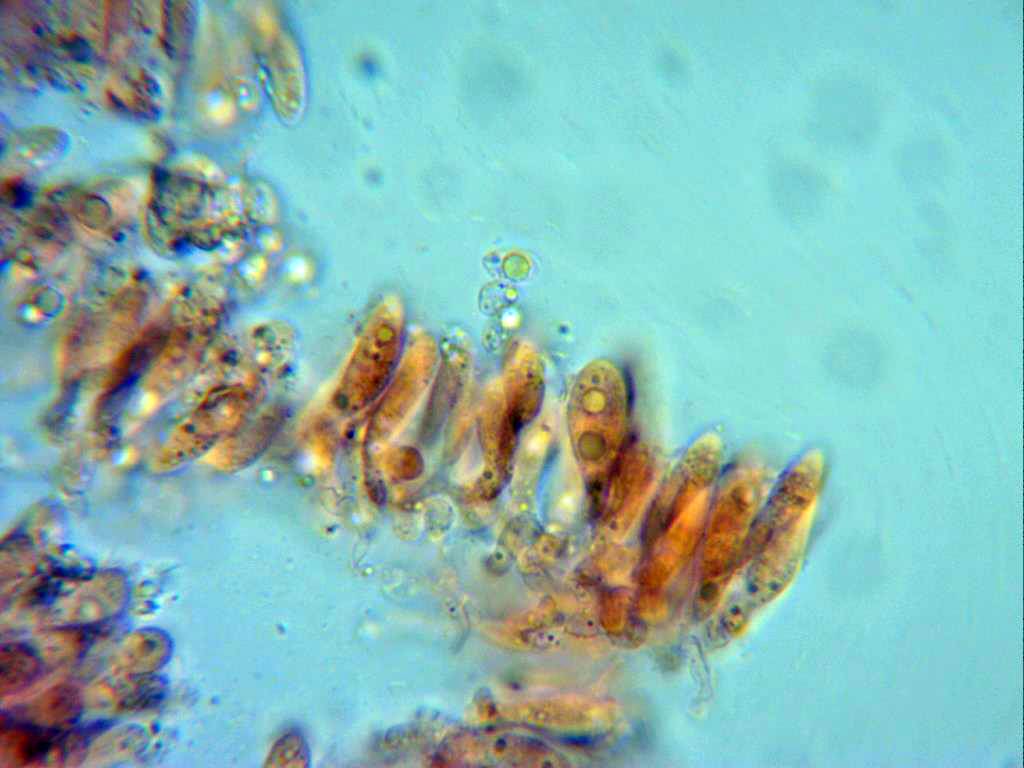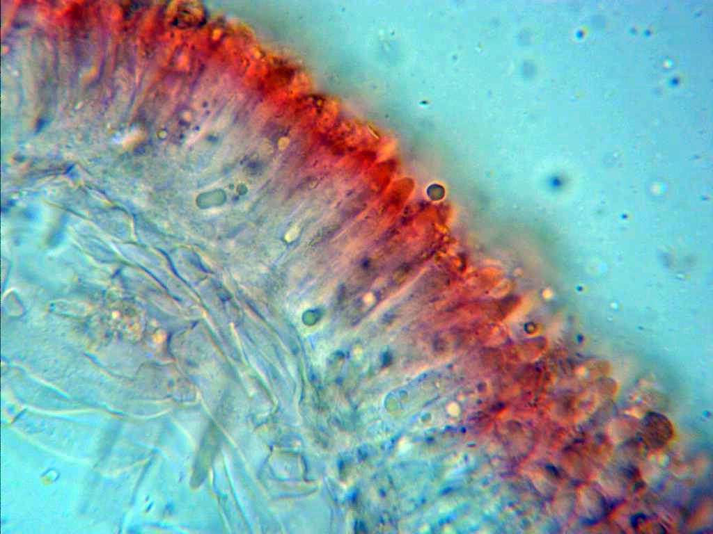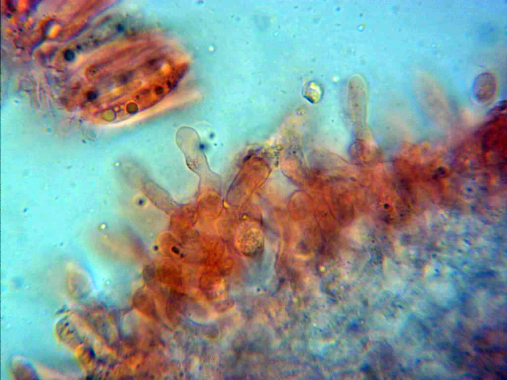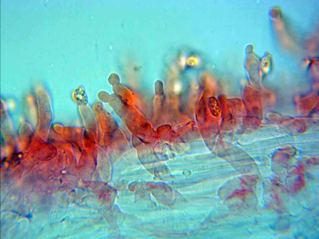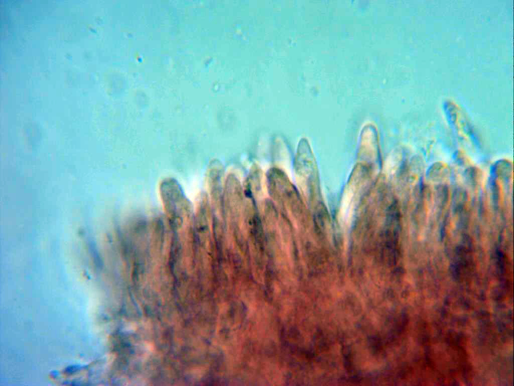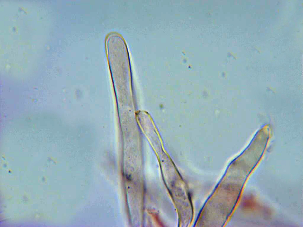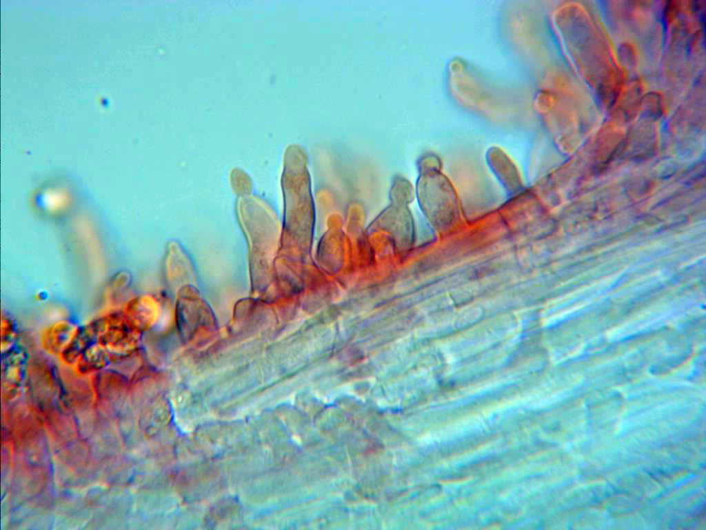 También observados de manera más dispersa algunos queilocistidios más cilíndricos y sinuosos.