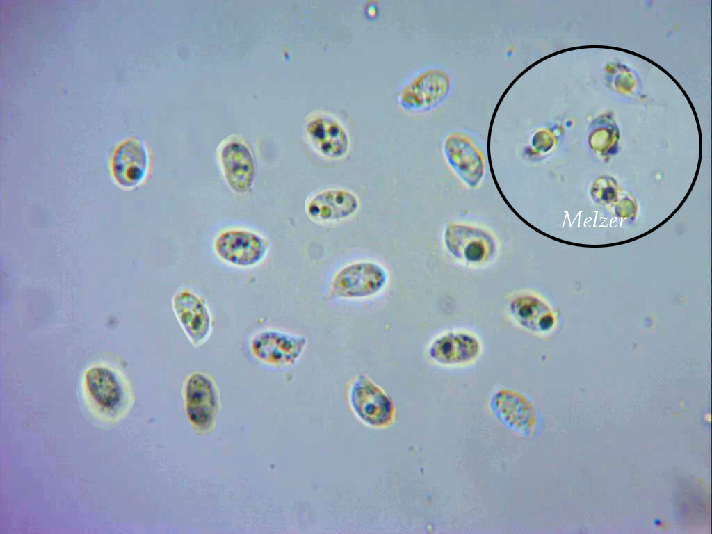 Las esporas libres en solución de amoníaco (NH4OH) y en la miniatura en Reactivo de Melzer con reacción amiloide.