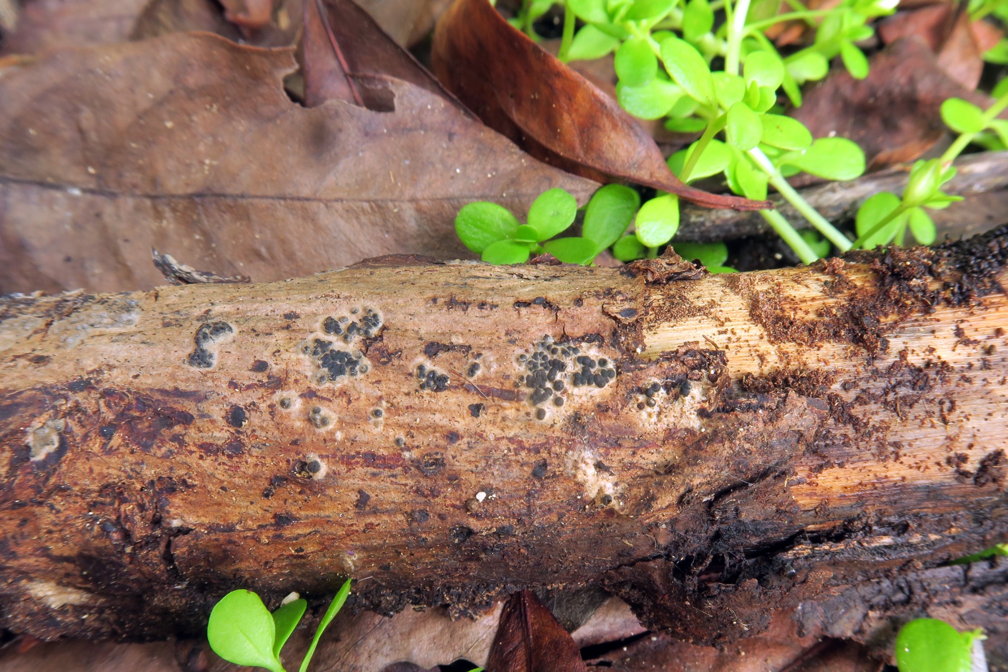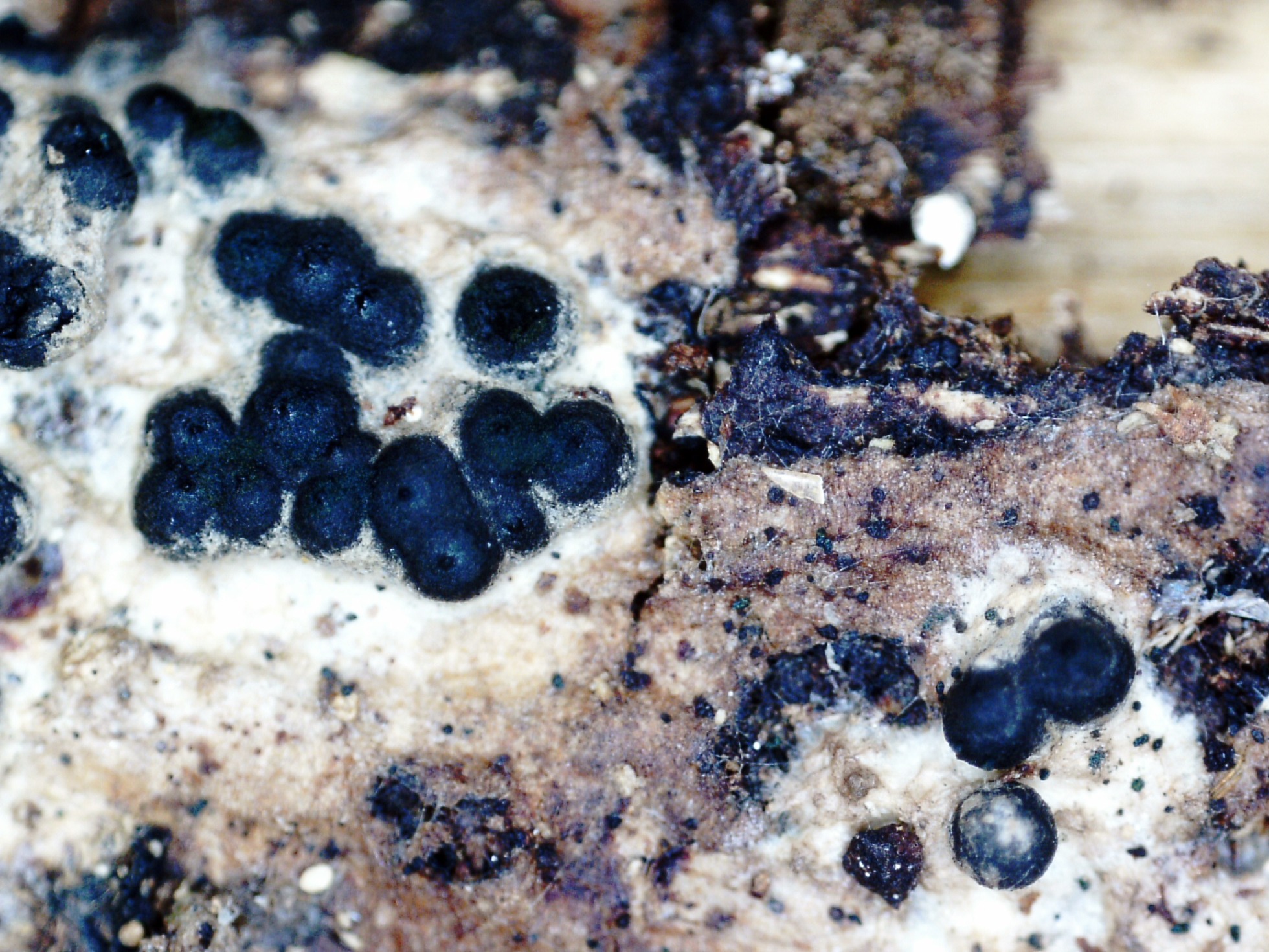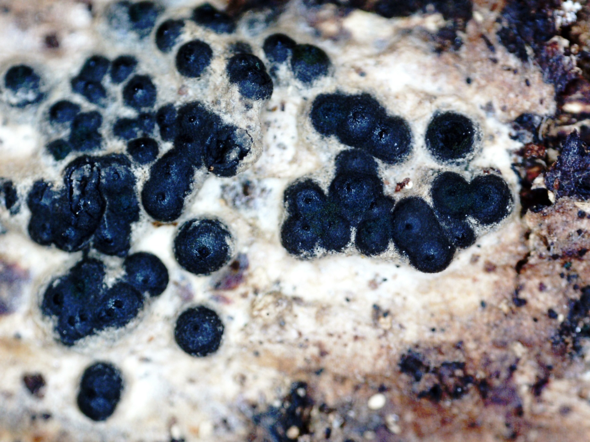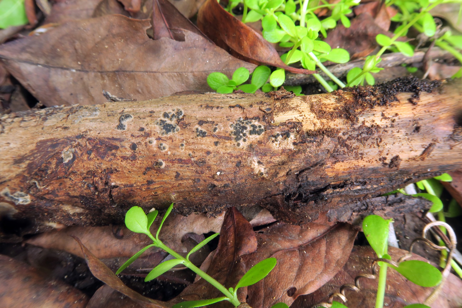Peritecios brotando de manera dispersa, con un subículo blanquecino en la zona afectada por el hongo.
