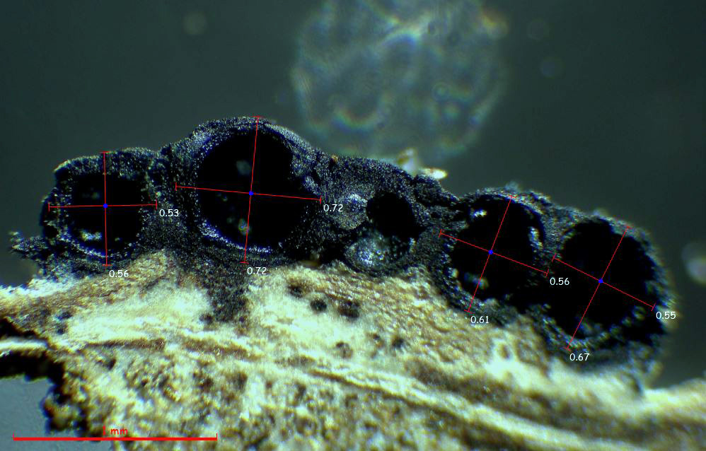 Peritecios globosos con unas medidas de 0,6 - 0,7 × (0,5) 0,53 - 0,7 mm.