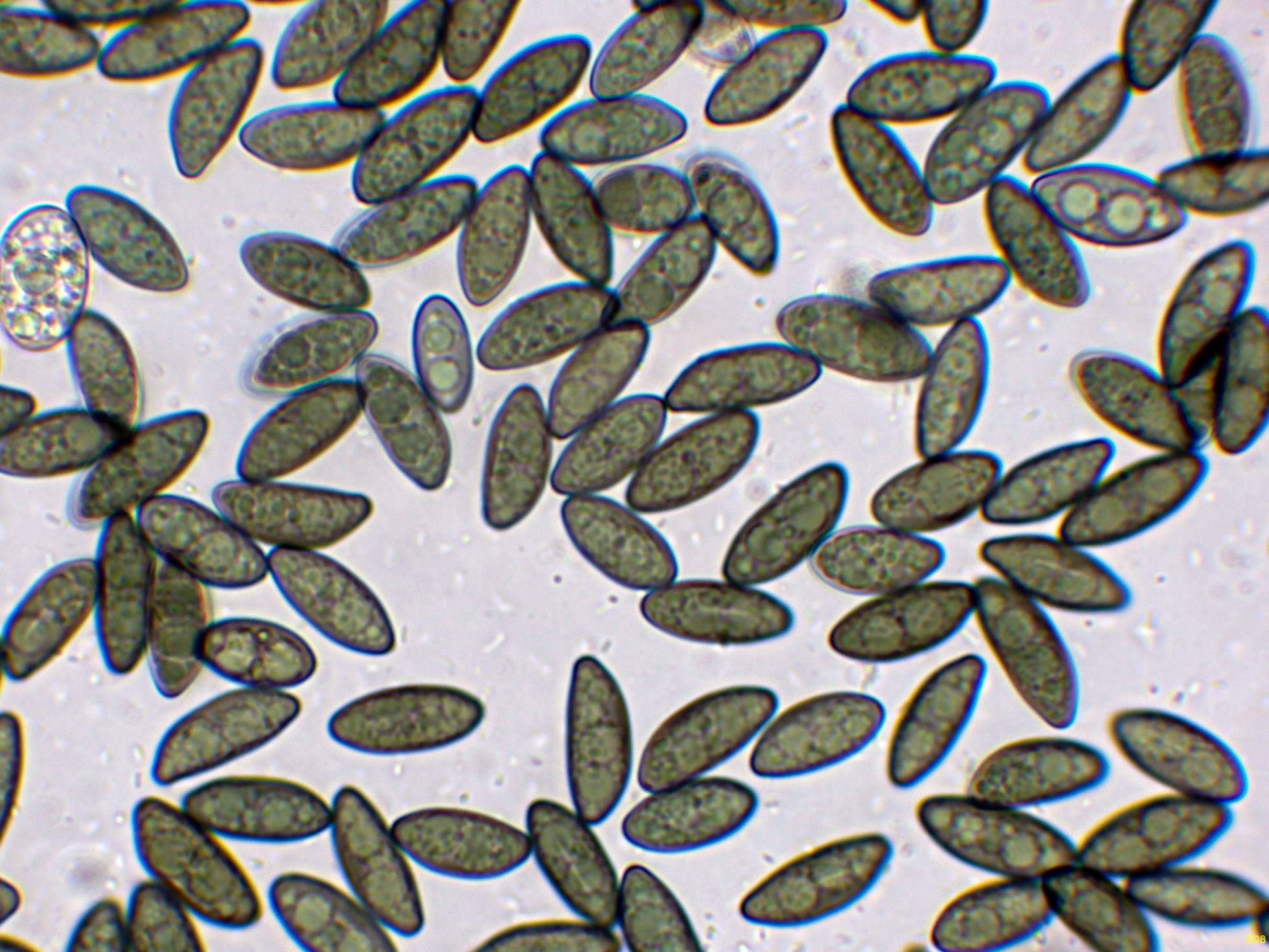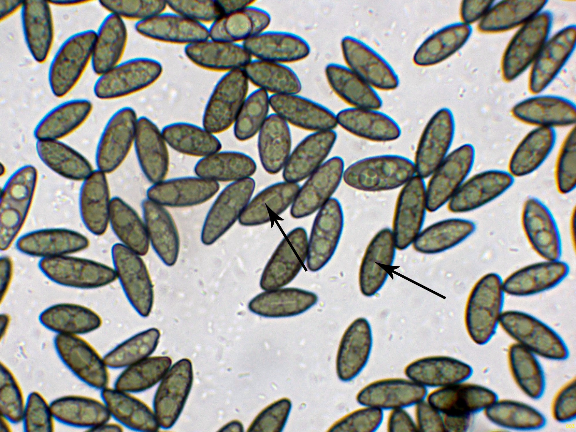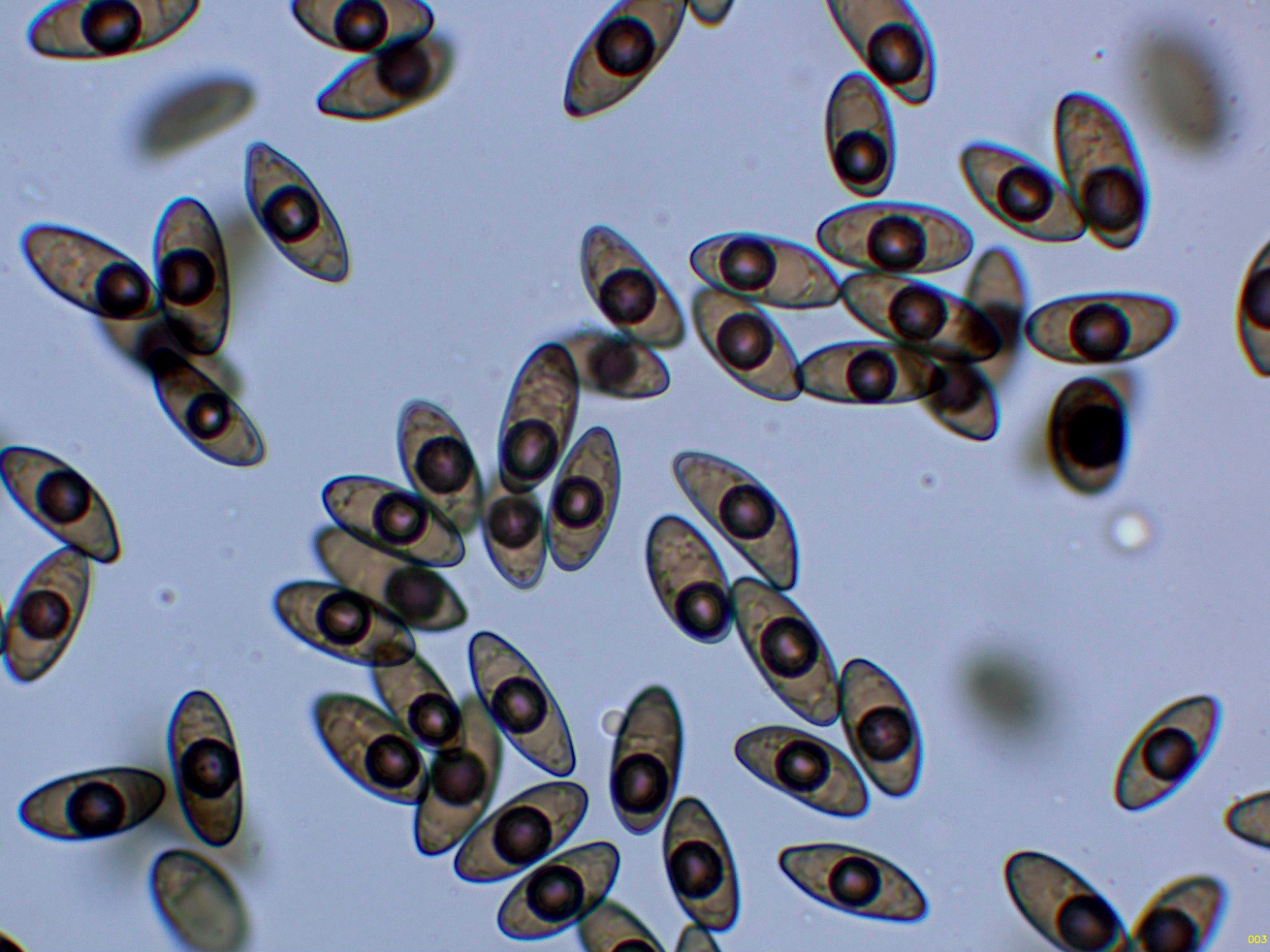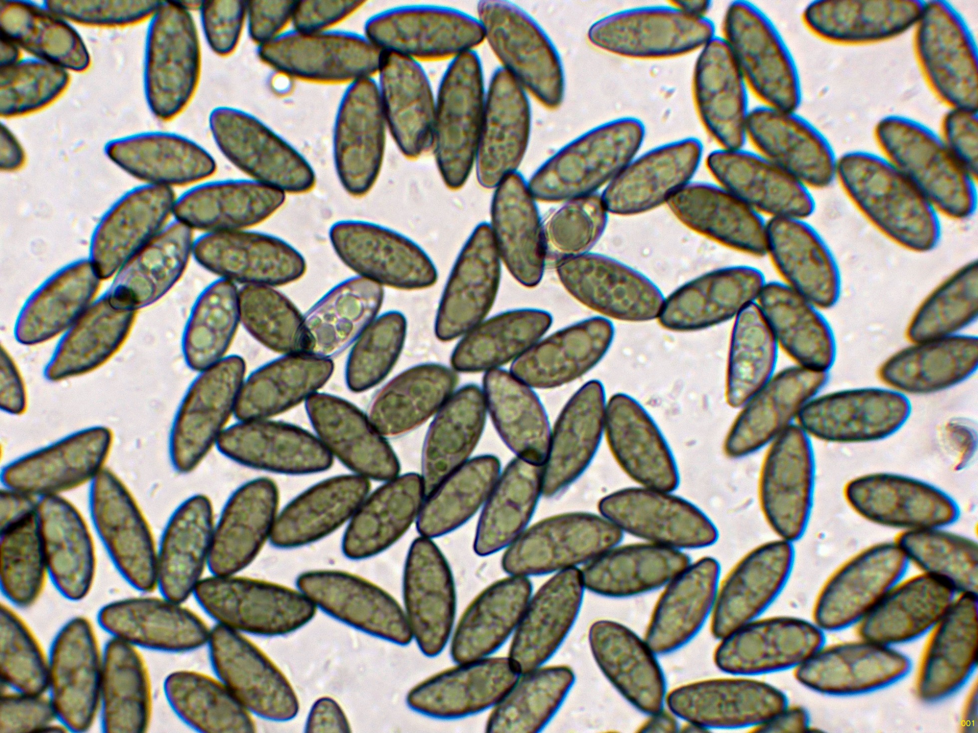 Ascosporas al microscopio en agua de color marrón verdoso claro, con una hendidura germinal recta que ne llega a ocupar ni la mitad de la longitud total de la espora, sin aparentemente ninguna vaina gelatinosa circundante, esta vaina no la pude observar ni utilizando Azul de Lactofenol.