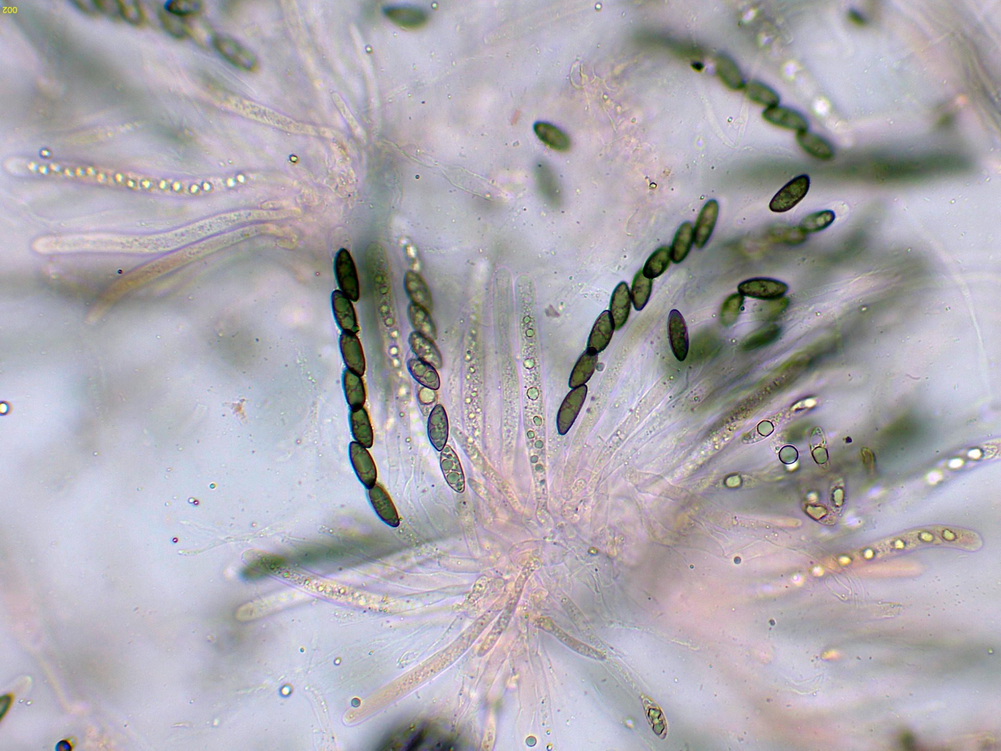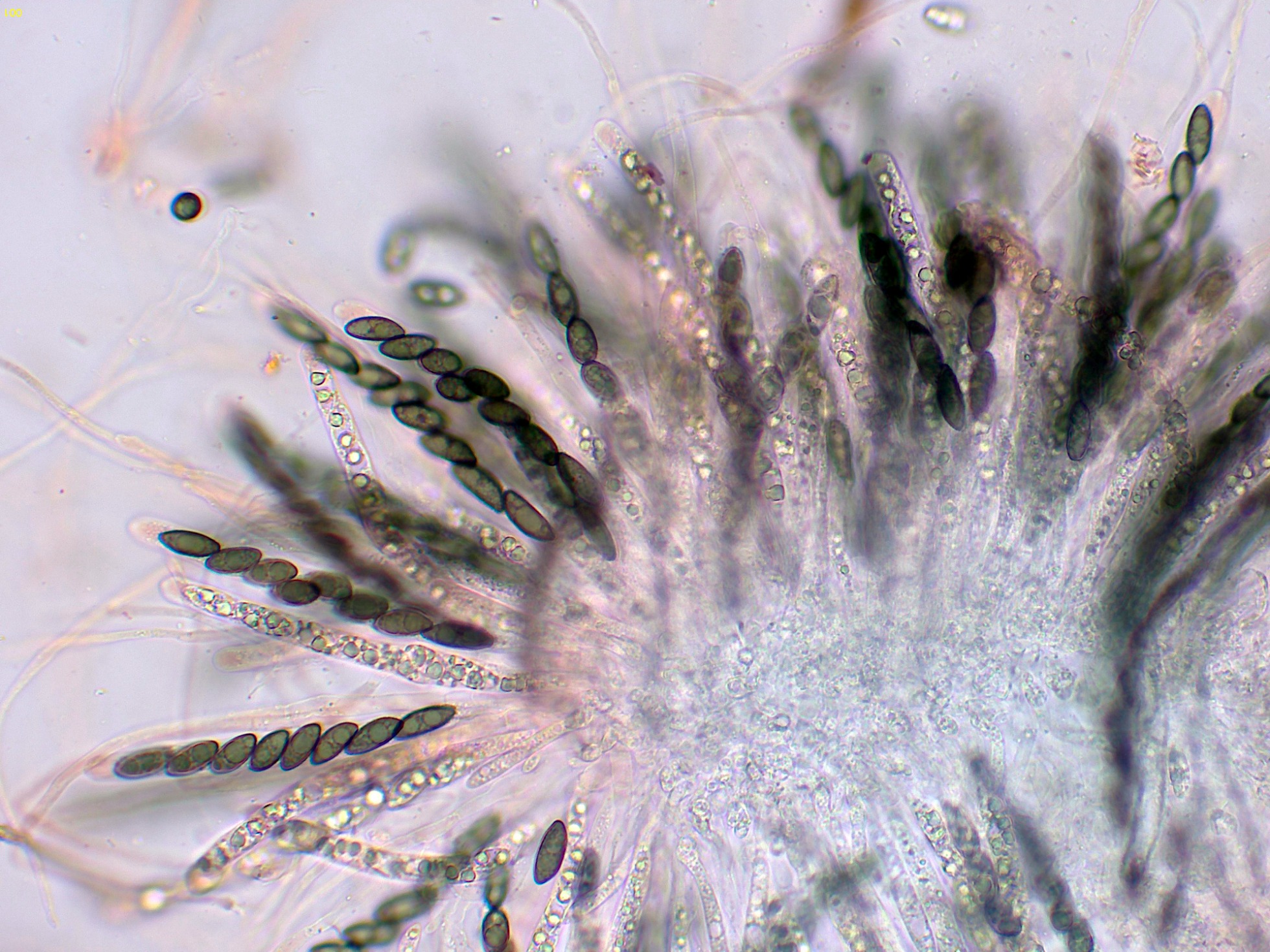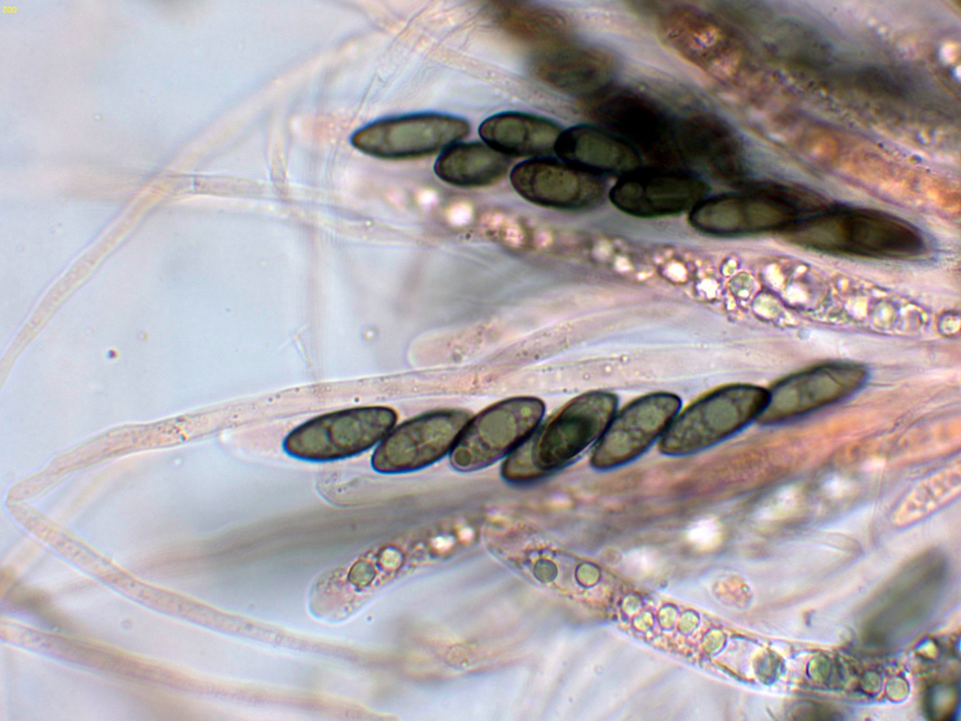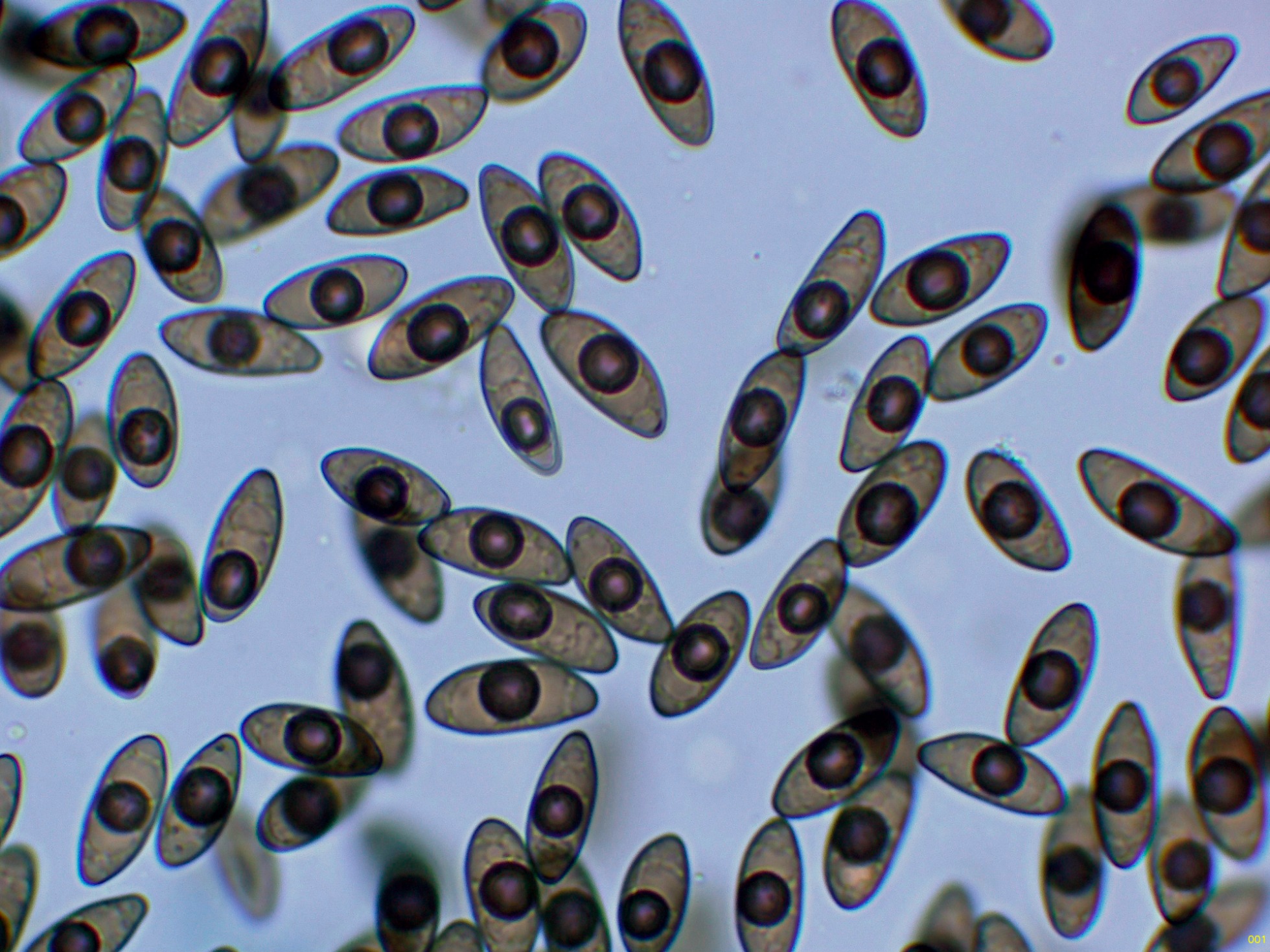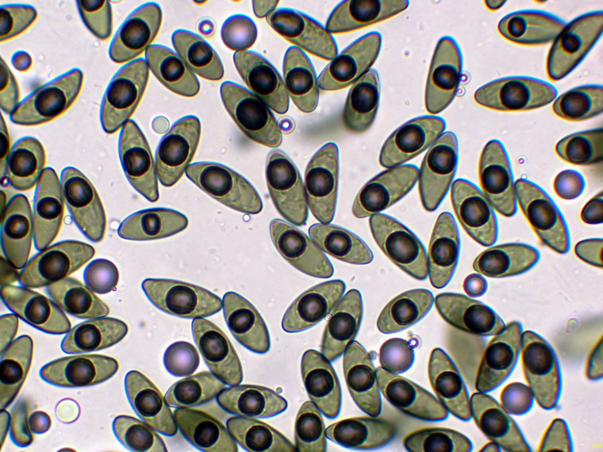 Ascosporas al microscopio en agua de color marrón verdoso claro, con una hendidura germinal recta que ne llega a ocupar ni la mitad de la longitud total de la espora, sin aparentemente ninguna vaina gelatinosa circundante, esta vaina no la pude observar ni utilizando Azul de Lactofenol.