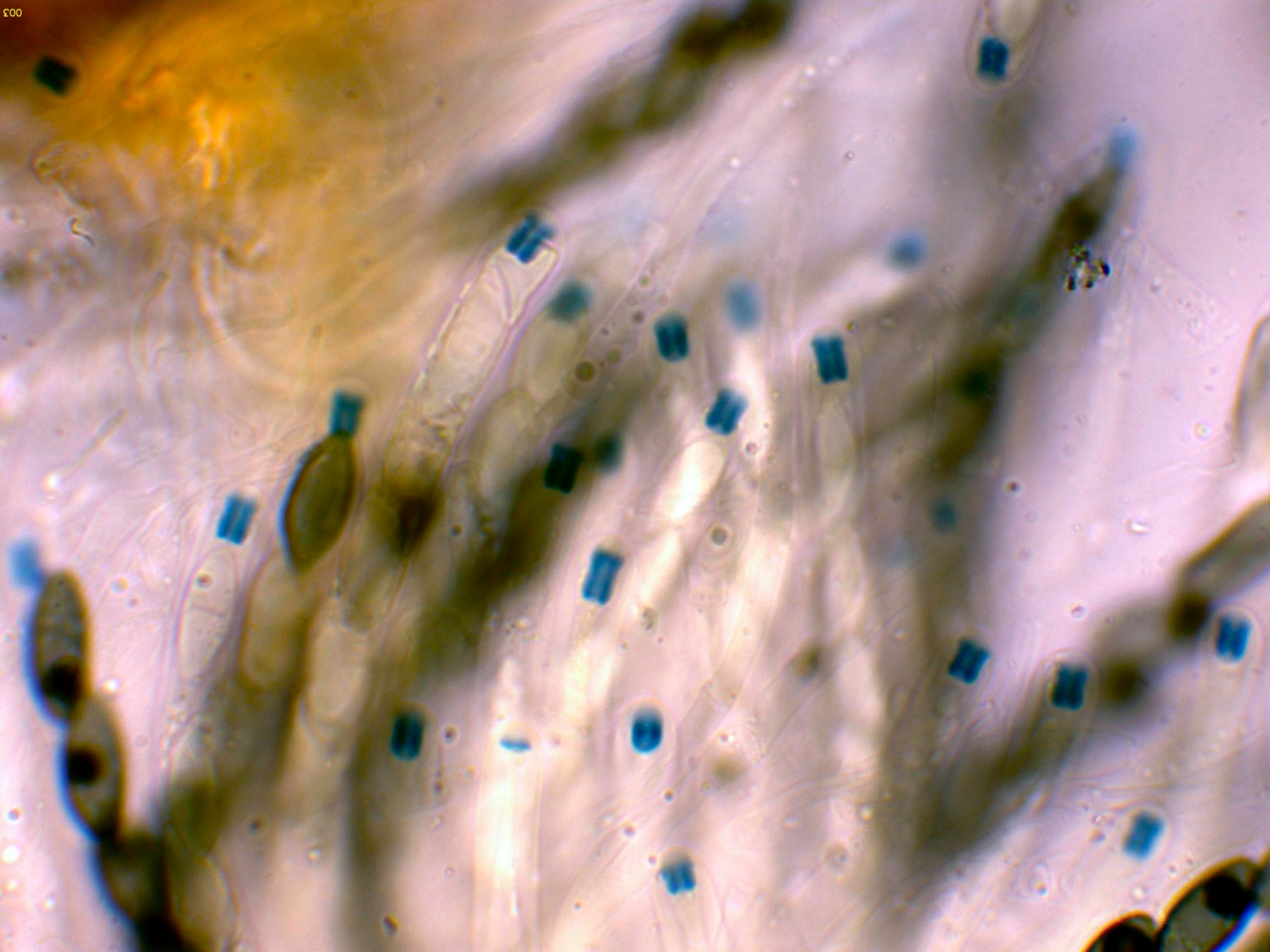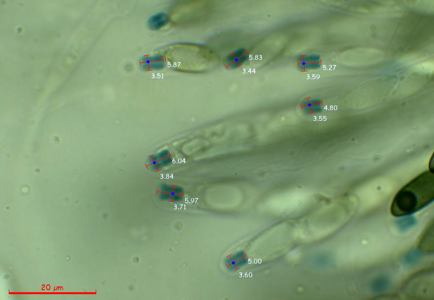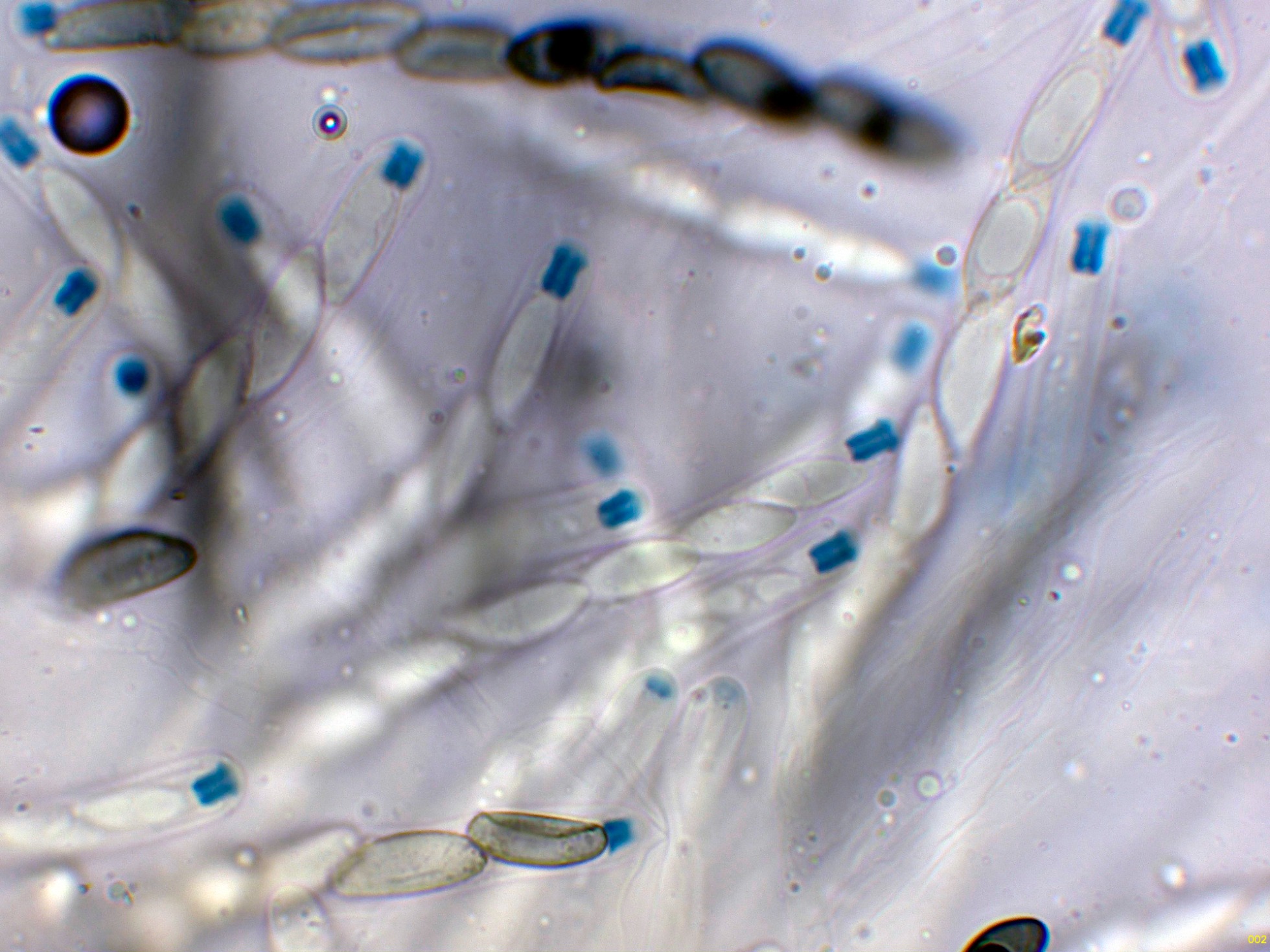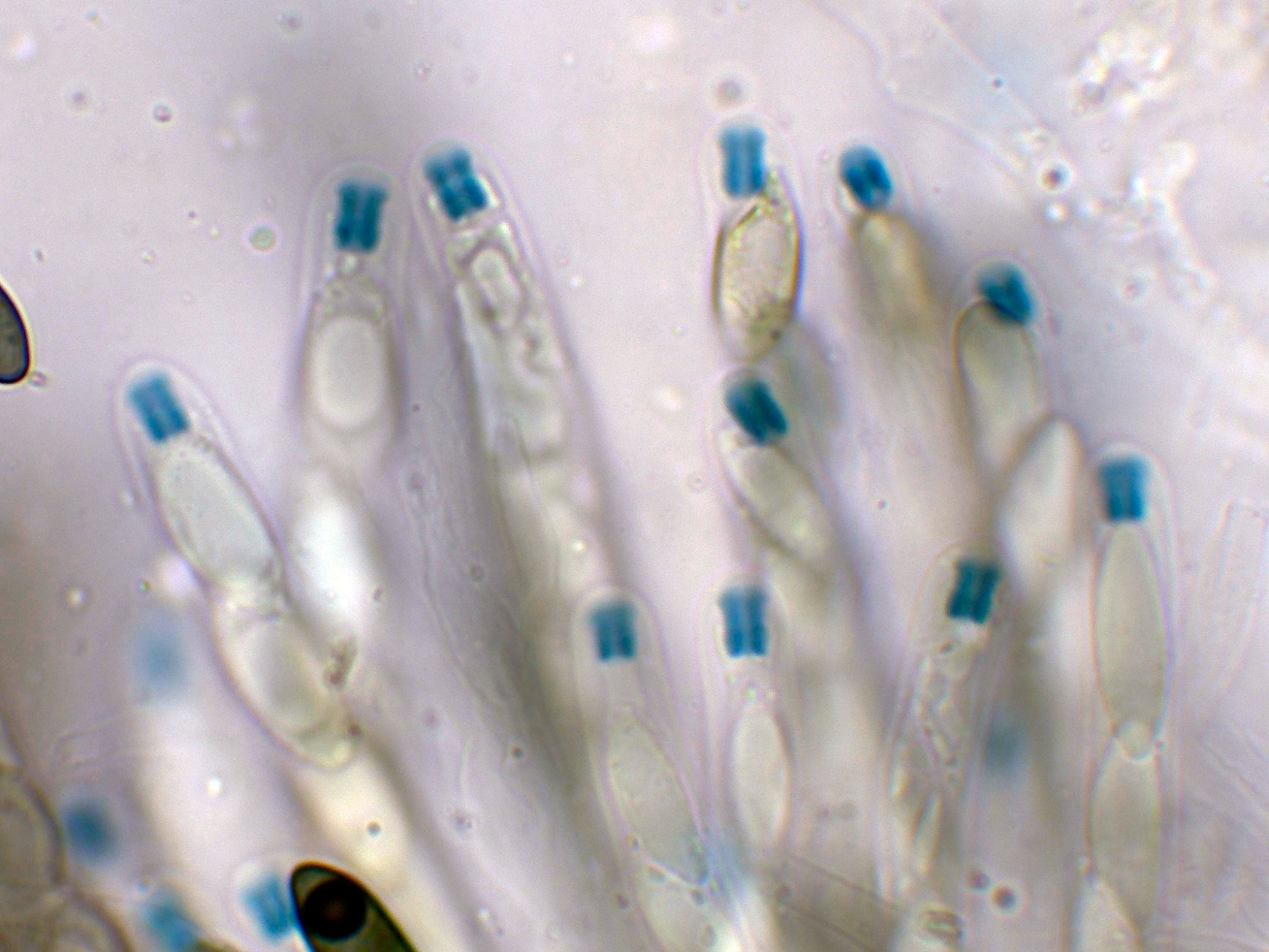 Ascos octospóricos, con aparato apical amiloide al Melzer y unas medidas de este aparato de (4.3) 4.8 - 5.9 (6) × (2.9) 3.1 - 3.8 (4) µm.