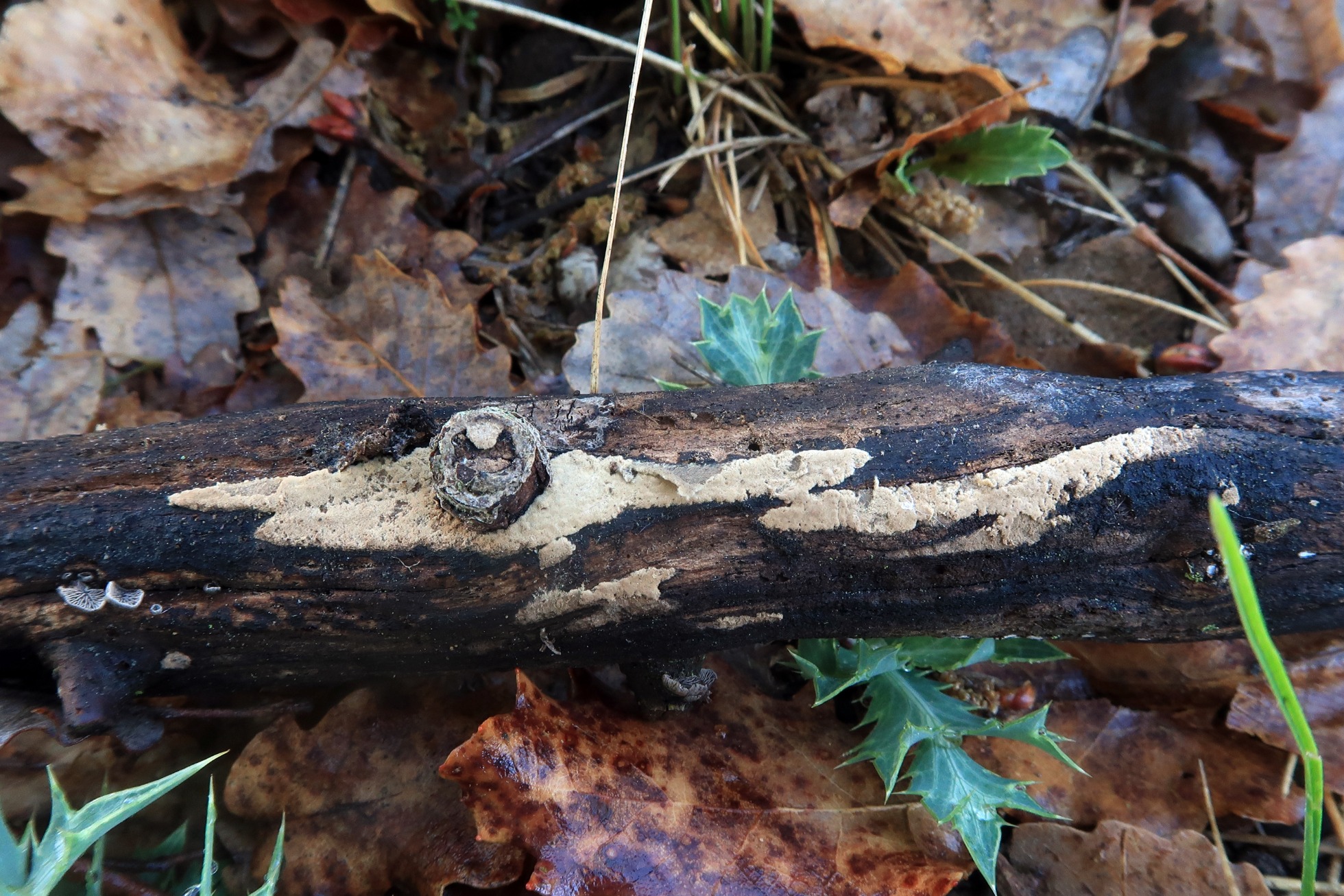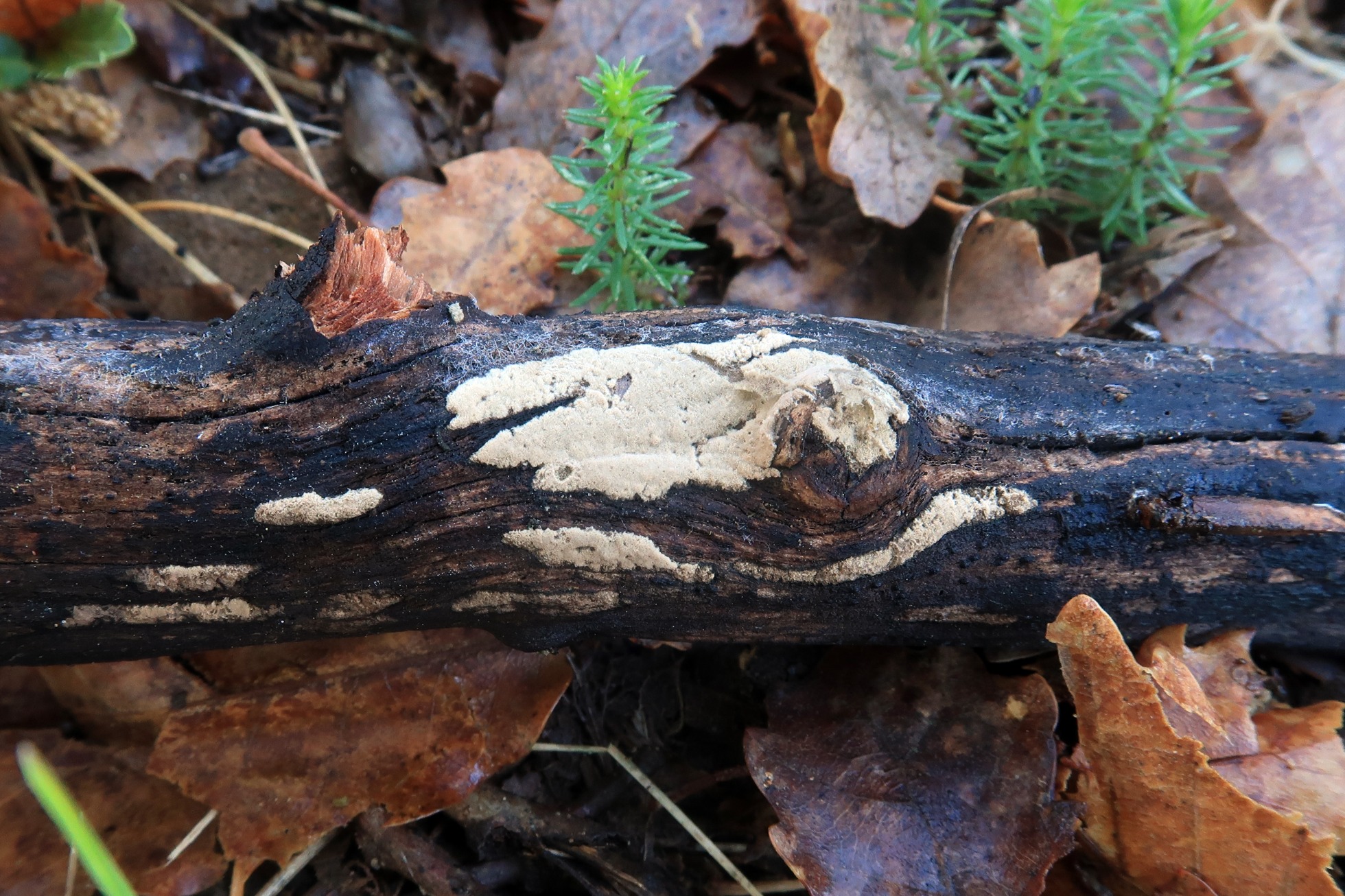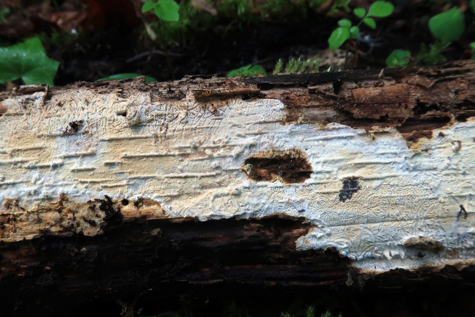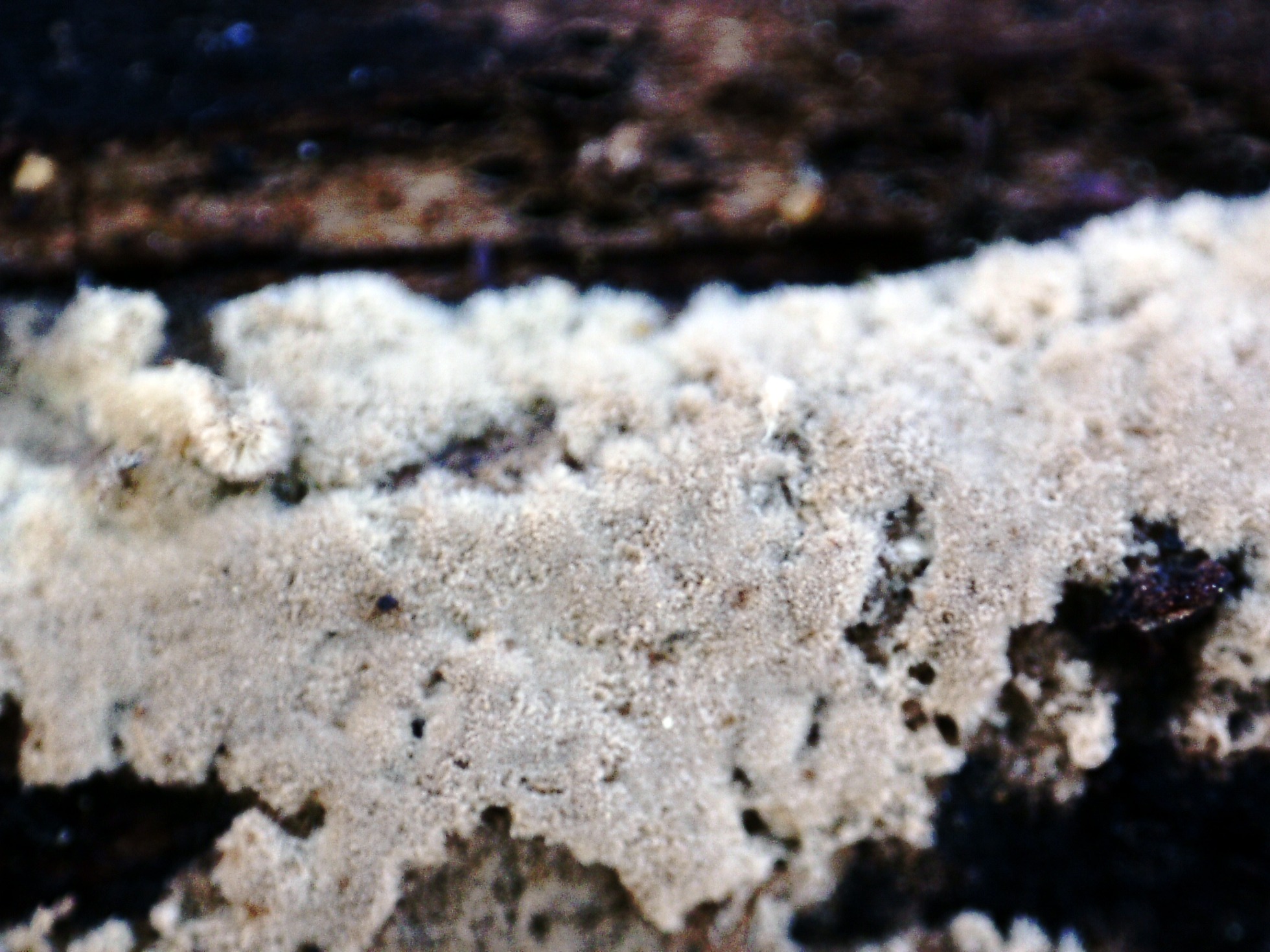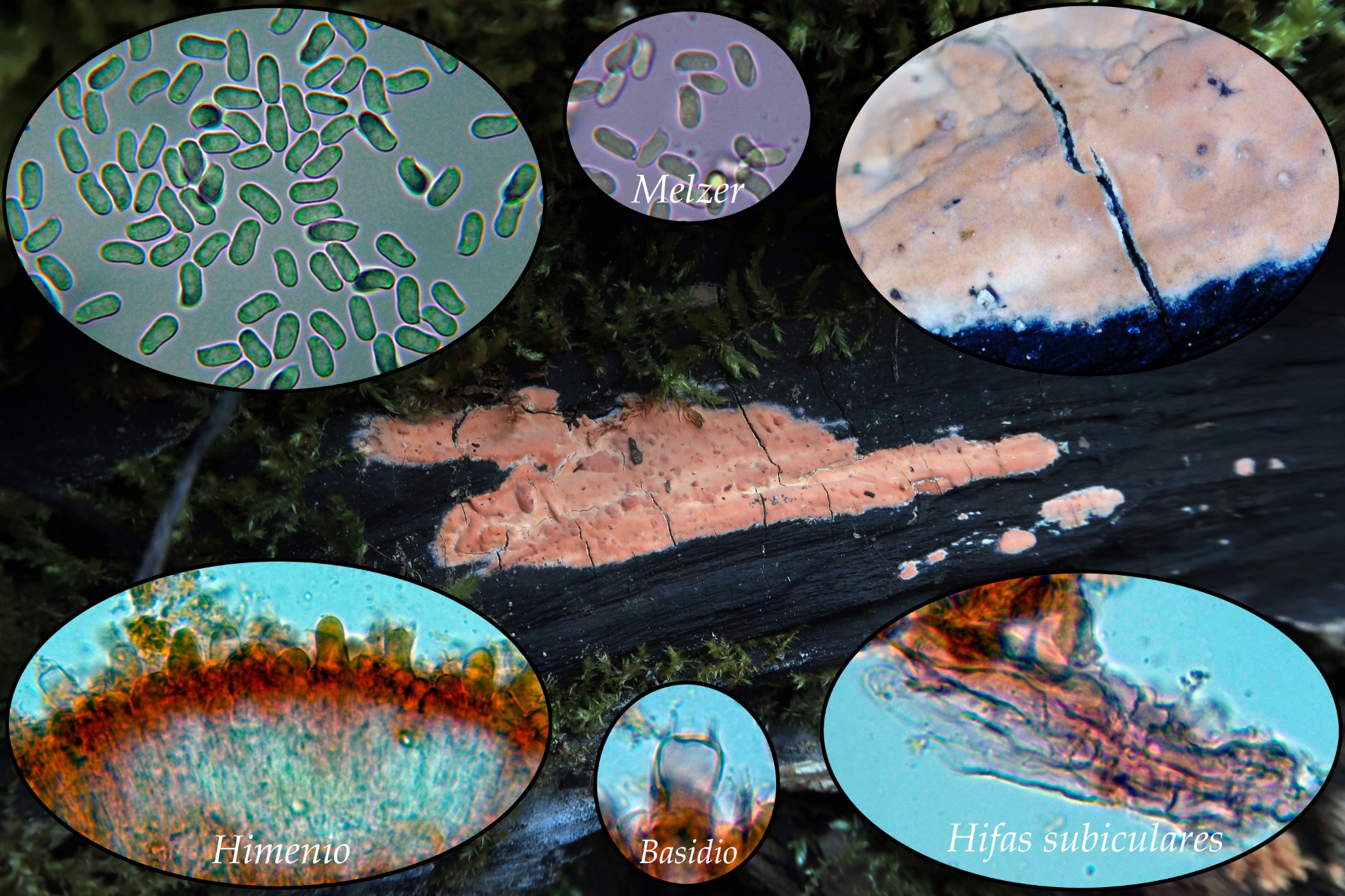 Otro Corticial, este del pasado 16 de abril, por la ausencia total de cistidios no consideré una posible Peniophora, el análisis molecular del gen ITS determinó que se trataba con una coincidencia del 100% de Peniophora incarnata MH860006, quizás una variedad acistidiata.