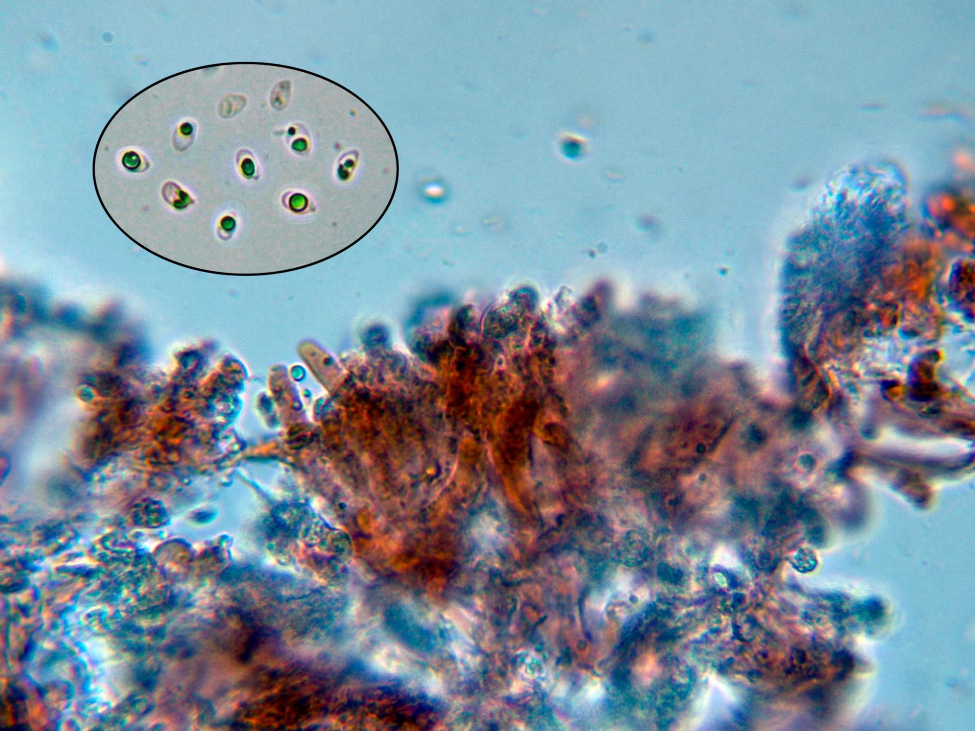 Y por último los basidios y las pocas esporas observadas, estas esporas con unas medidas de (4.3) 4.5 - 5 (5.1) × (2.5) 2.55 - 3.2 (3.4) µm.