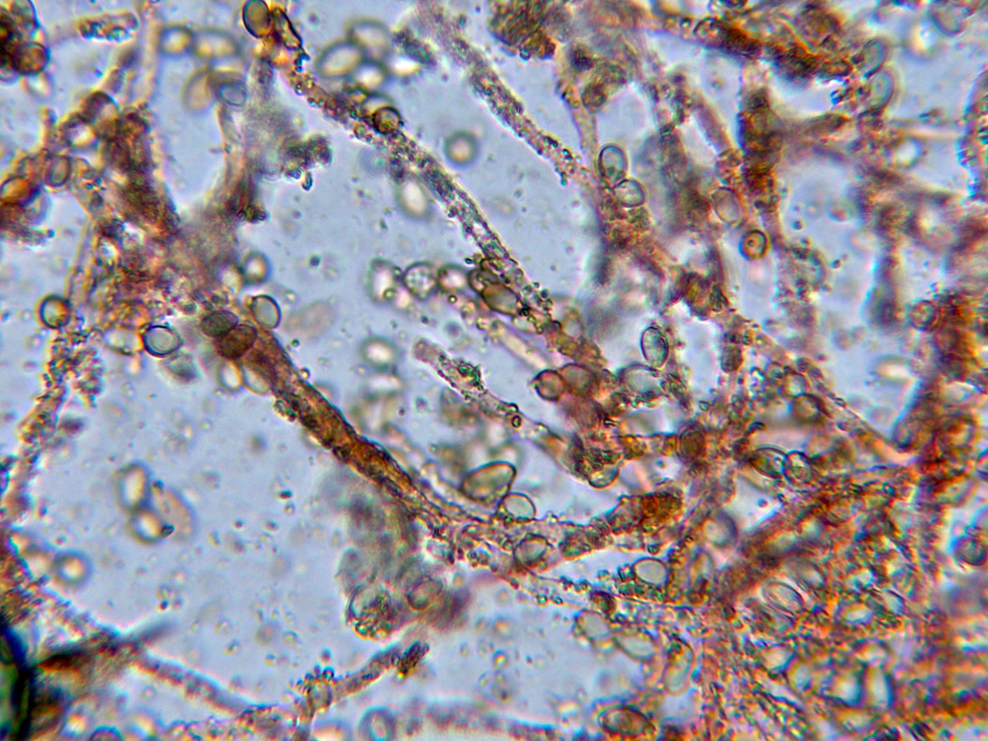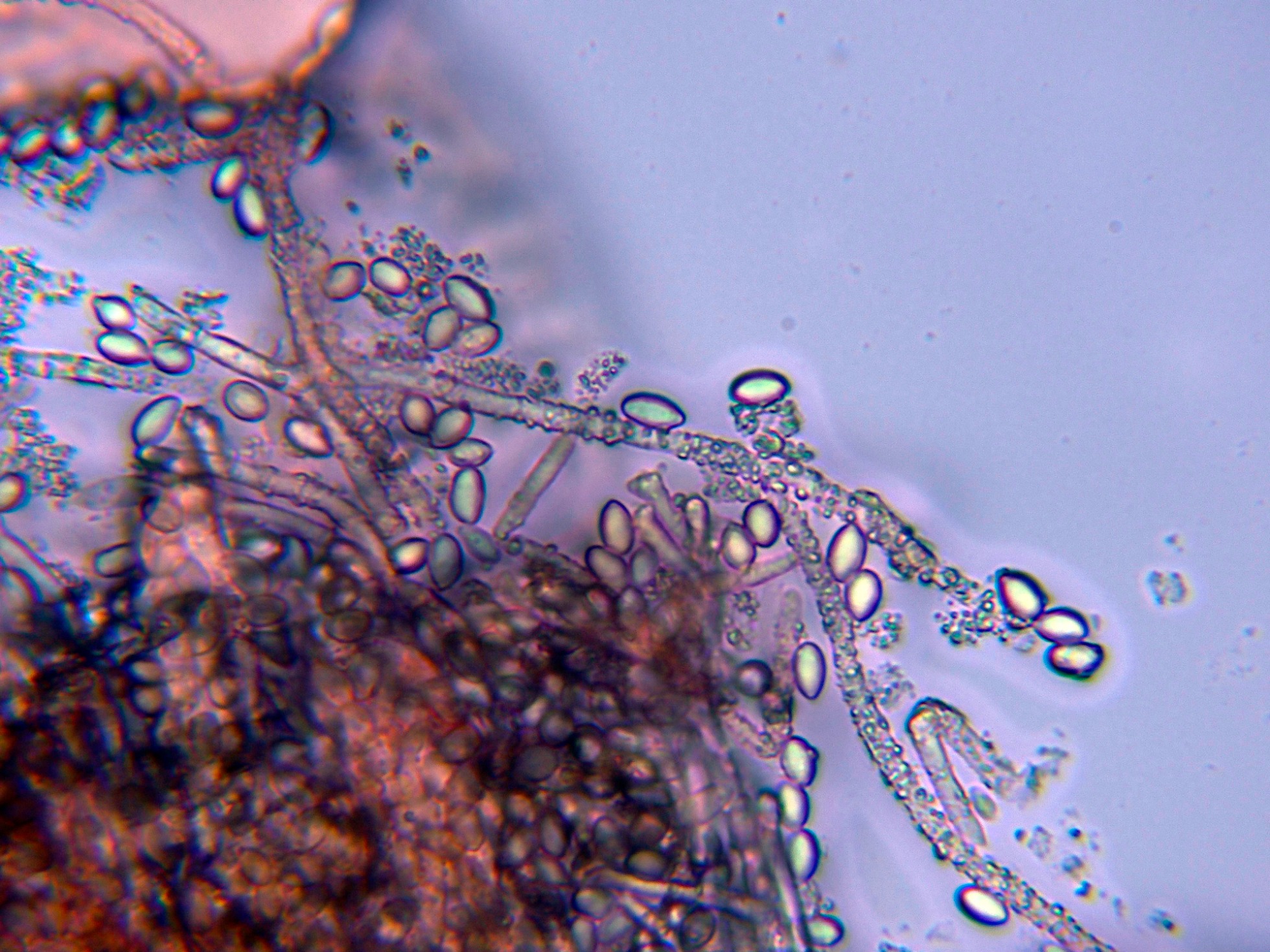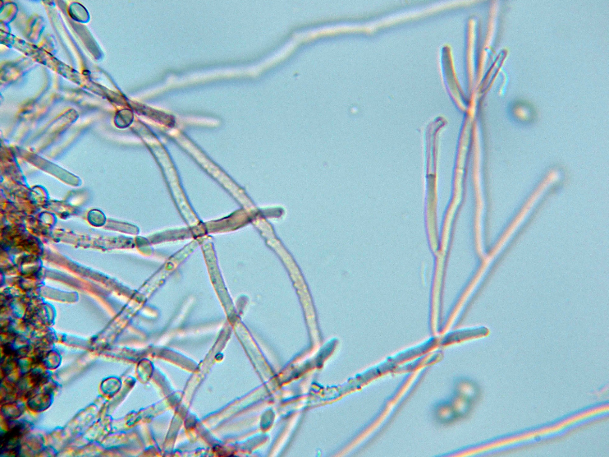 La microscopía con estos conidios truncados y el ápice hialino parece apuntar a alguna especie del clado Helminthosporium / Sporidesmium