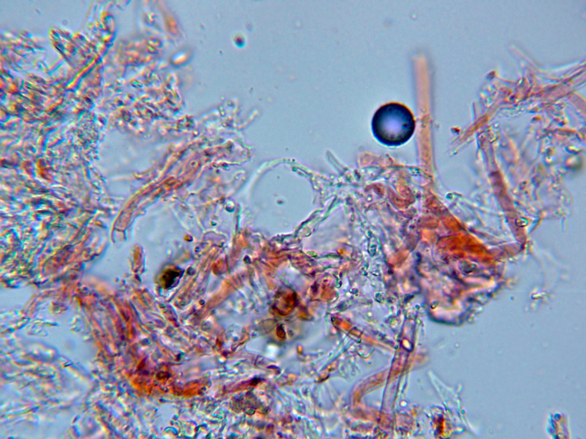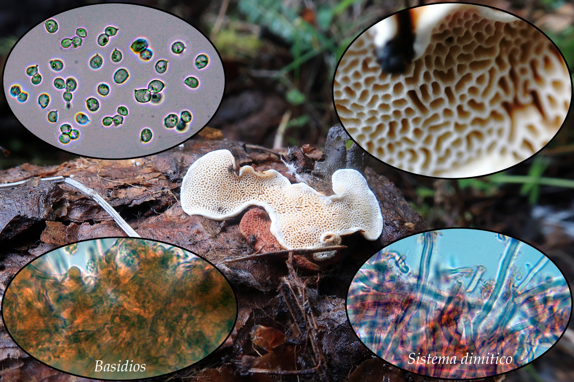 Un Polyporal poroide, este del 14 de mayo, aunque solo lo había estudiado en una ocasión, no me explico el porqué no lo reconocí (la morfología de sus esporas dice mucho), el análisis molecular determinó que se trataba con una coincidencia del 100% de Heterobasidion parviporum MT406379, H. annosum MK395162