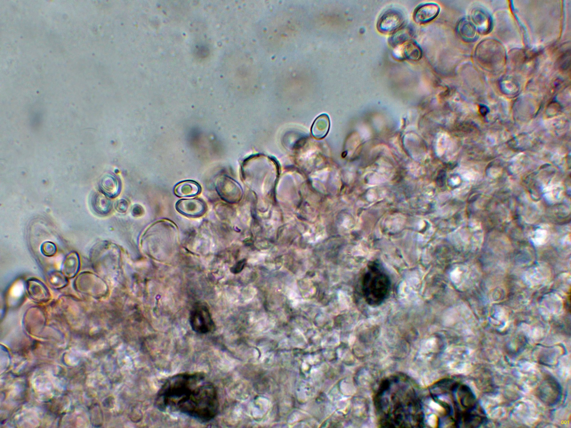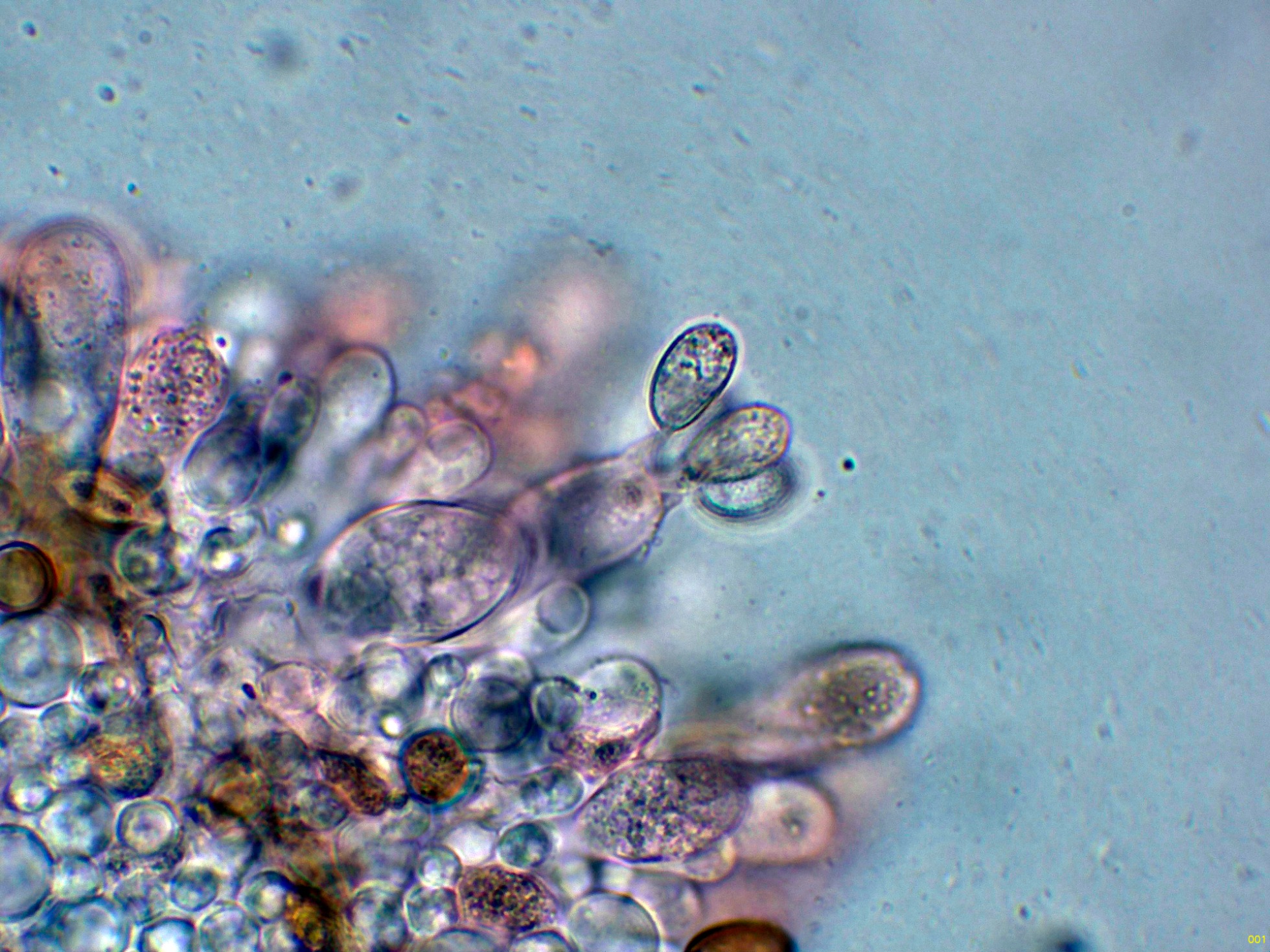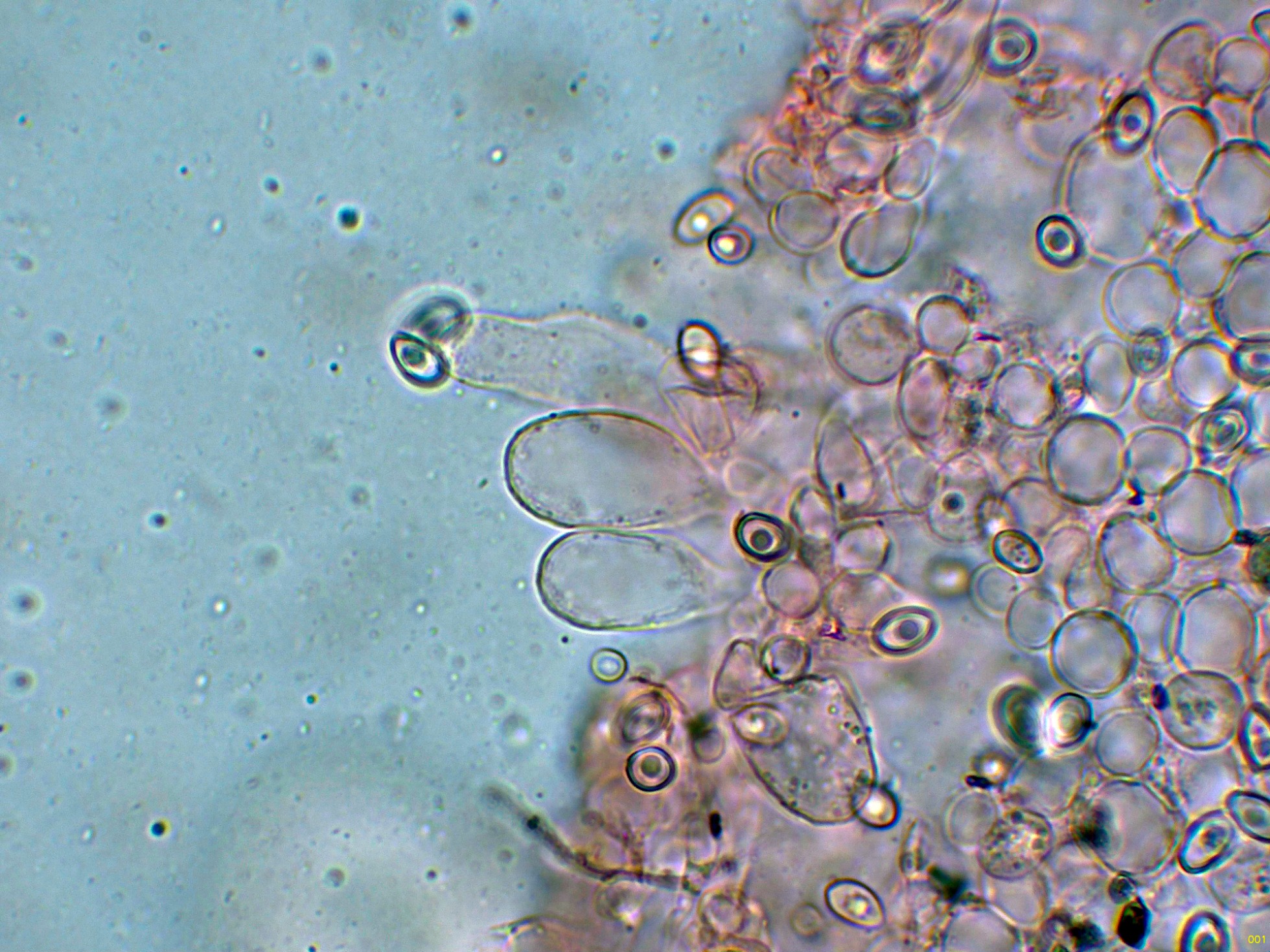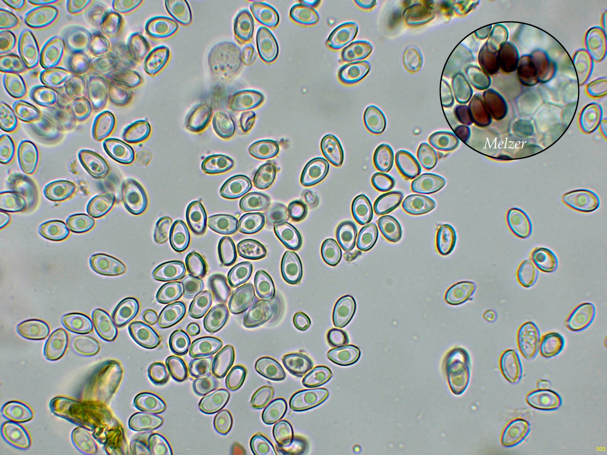 Y sus esporas, en la miniatura en Reactivo de Melzer con reacción fuertemente dextrinoide.