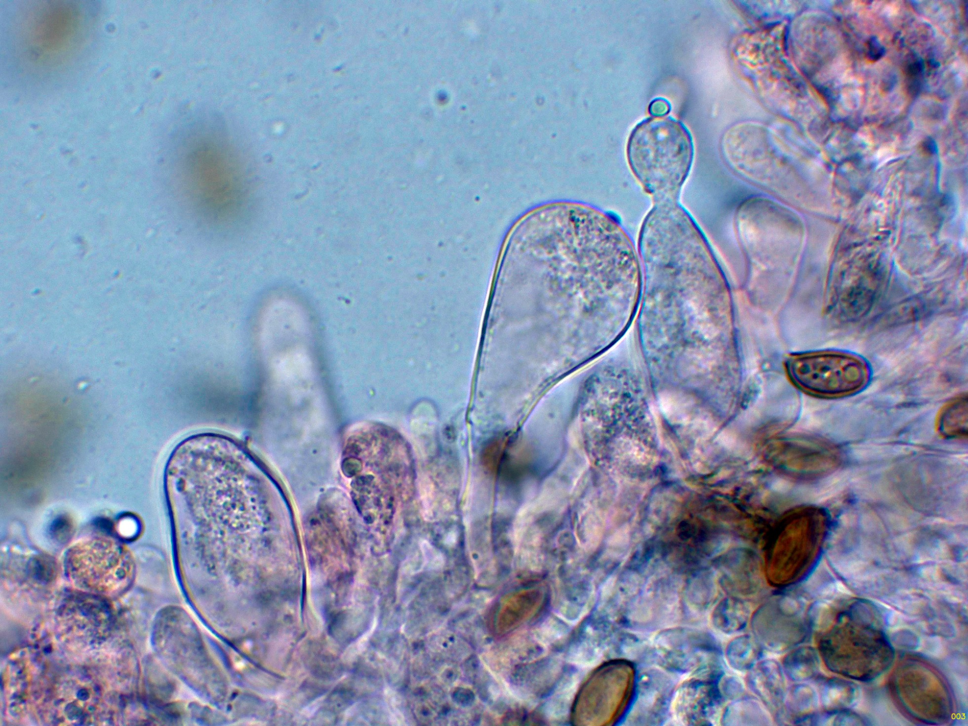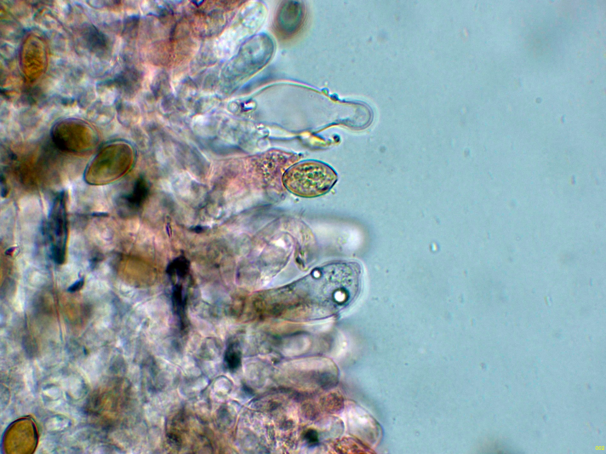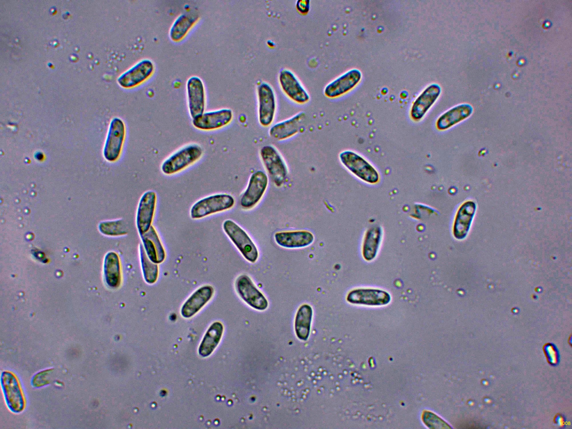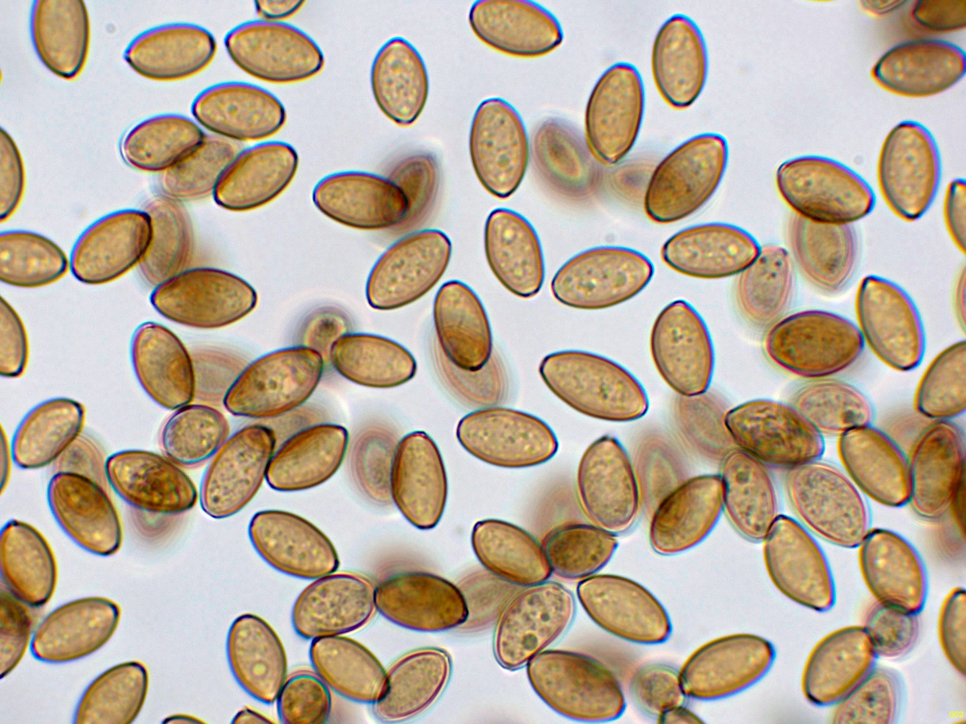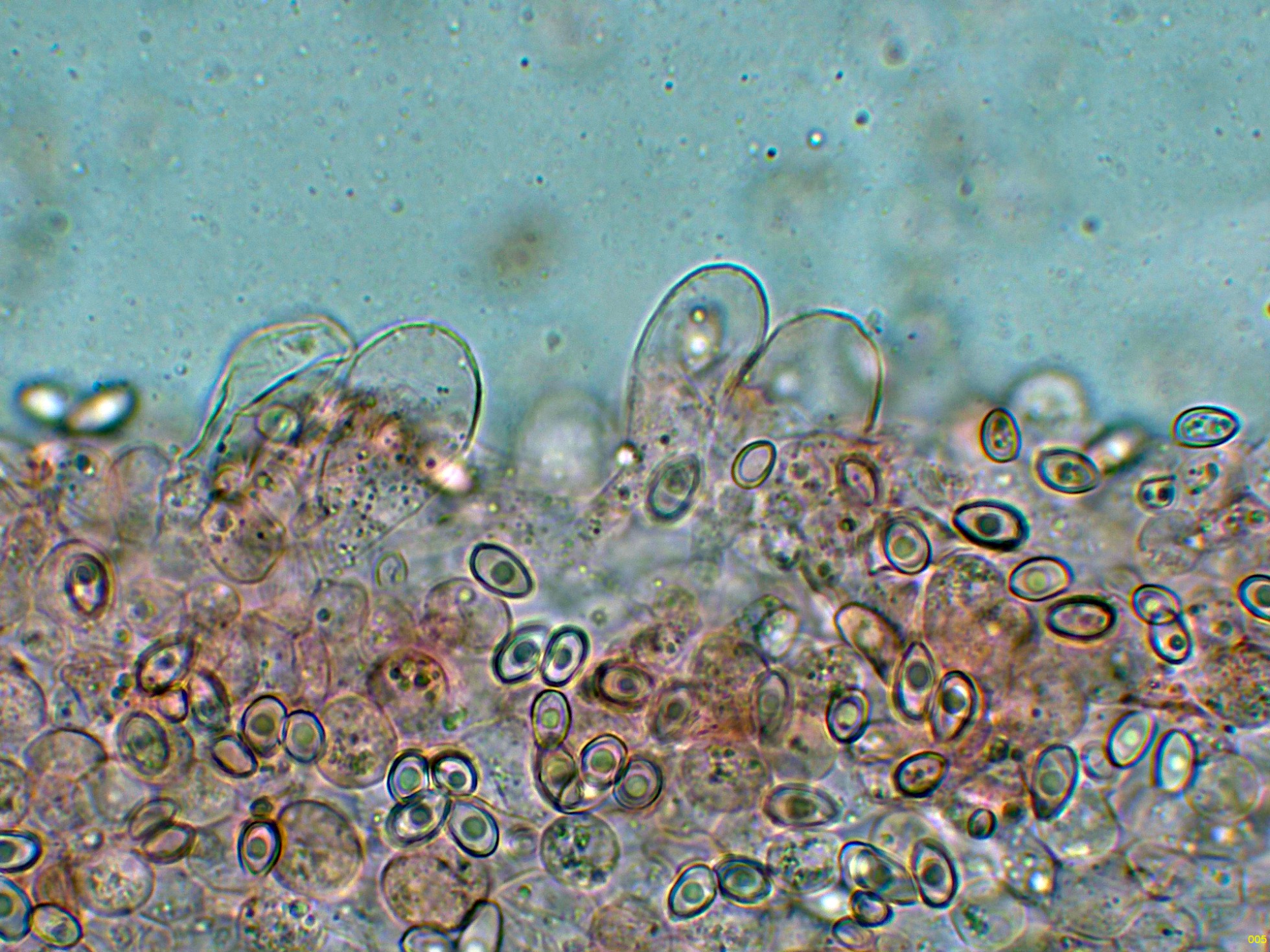 Y sus esporas, en la miniatura en Reactivo de Melzer con reacción fuertemente dextrinoide.