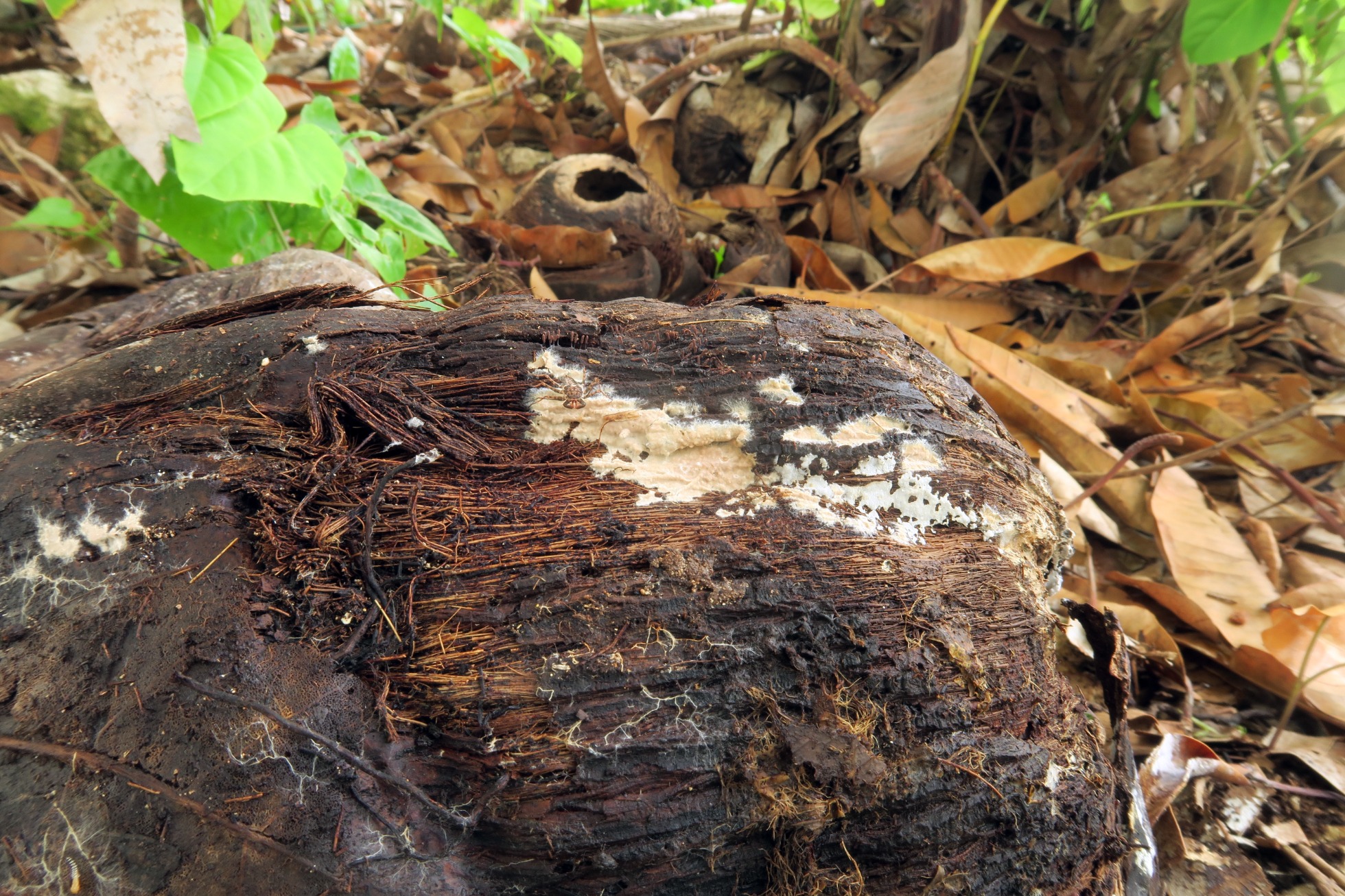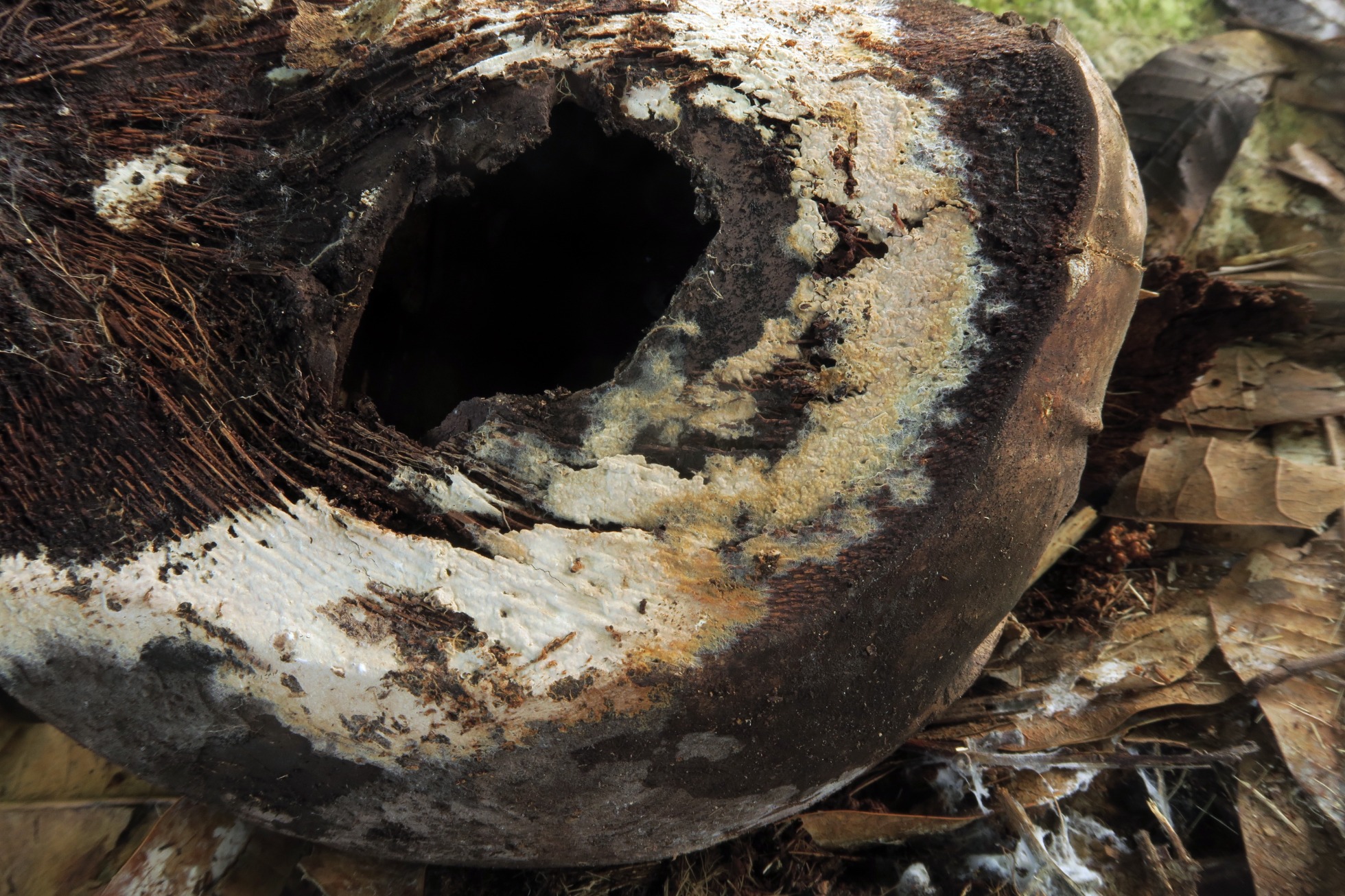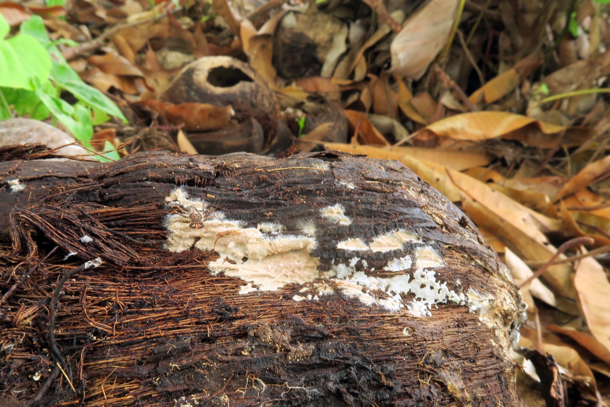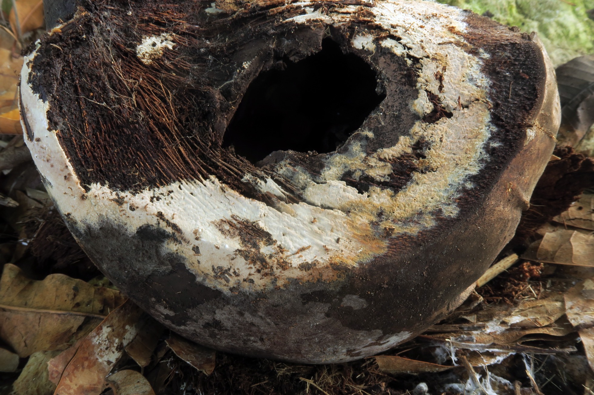 Un Corticial de color crema con el borde de crecimiento ligeramente plumoso, fotografiado el 30 de julio en la República Dominicana, brotando sobre el escobajo de una cáscara de coco del suelo.