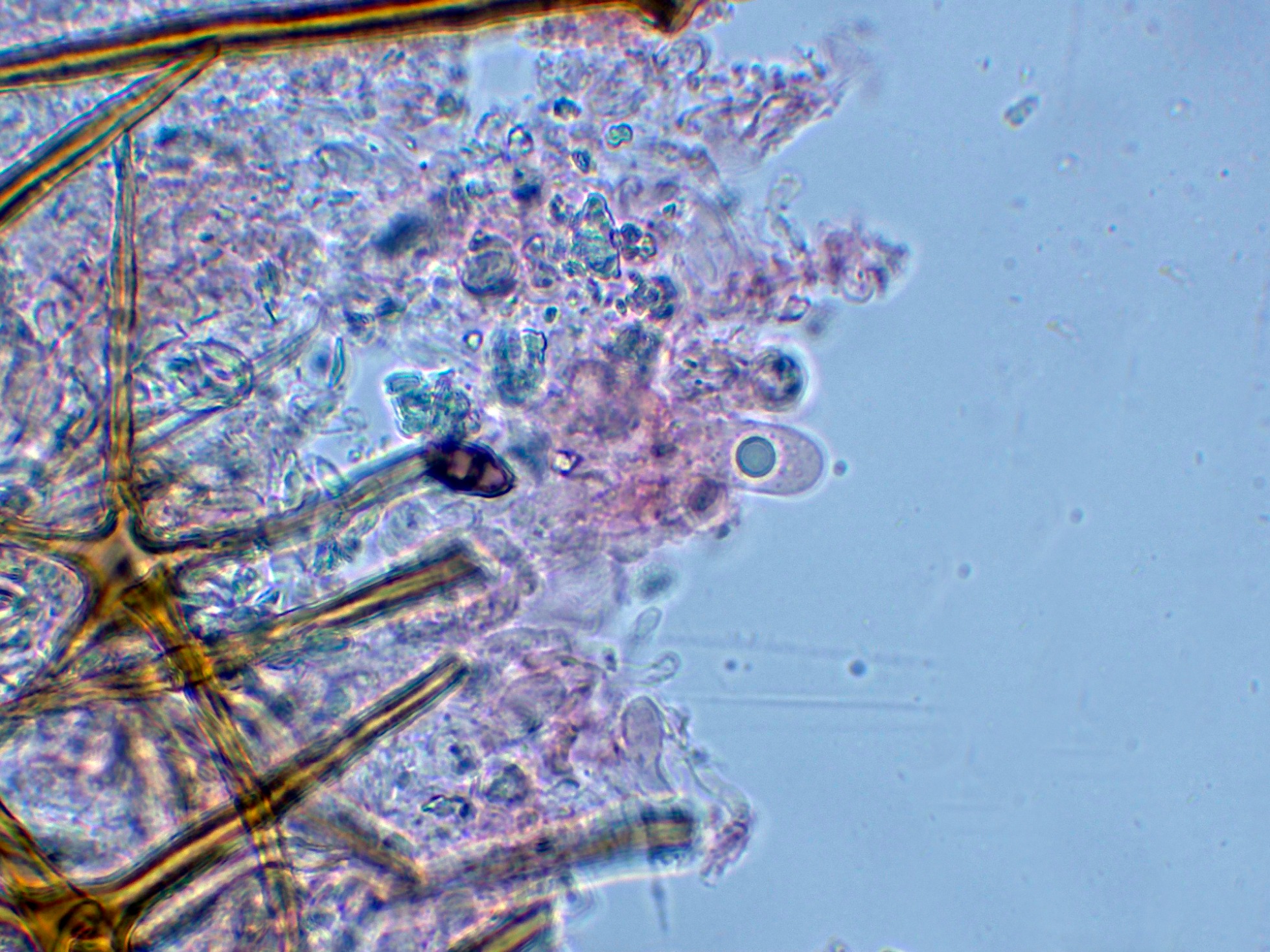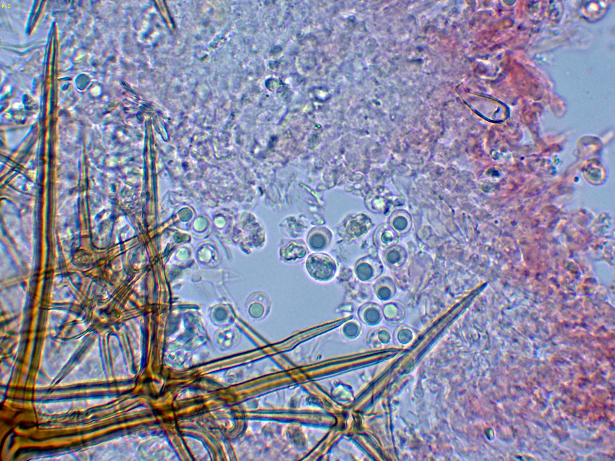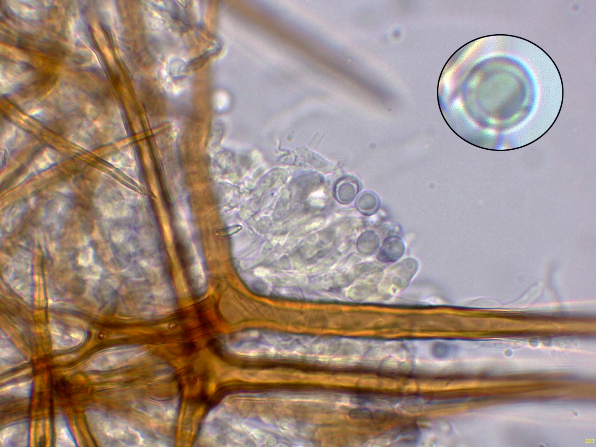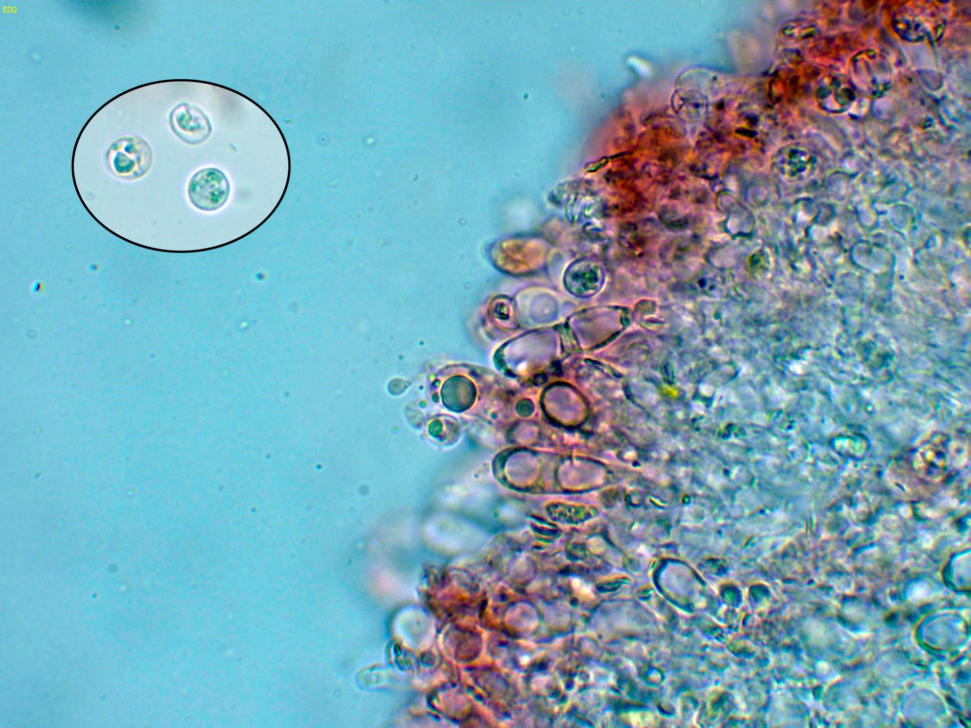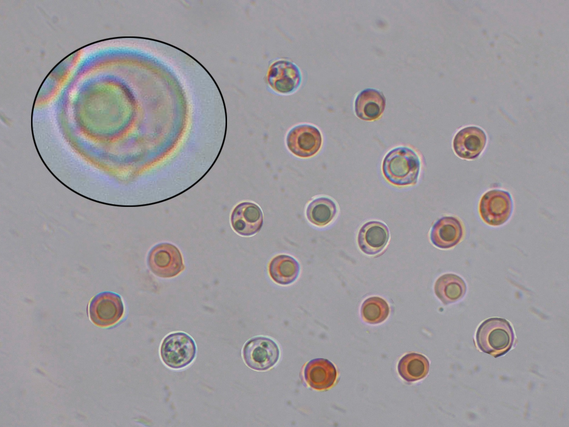Las esporas en solución de Rojo Congo diluido, prácticamente esféricas, lisas, algunas incluso más anchas que largas, con una apícula y mayoritariamente con una gran gota lípida en su interior.