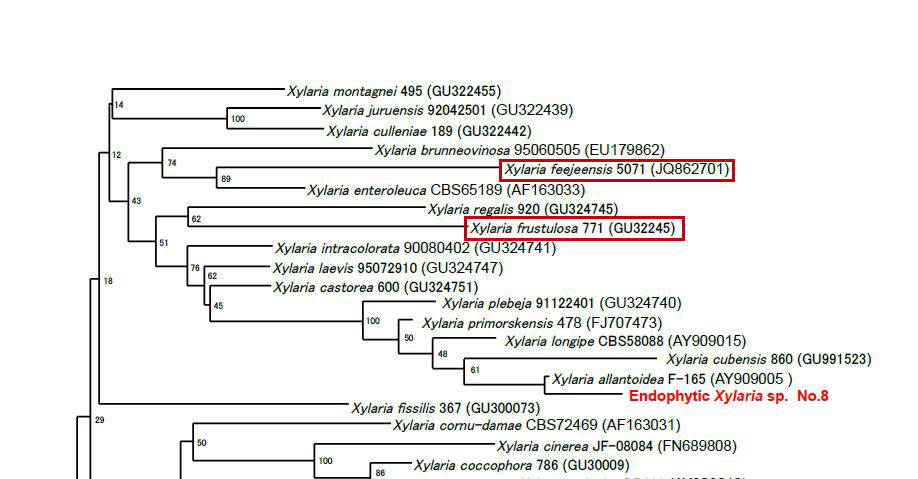 En aquella ocasión Jacques Fournier ya indicaba la cercanía a nivel molecular de la Xylaria frustulosa con la Xylaria feejeensis, añado un pantallazo con la filogénesis de ambas en las que se puede apreciar este detalle.