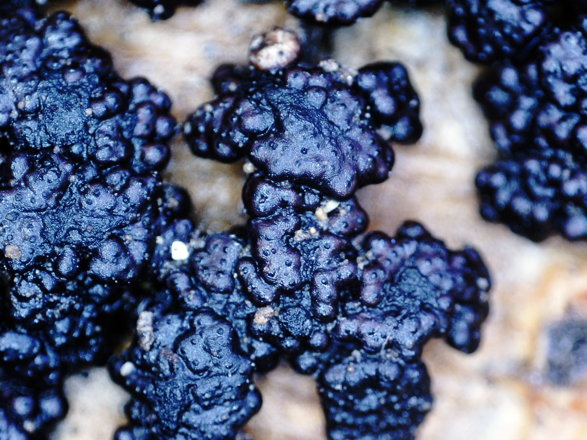 Cuerpo fructífero completamente resupinado y fácilmente separable del sustrato, y aunque su presencia se asocia a restos vegetales de todo tipo, en esta ocasión he podido constatar de su presencia también sobre un cartón húmedo en descomposición del suelo.