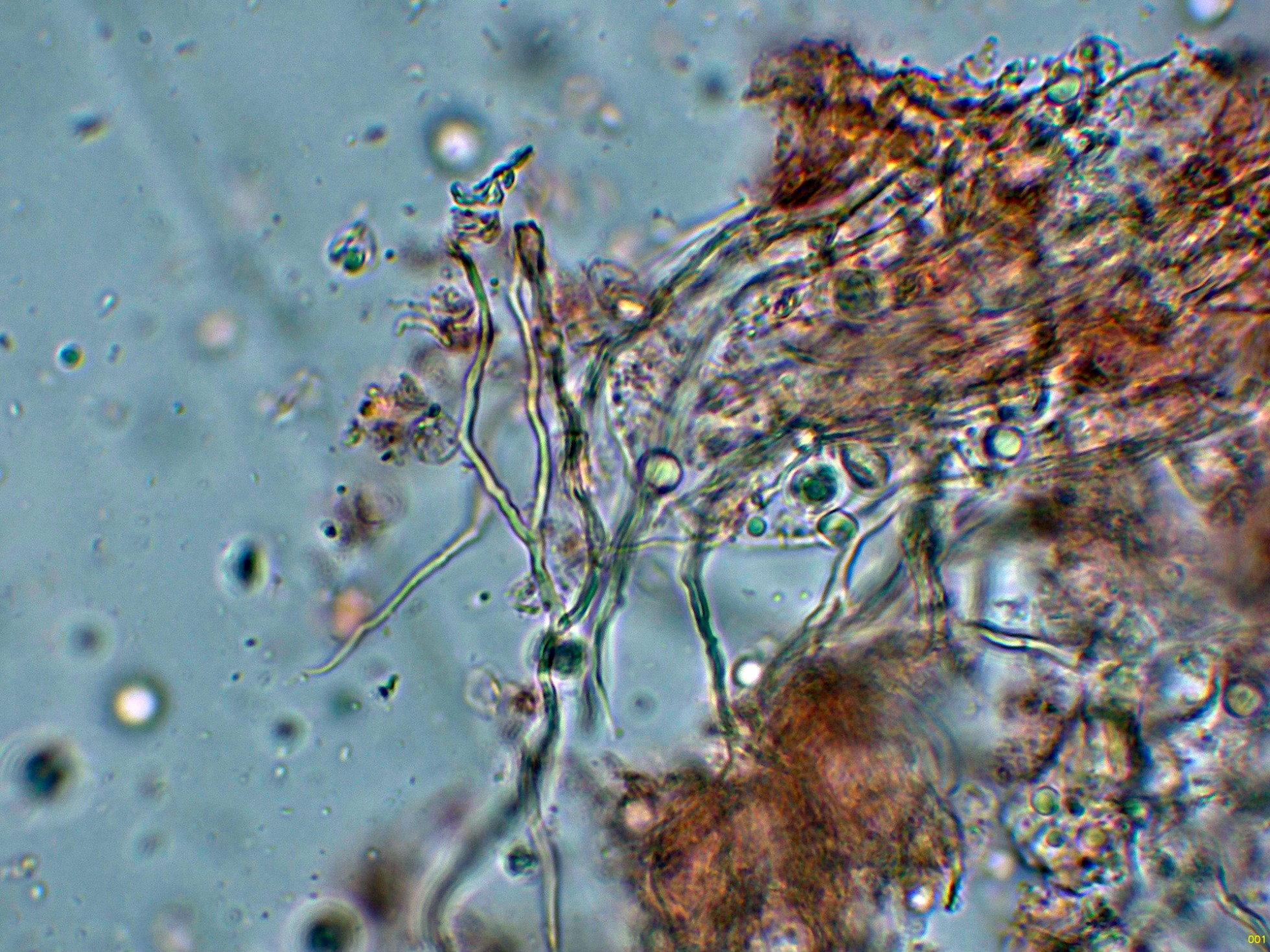 Hifas subiculares fuertemente incrustadas con cristalizaciones gruesas.