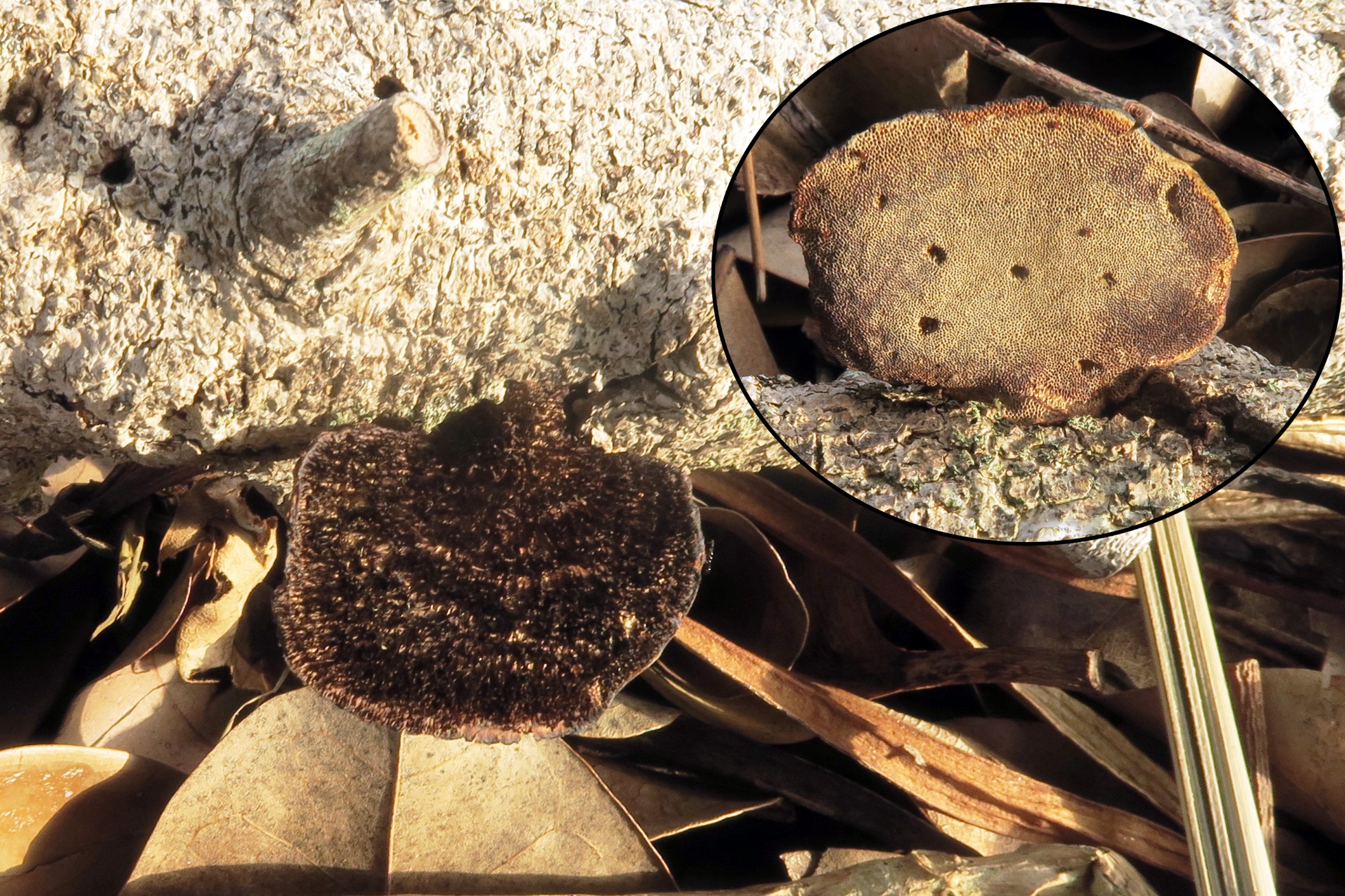 Otro Corticial, de los que más veces me he encontrado, aunque admito que esta es la primera vez que me lo encuentro en el Continente Americano, el muy abundante Scytinostroma hemidichophyticum.