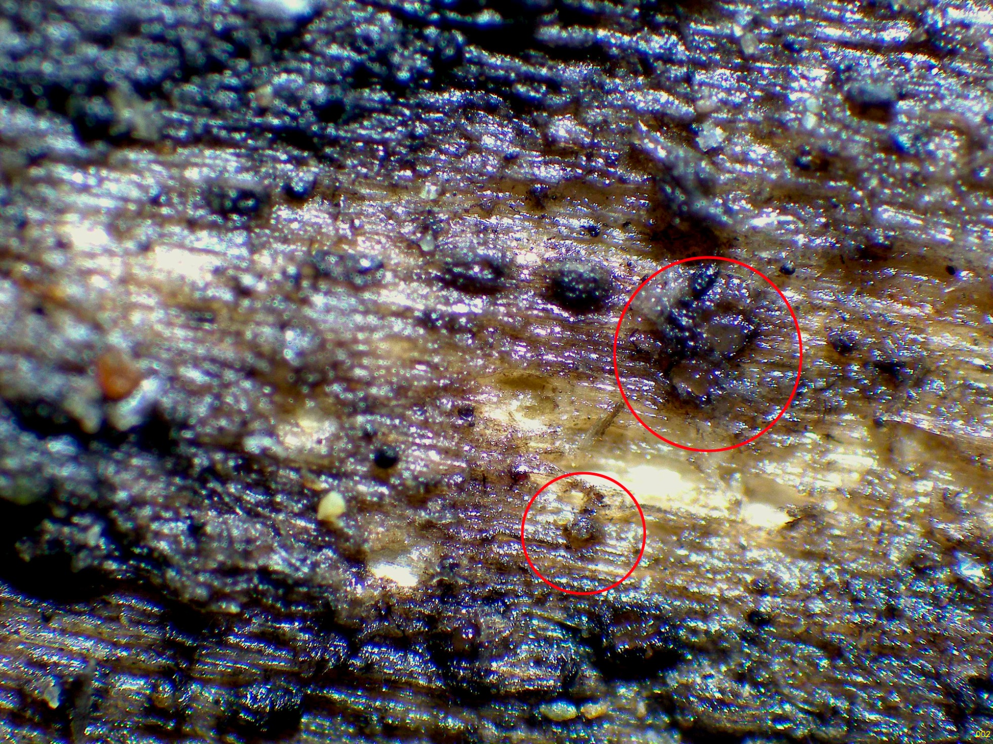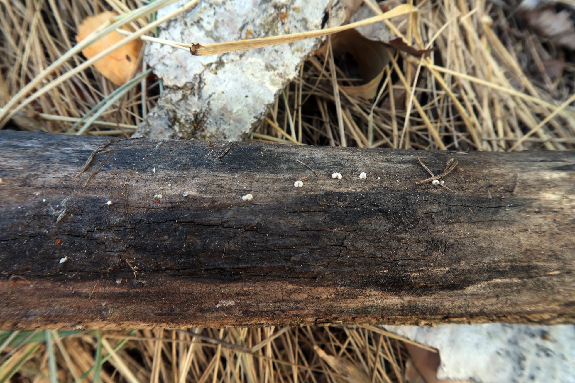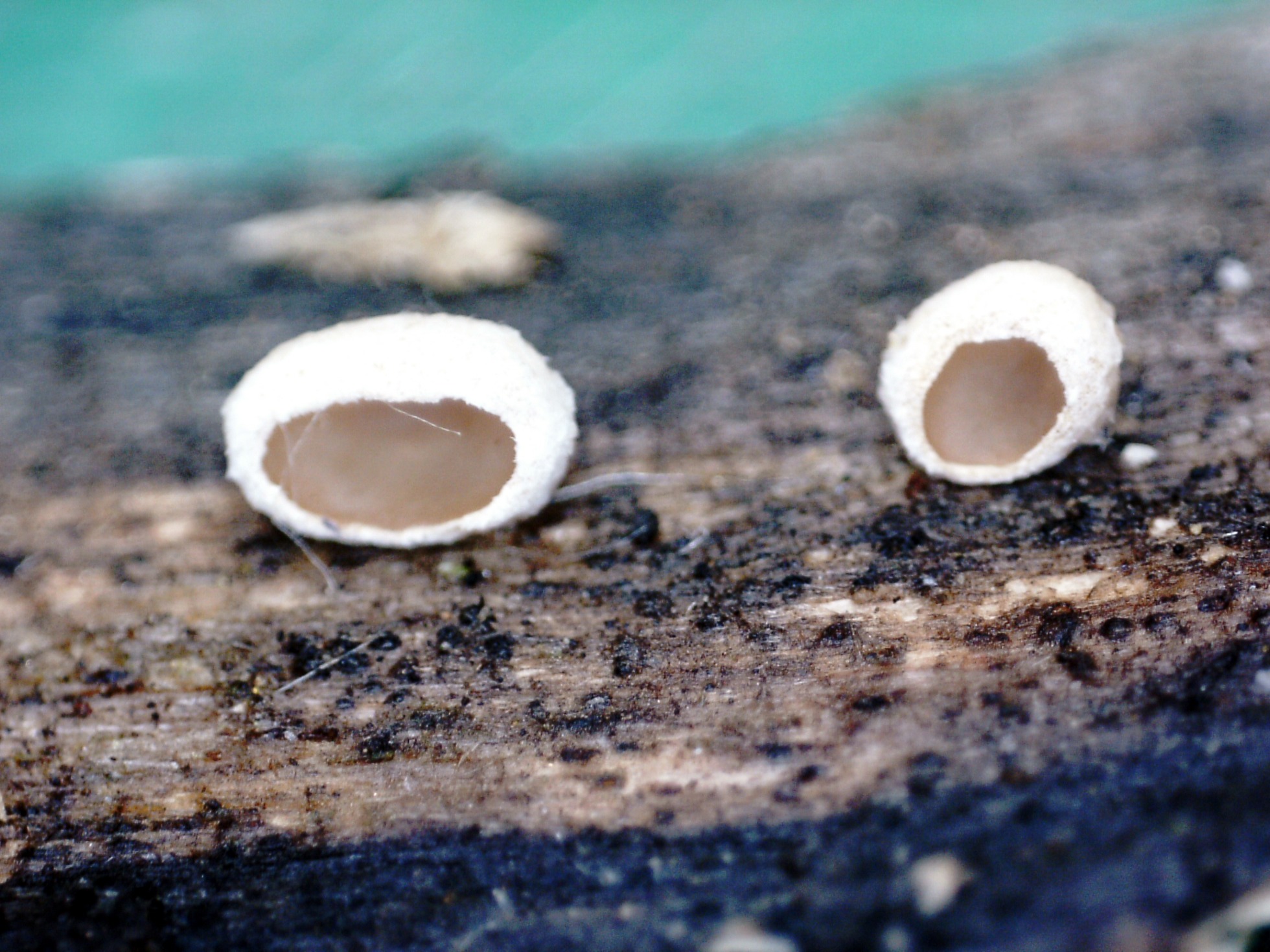 Unos muy diminutos discomicetos de entre 0,1 a 0,25 mm. con forma de plato y su centro hialino o por lo menos más claro, compartiendo espacio con unos pocos ejemplares deshidratados de Schizophyllum amplum.