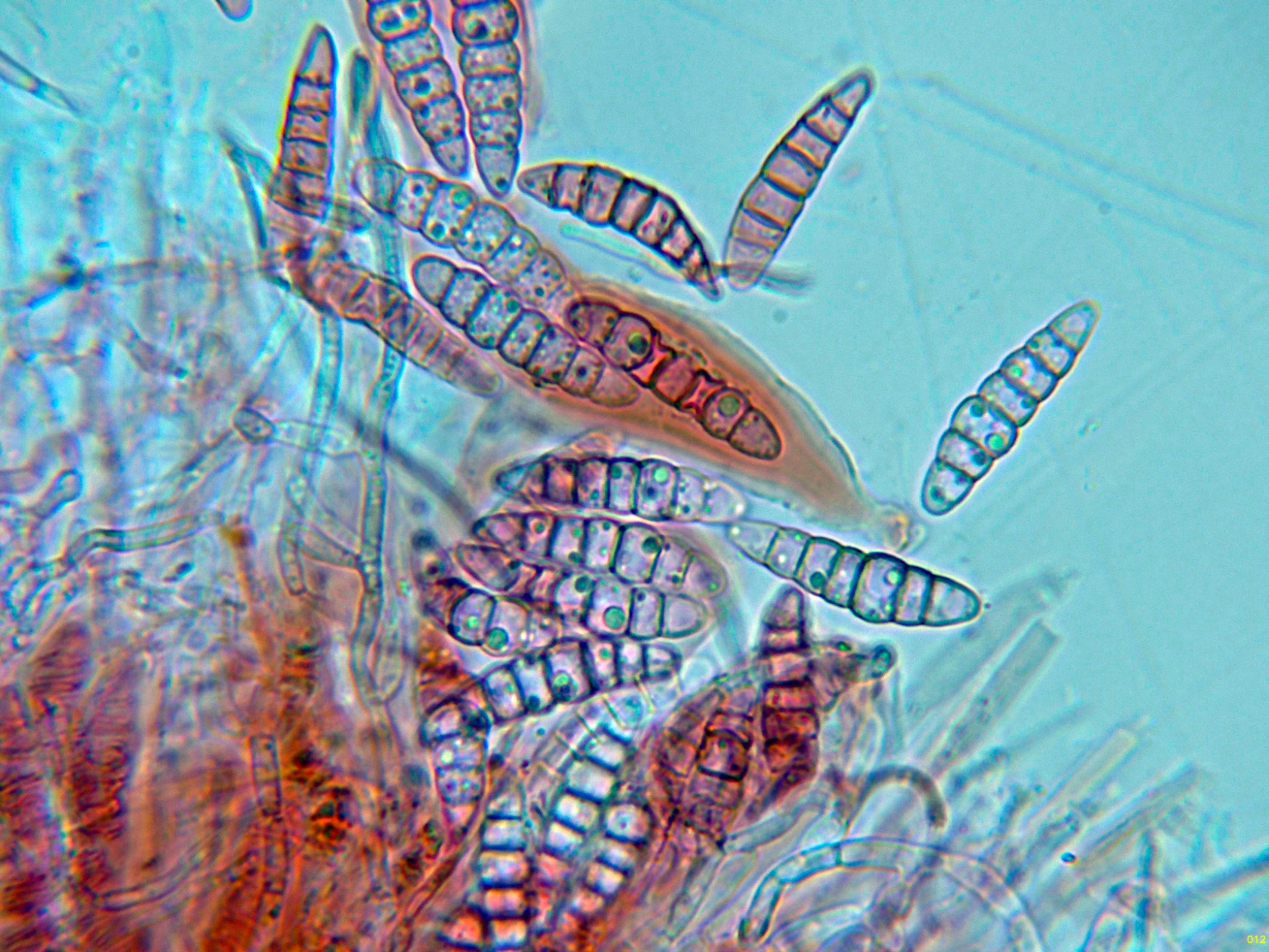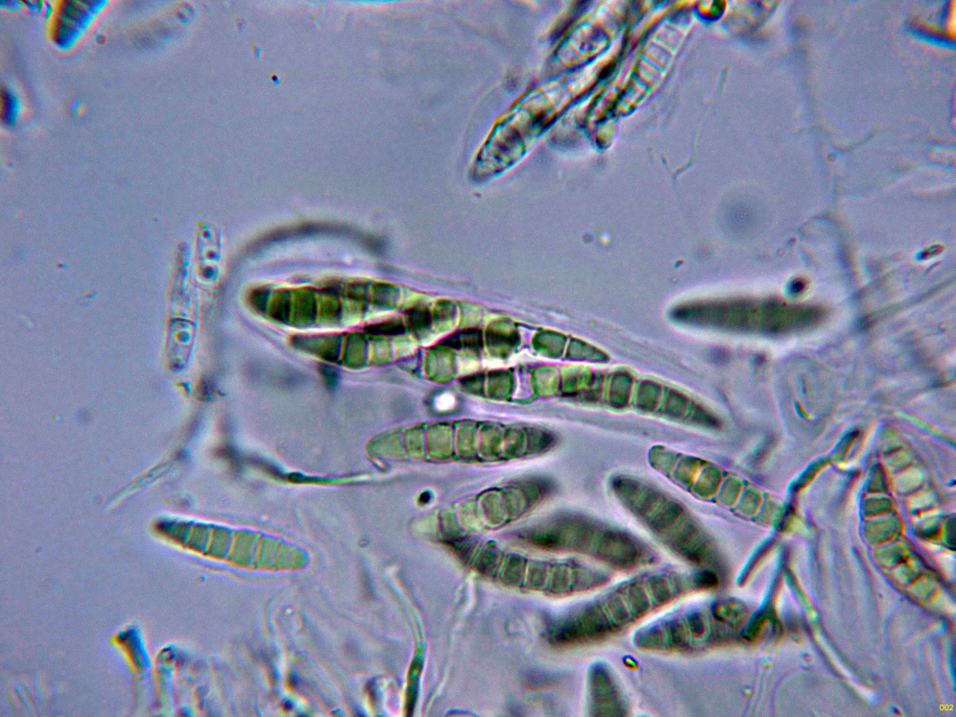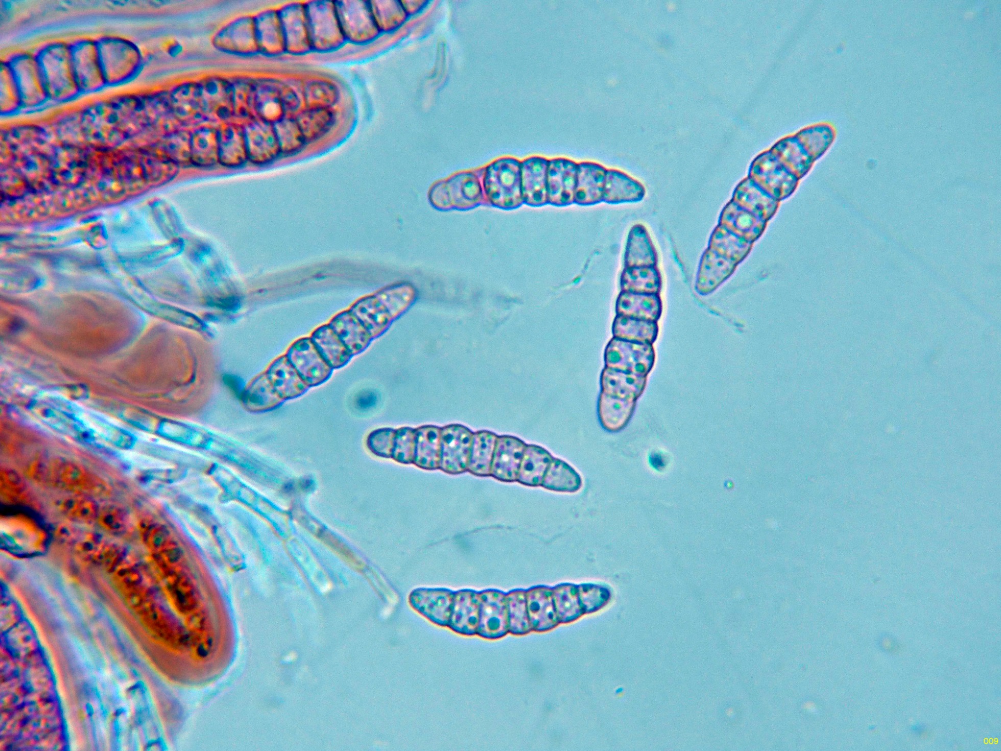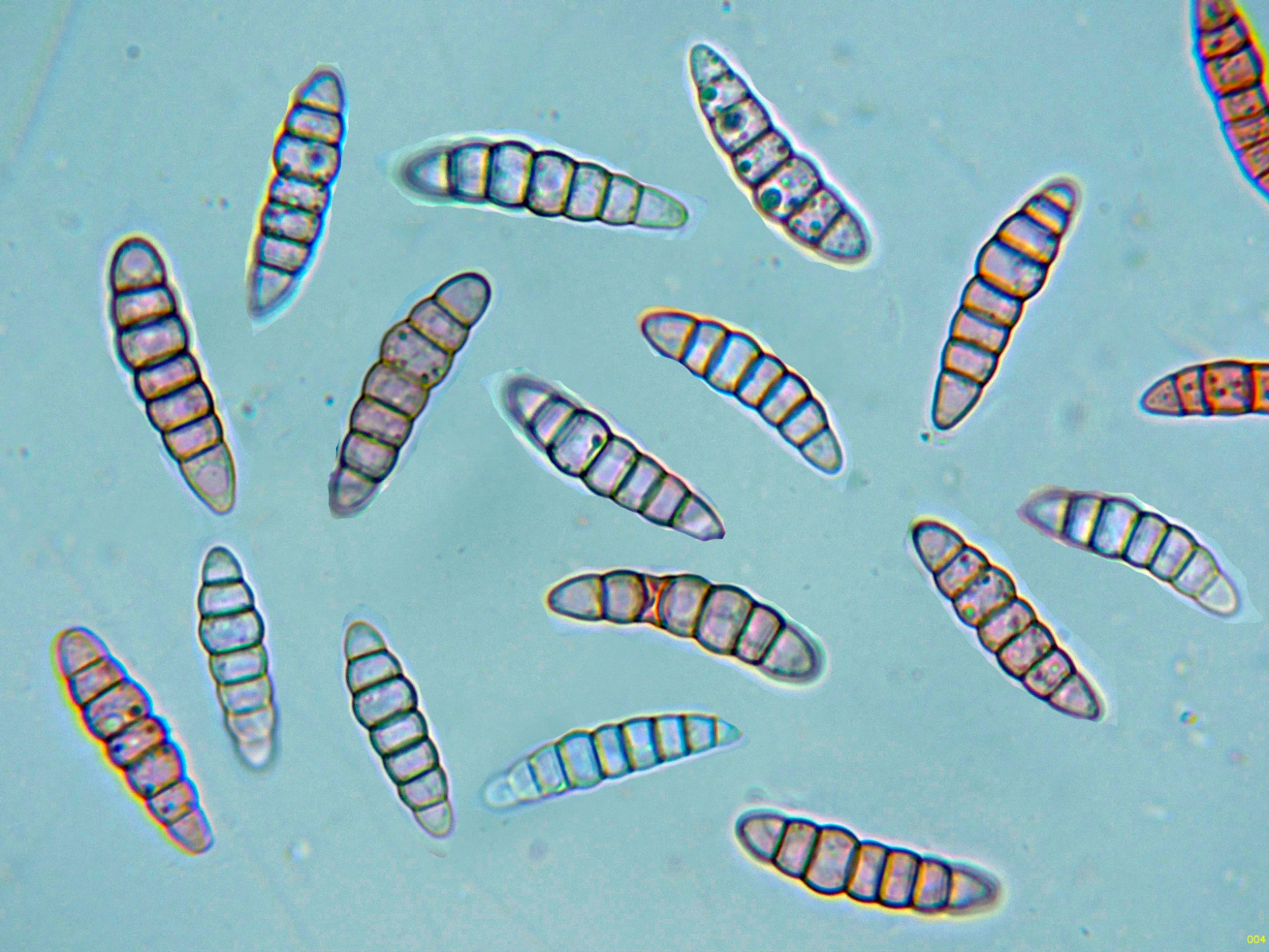 Ascosporas fusiformes con los extremos redondeados, con 5 a 7 septos, con un muy marcado constreñimiento en todos ellos y unas medidas de las ascosporas libres en las muestras preparadas de: