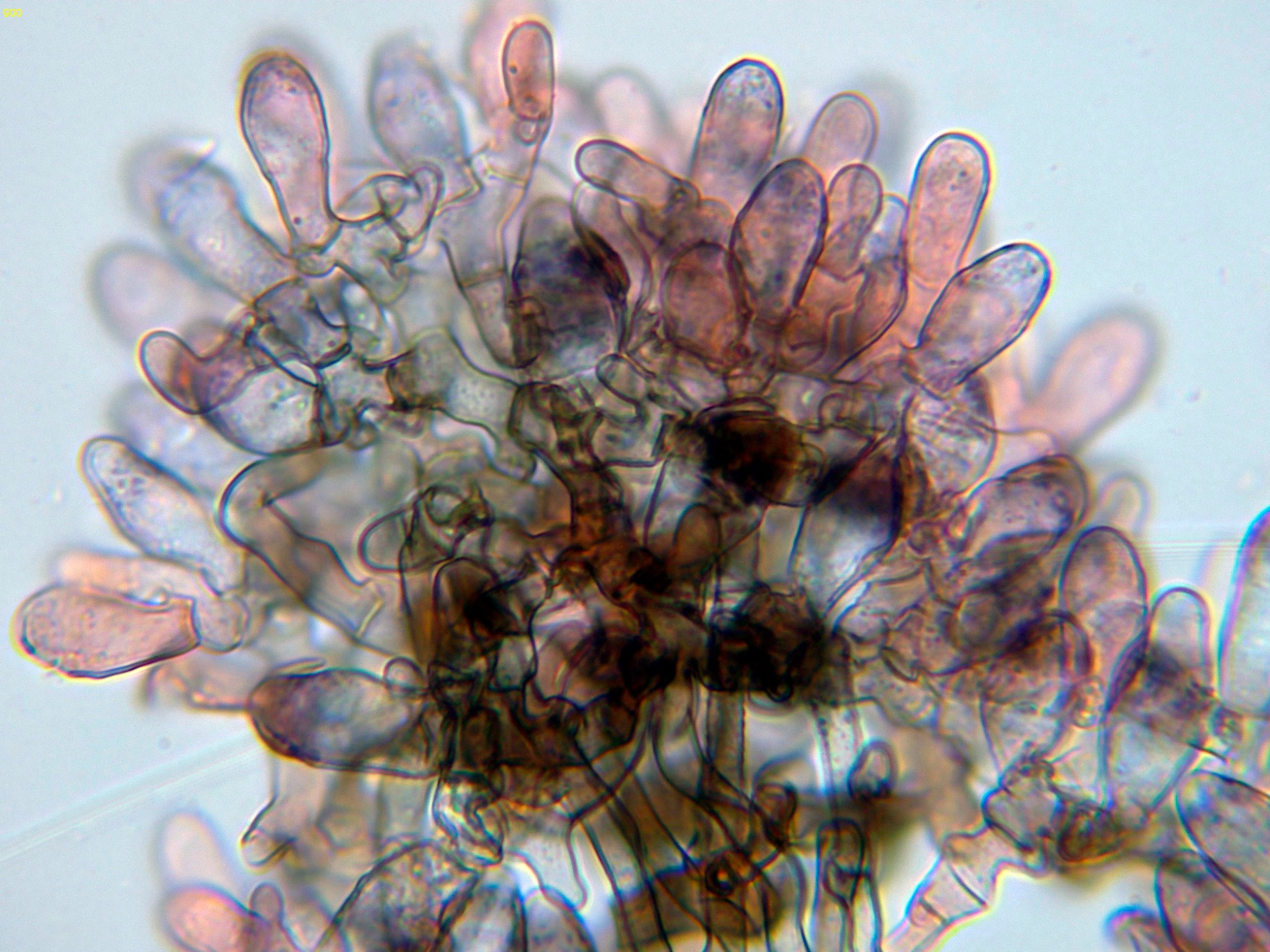 Los basidios sin aparentemente reacción frente al KOH, todo lo más un muy ligero oscurecimientos de los elementos himeniales.