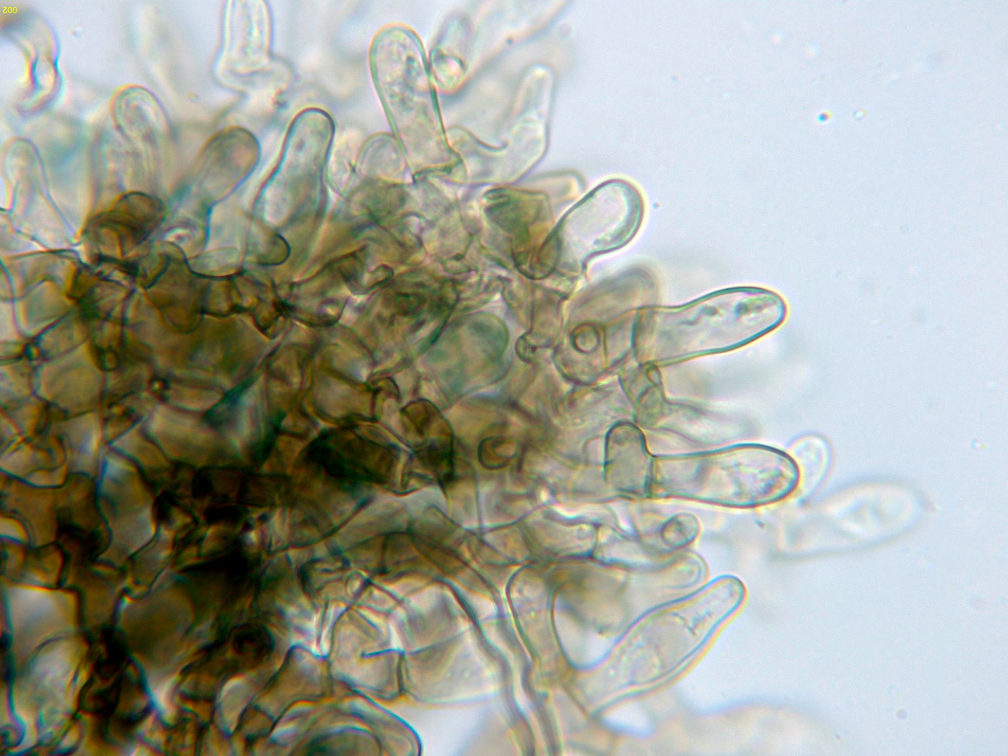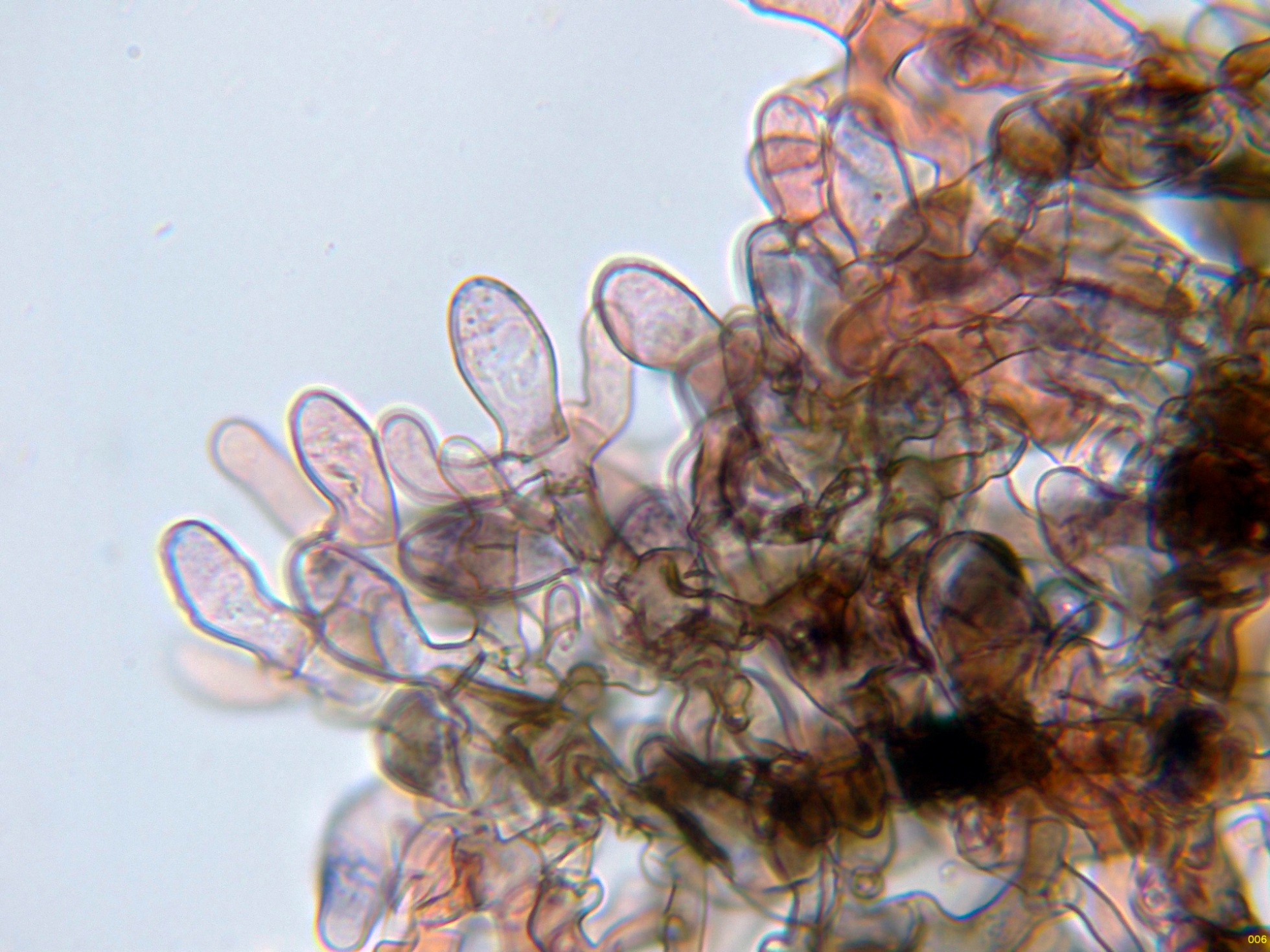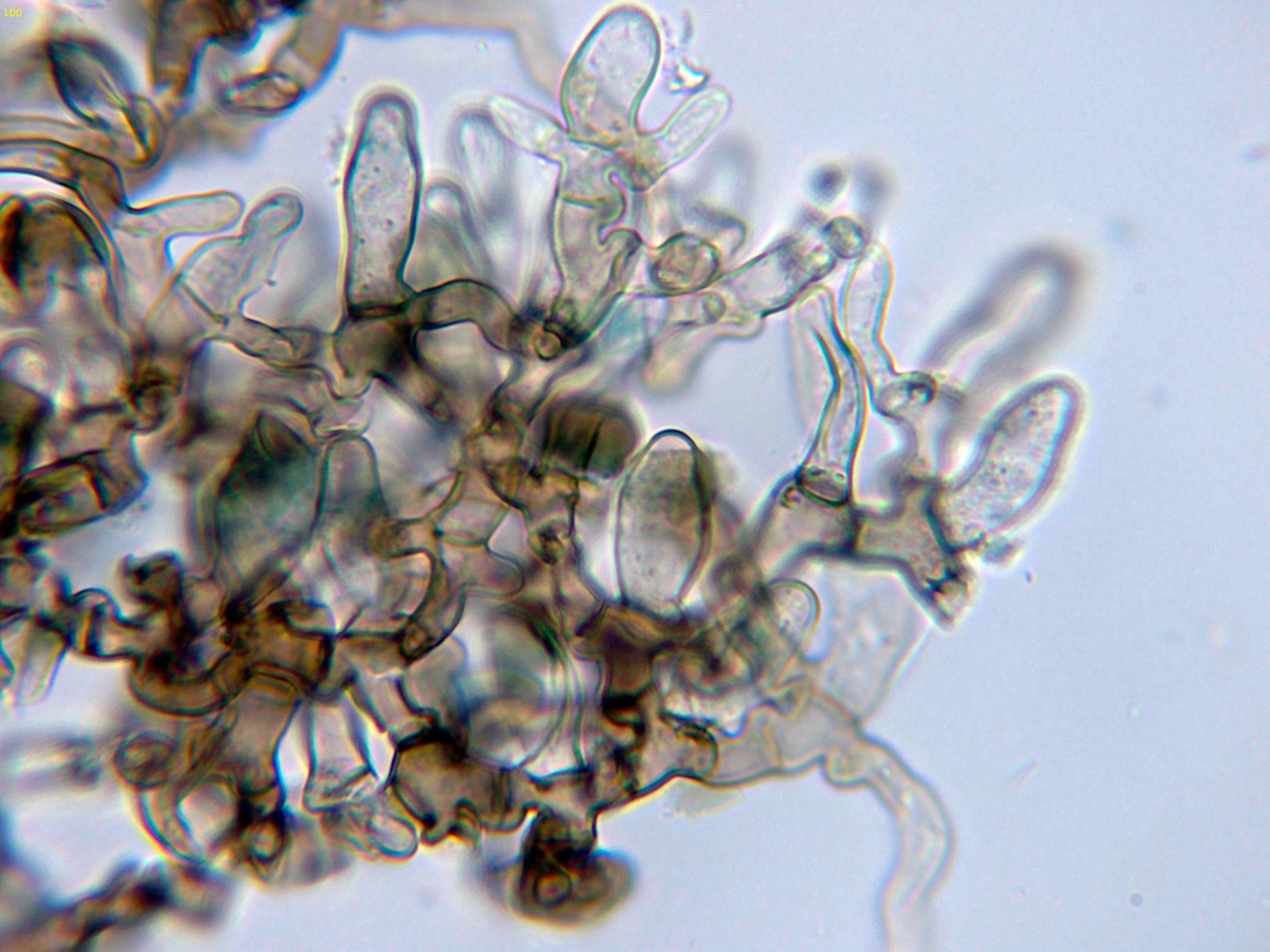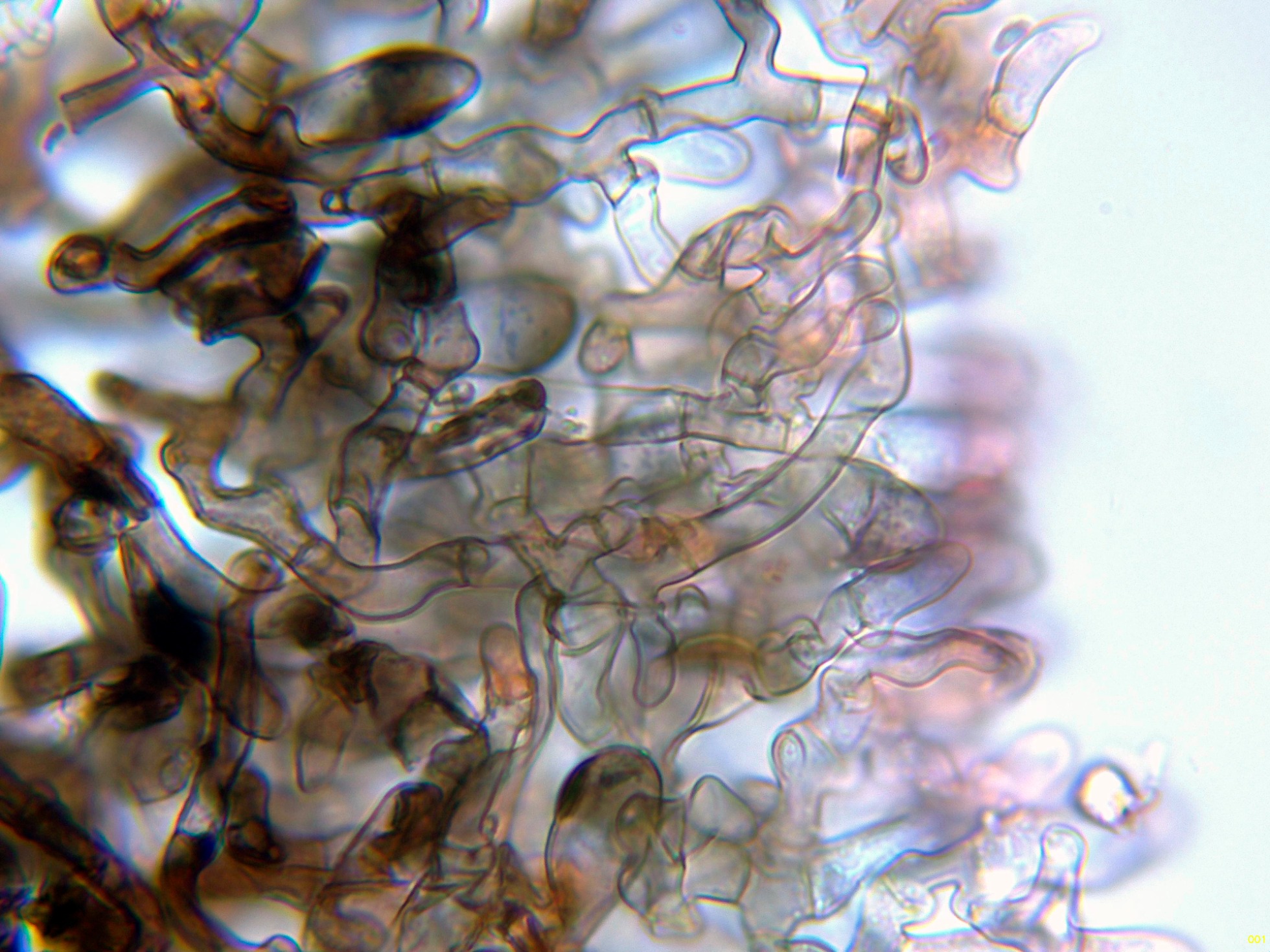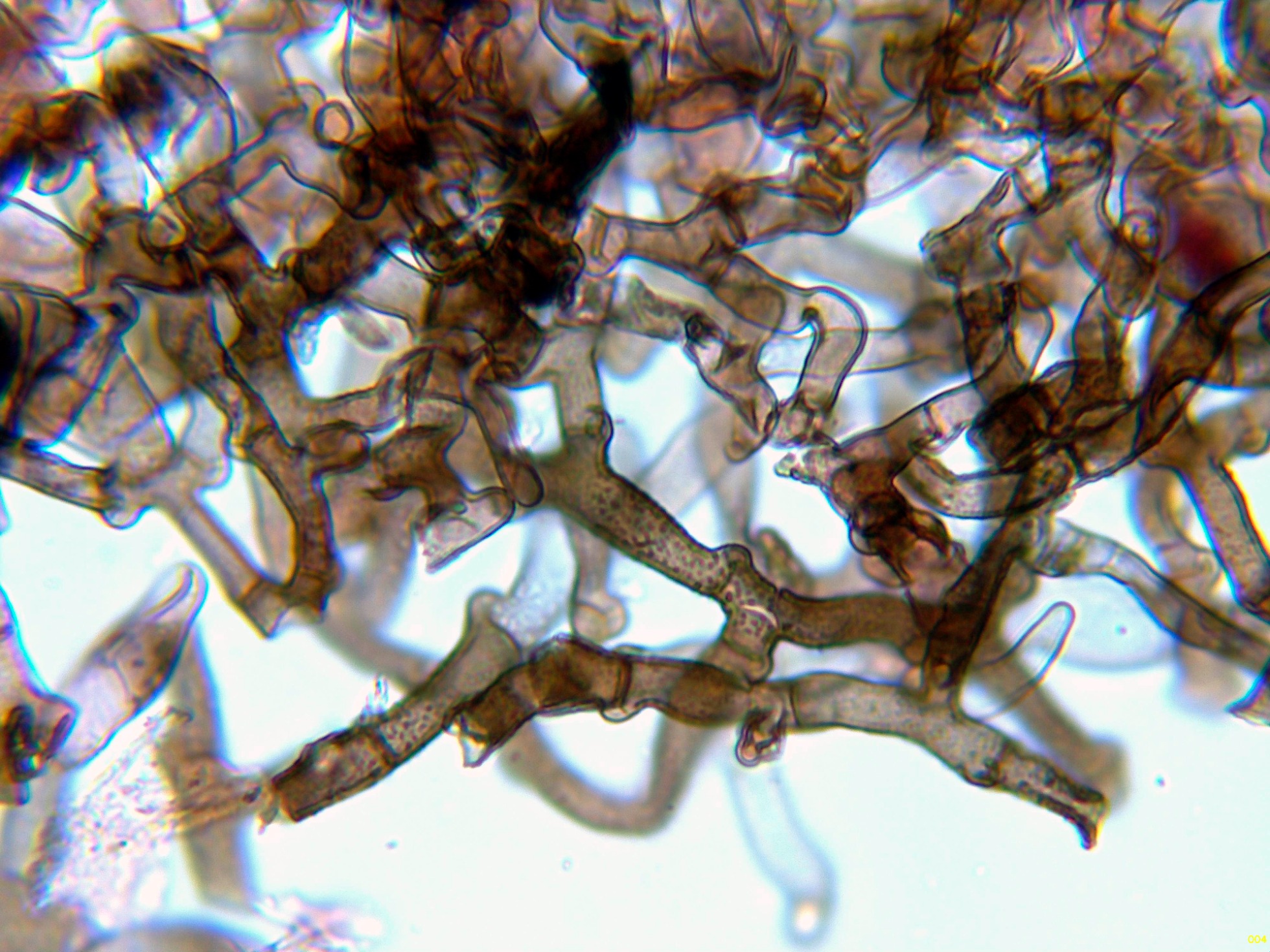Hifas subiculares ya algo más coloreadas de marrón pálido y al parecer algunas con tenues incrustaciones.