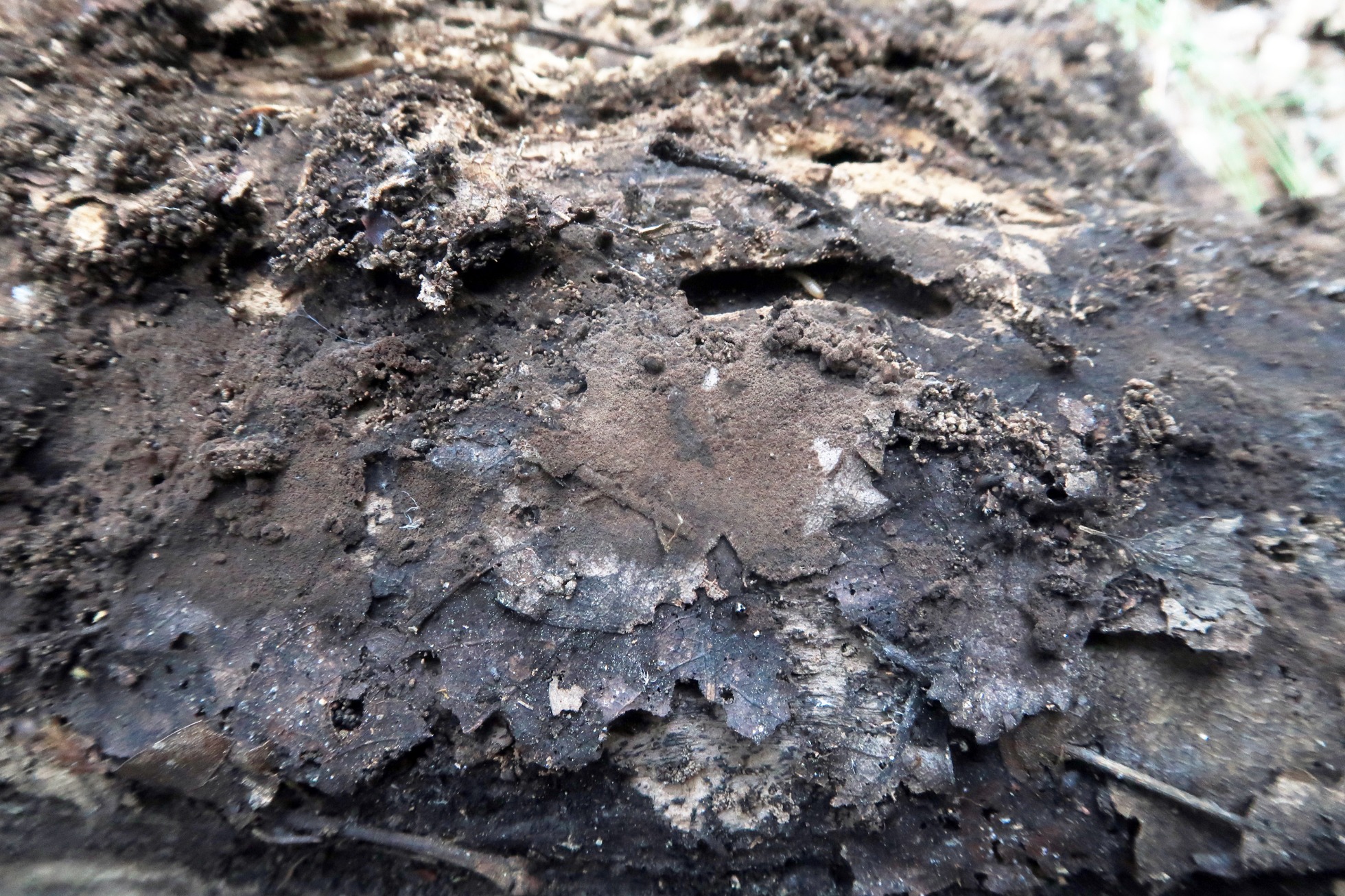 Una Tomentella brotando sobre unas hojas del suelo adheridas sobre la superficie de un tronco tumbado de planifolio, en soto fluvial.