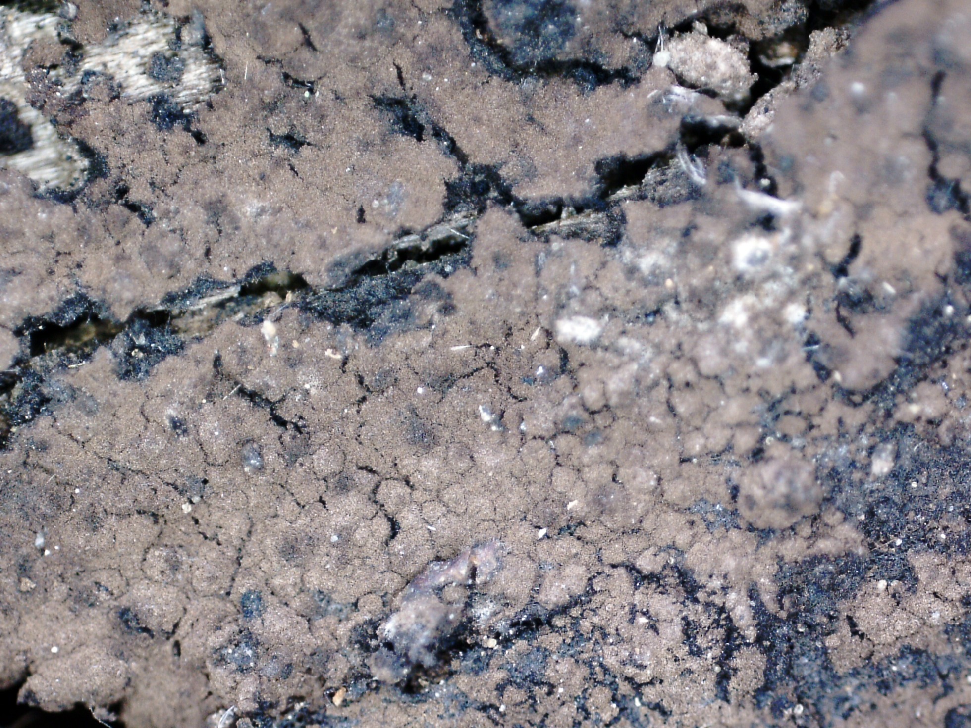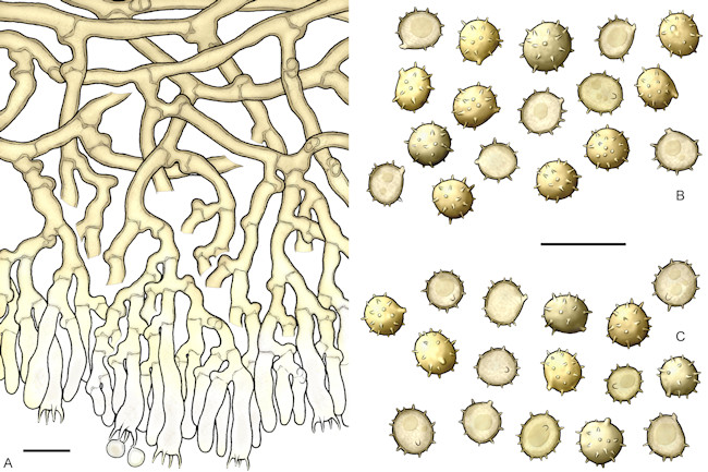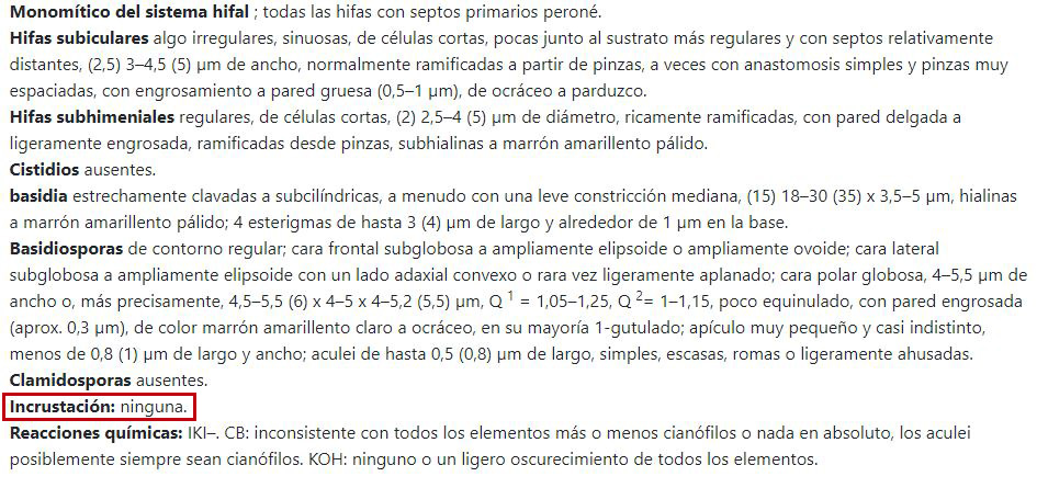 Aunque todos los parámetros parecen coincidir con mi estudio, define a la especie como "sin incrustaciones", y a mí me pareció observar algunas incrustaciones en las hifas subiculares, aunque tampoco descarto por completo que hubiera un par de Tomentellas distintas compartiendo el mismo espacio, no sería la primera vez que me ocurriera algo semejante.