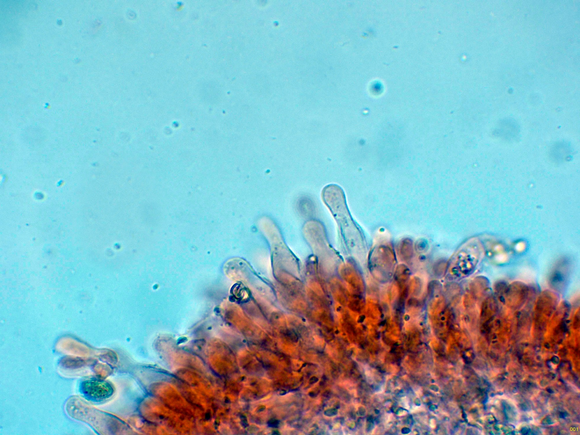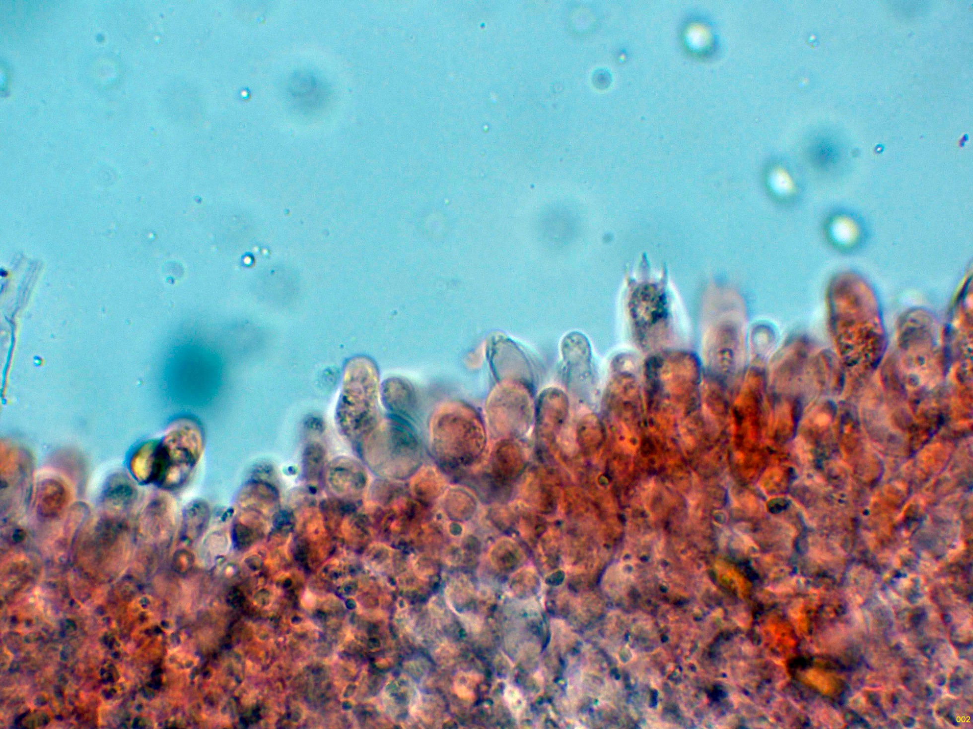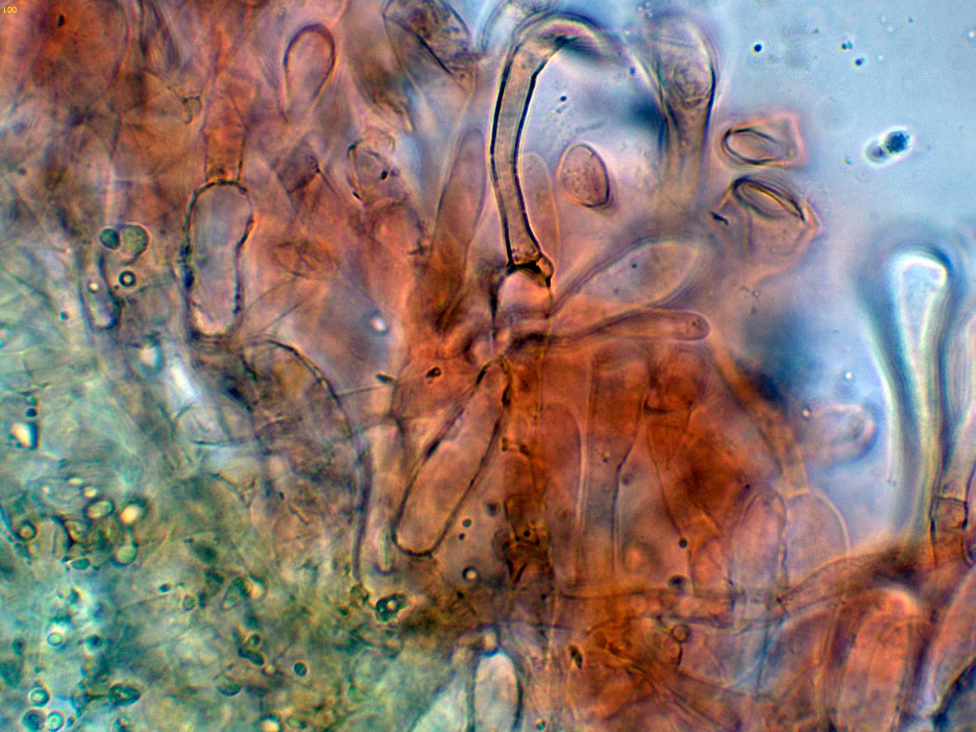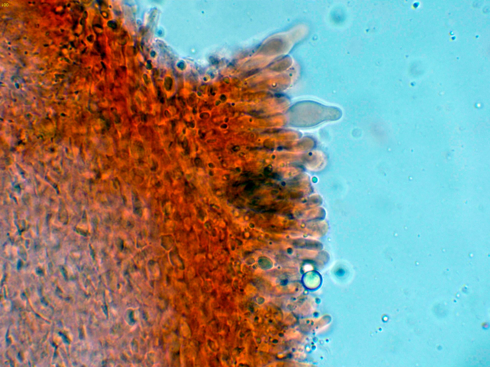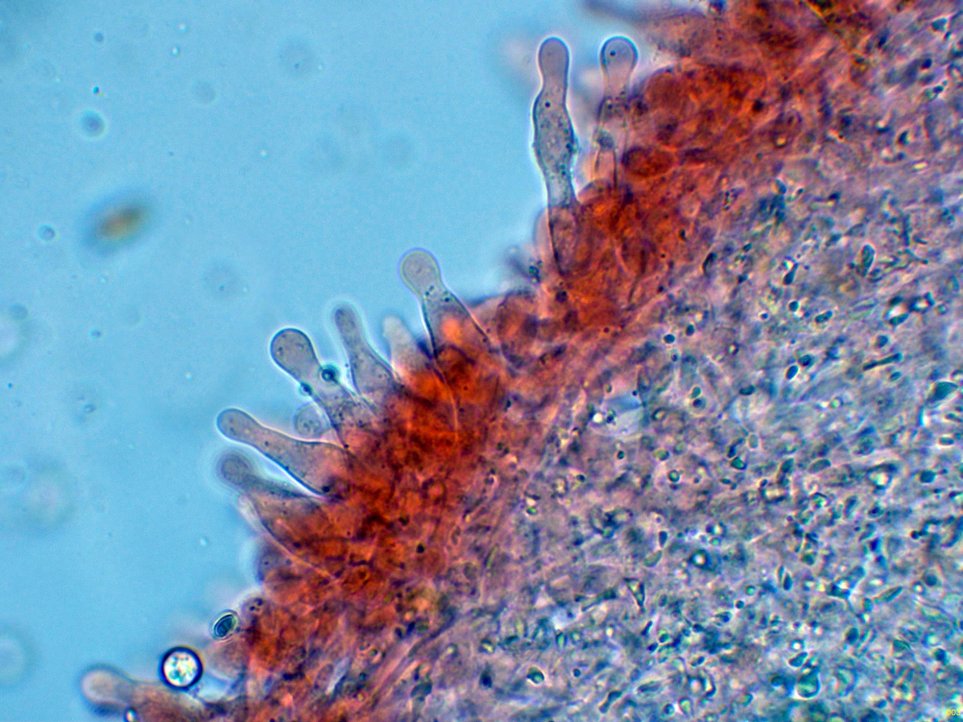 En la cara laminar presenta pleurocistidios dispersos, estos muy ensanchados en su parte media.