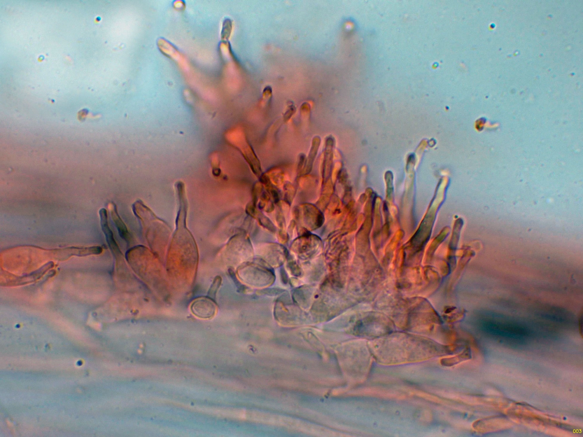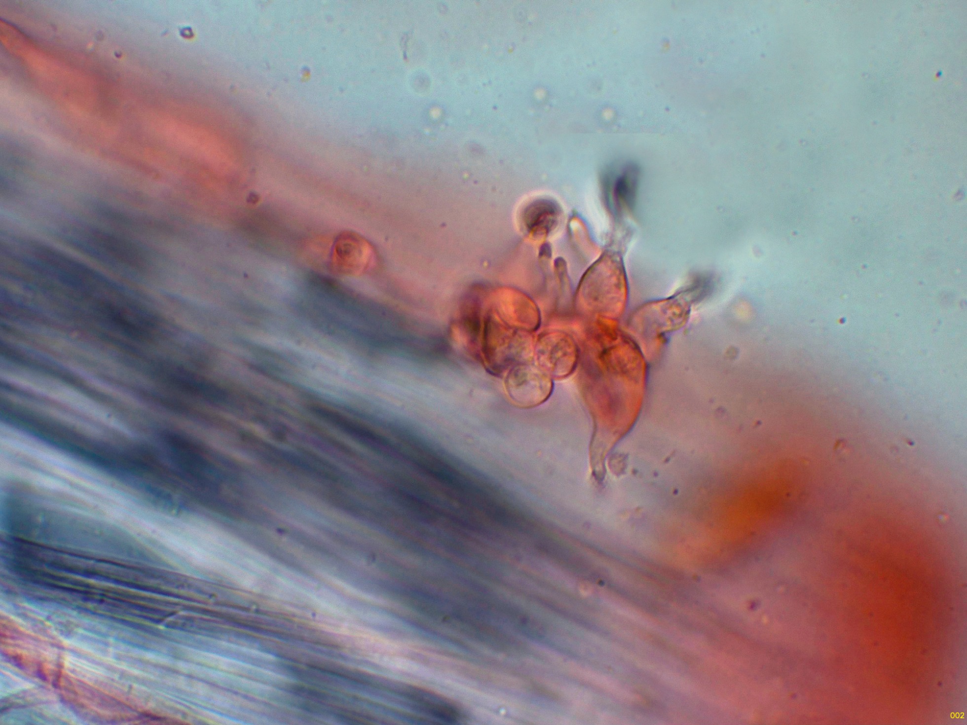 Caulocistidios presentes en la superficie del pie, a modo de racimos, con la base ventruda y terminando con un largo cuello.