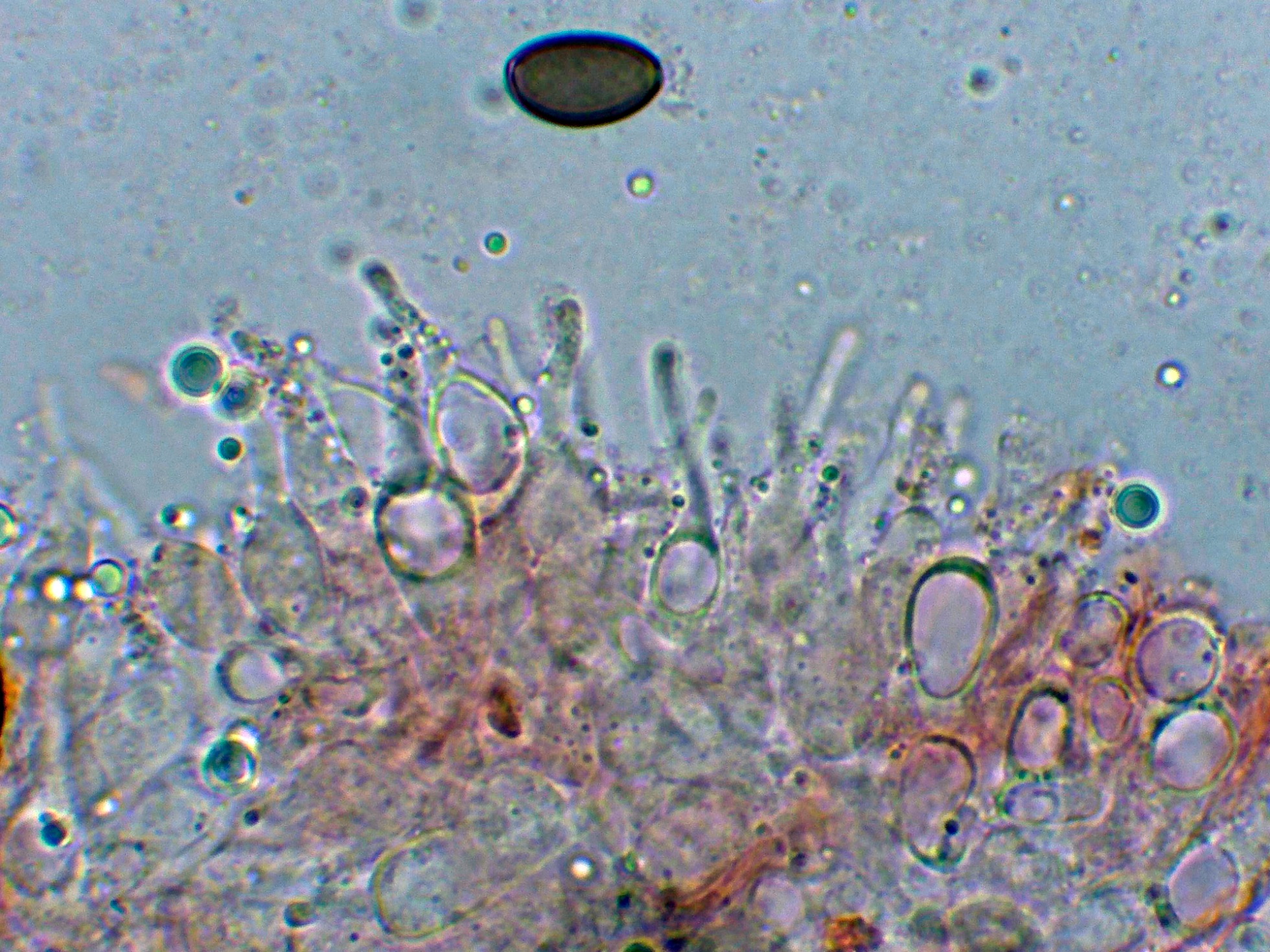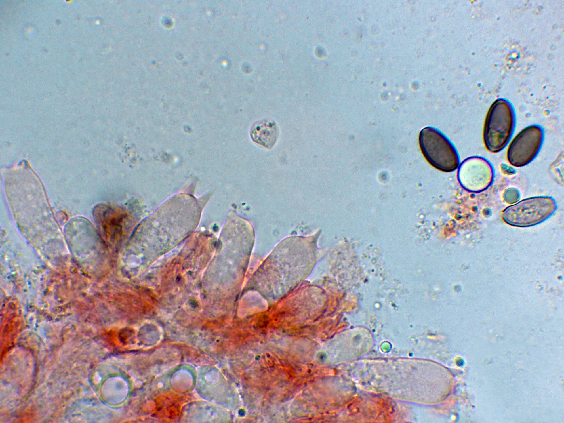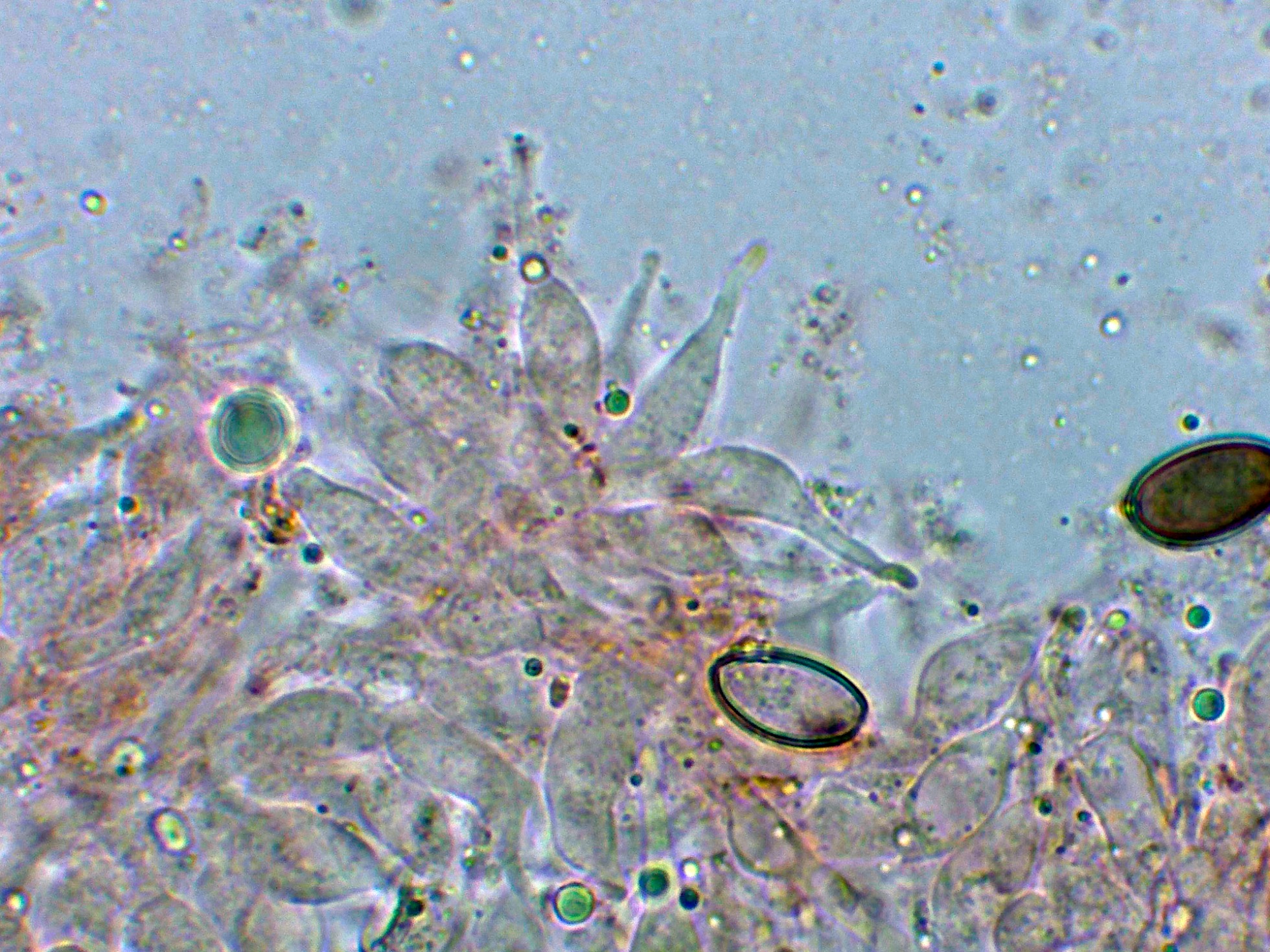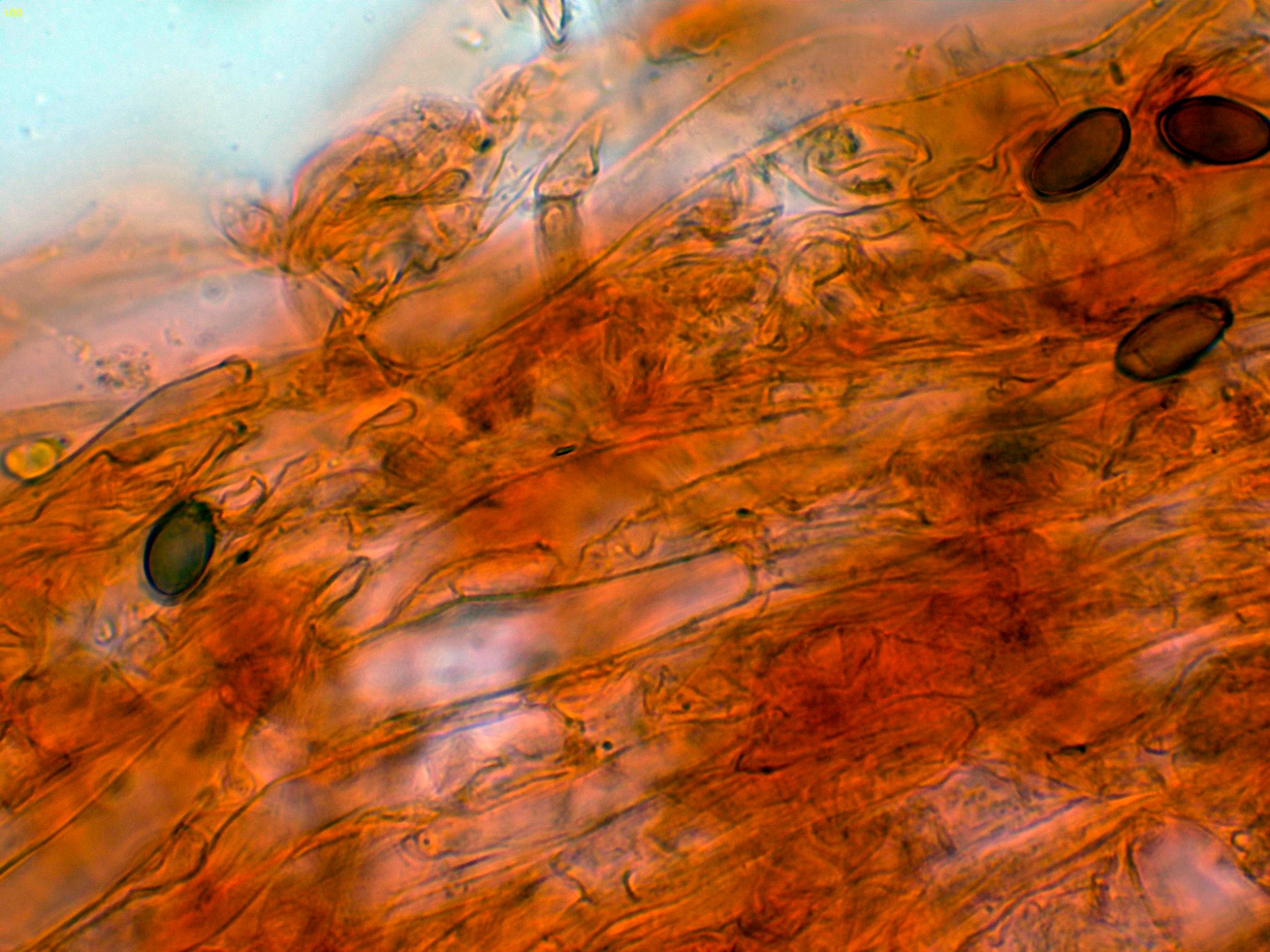 Basidiosporas de gran tamaño, de color violáceo al microscopio, con una apícula muy discreta en un extremo y en el otro extremo con un poro germinativo.