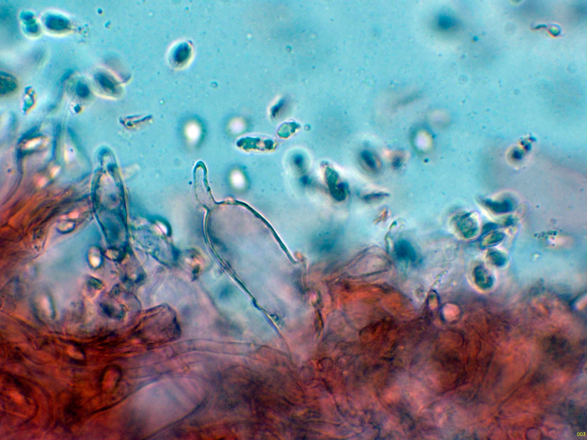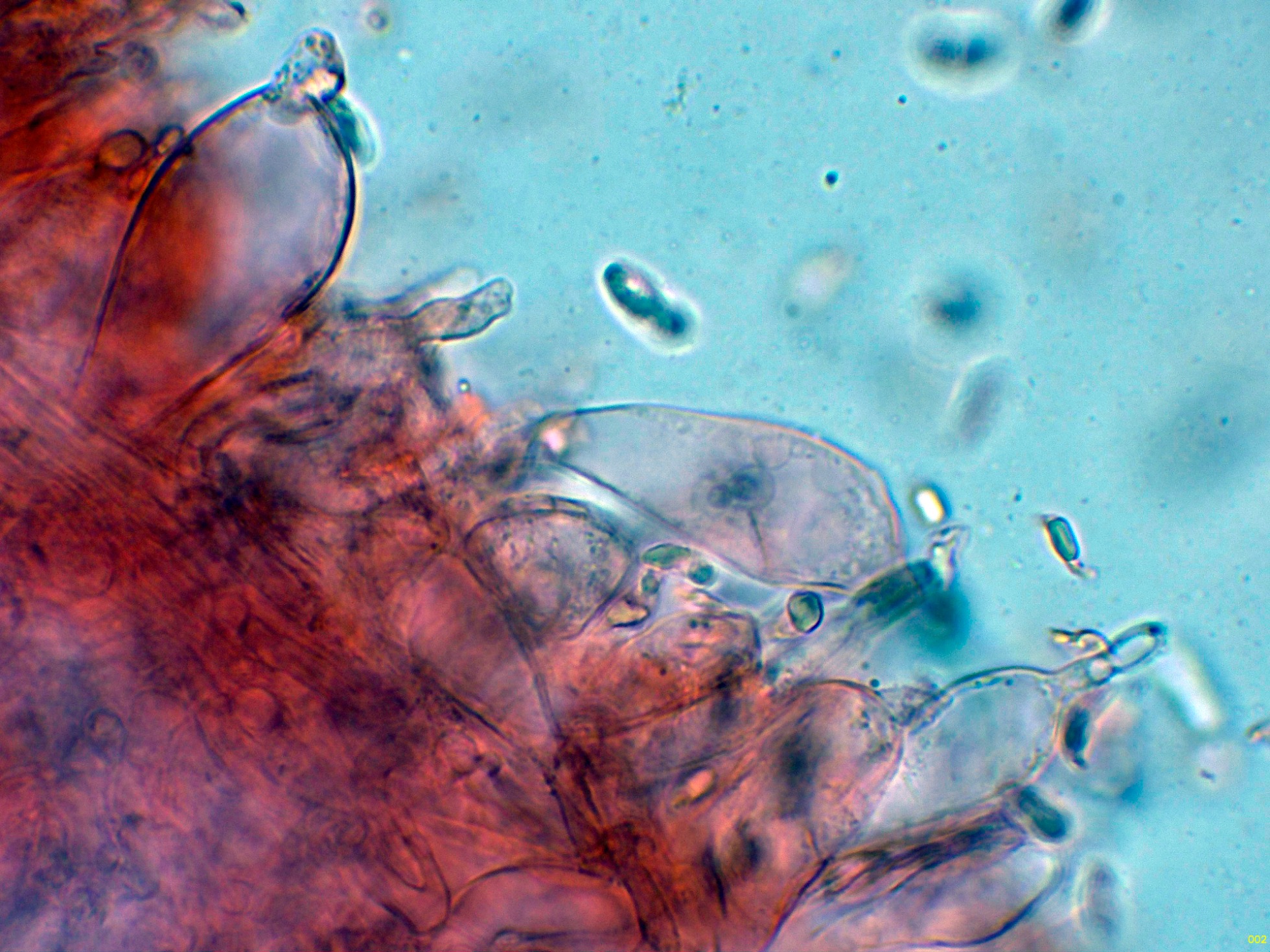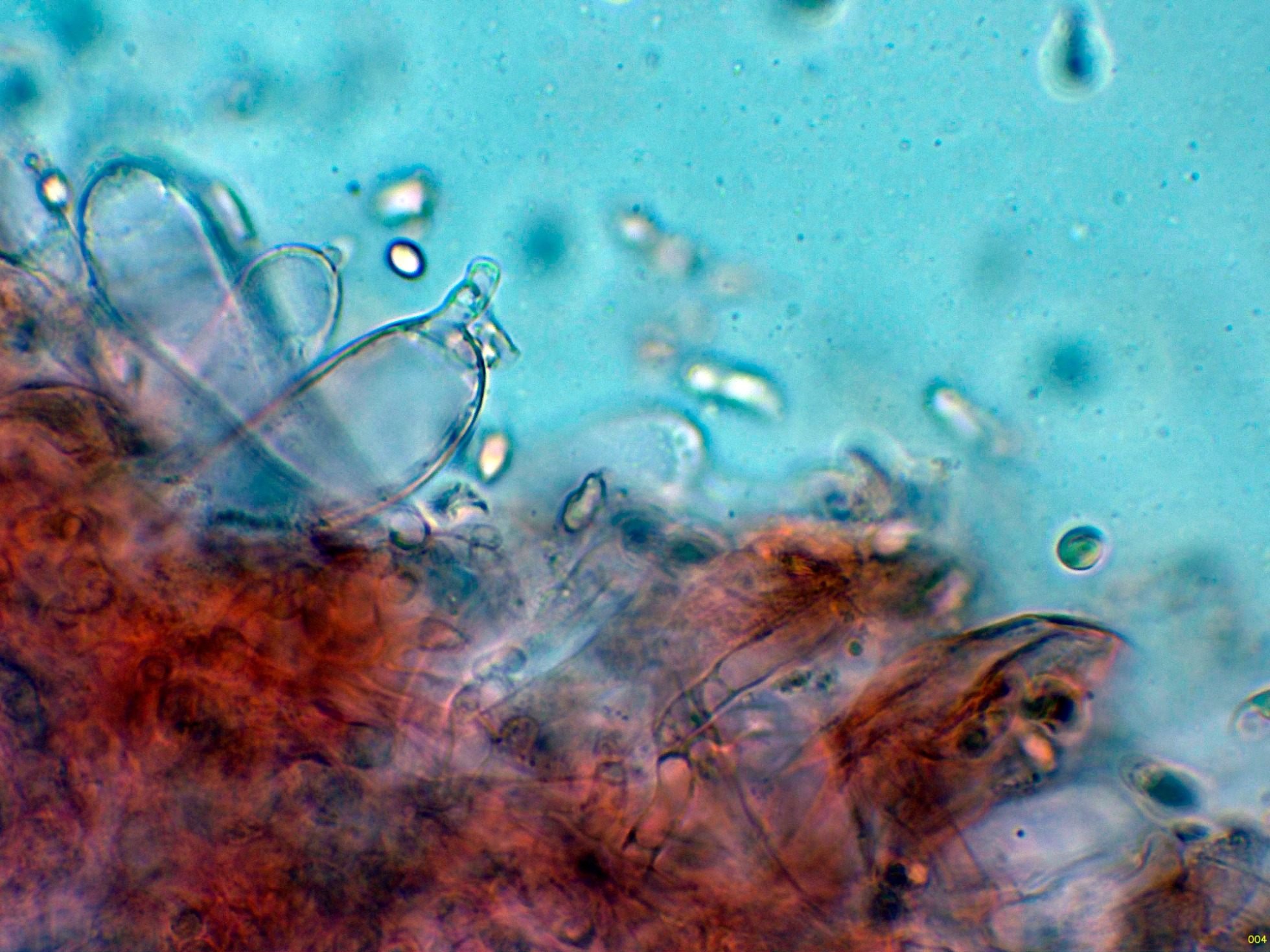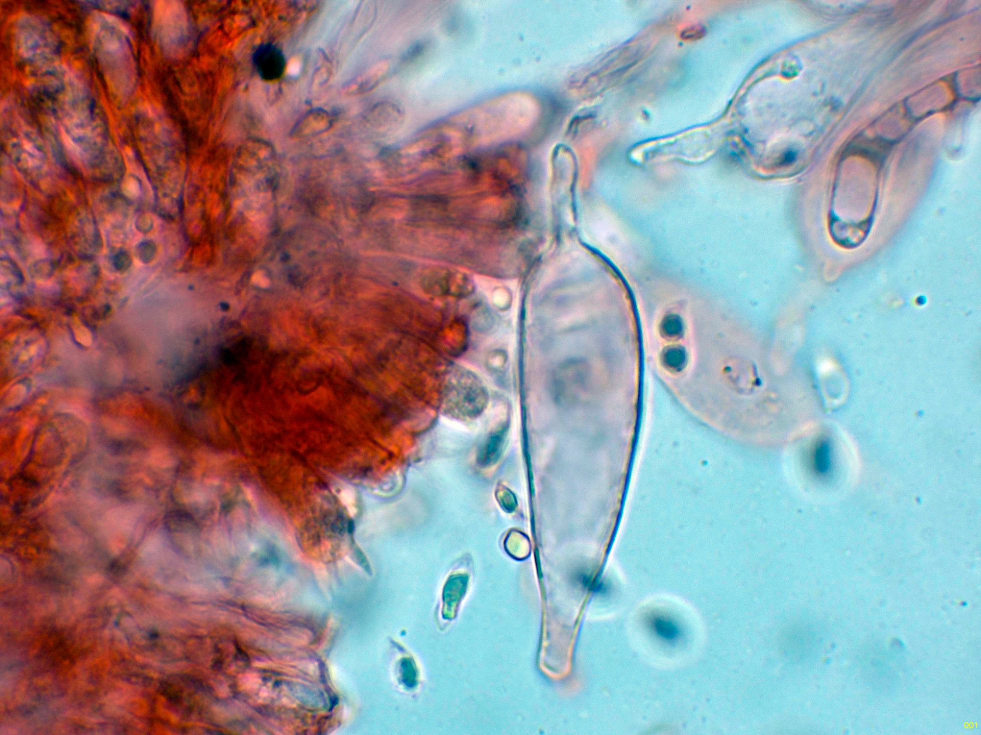 Queilocistidios ventrudos, fusiformes y terminados en un largo cuello estrecho.