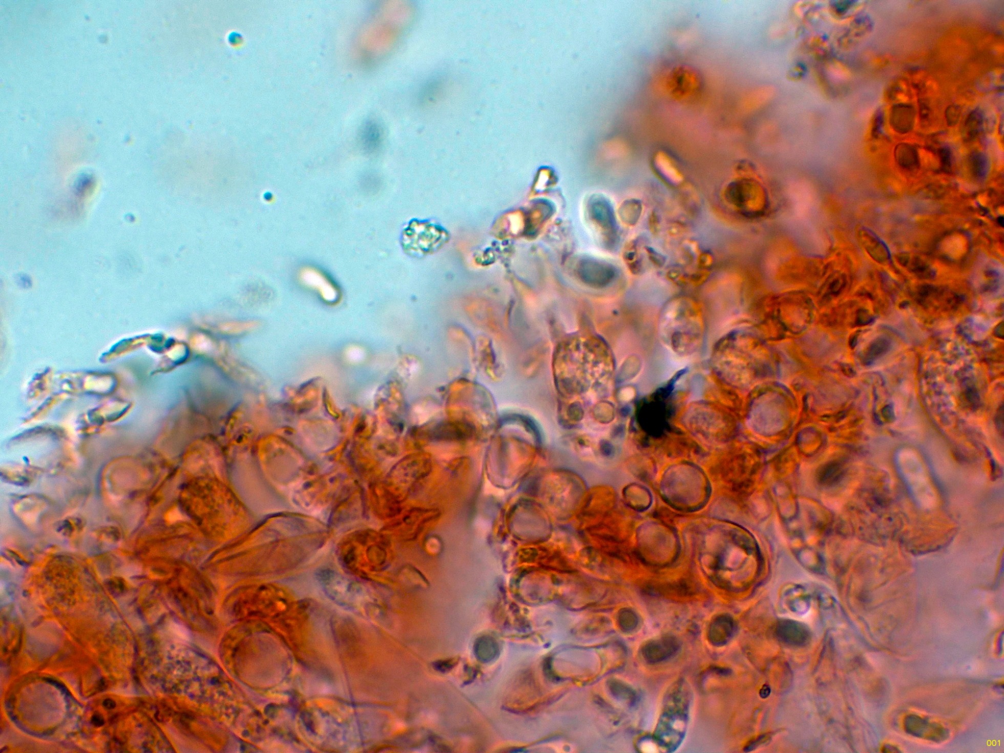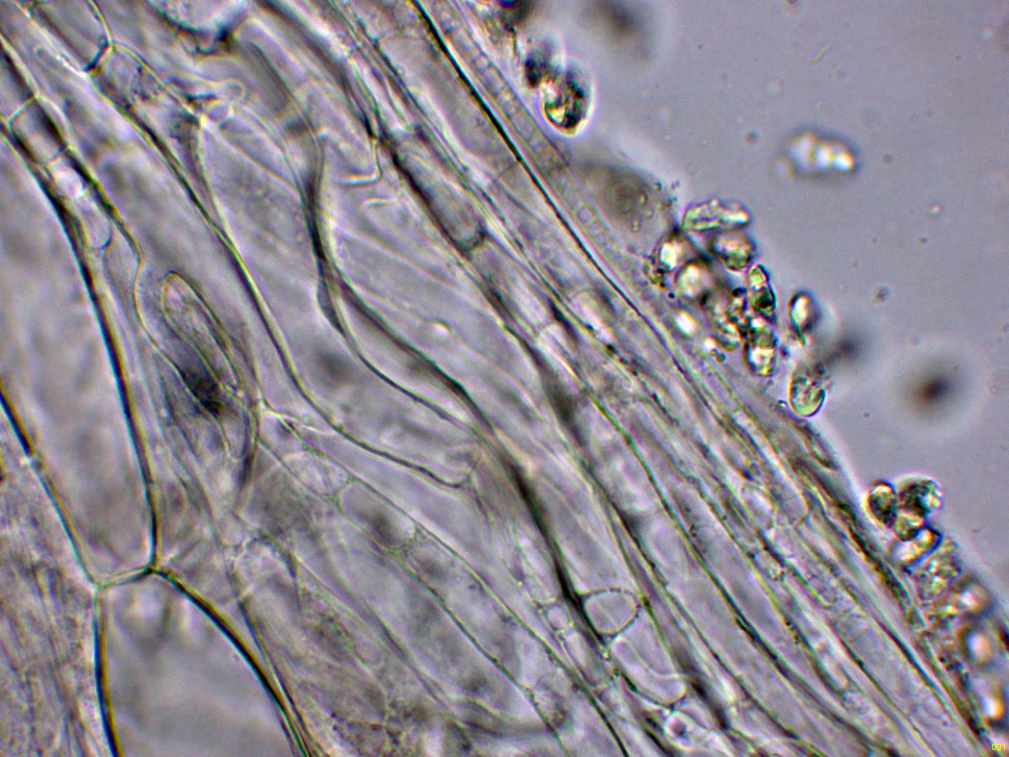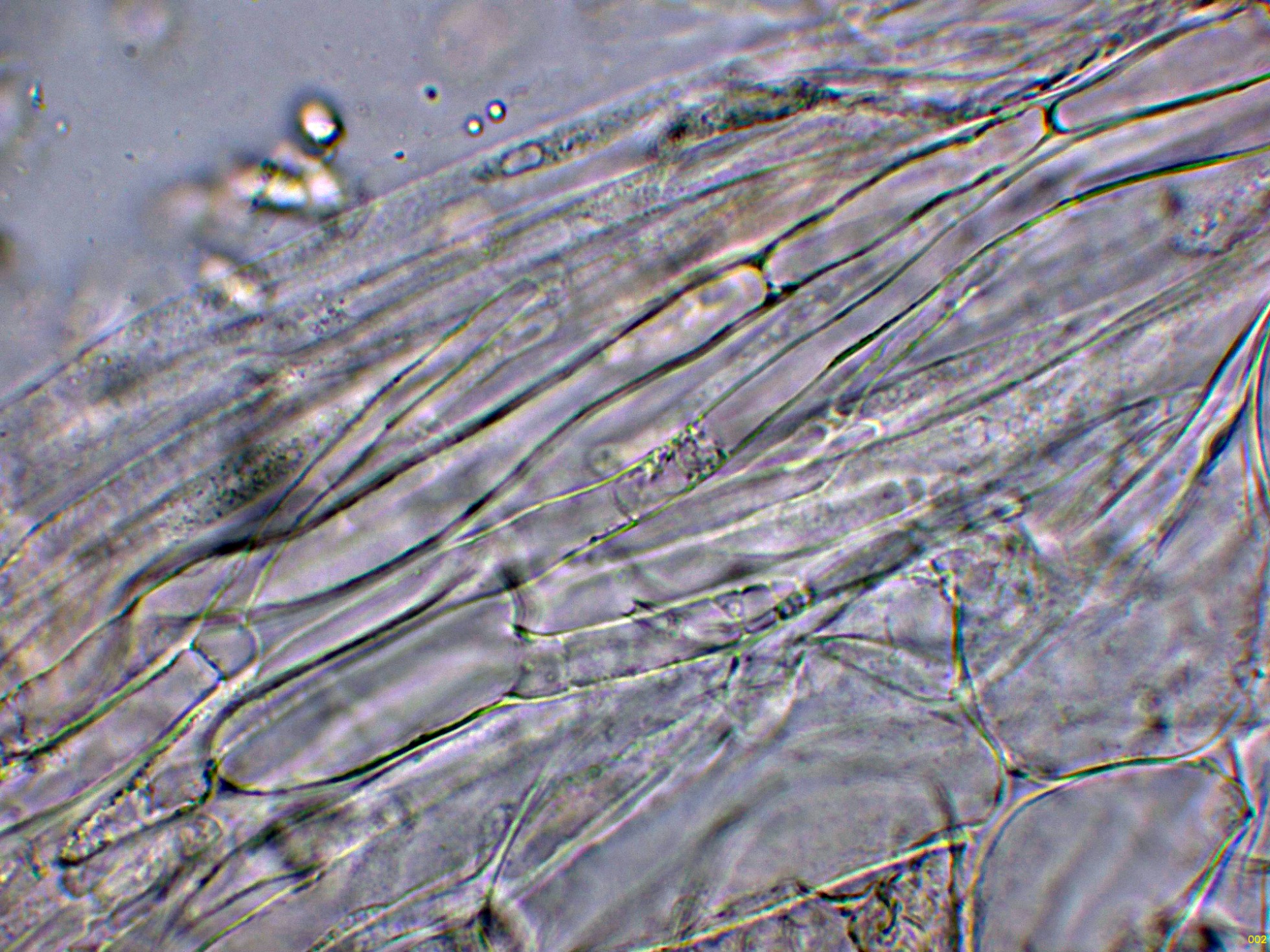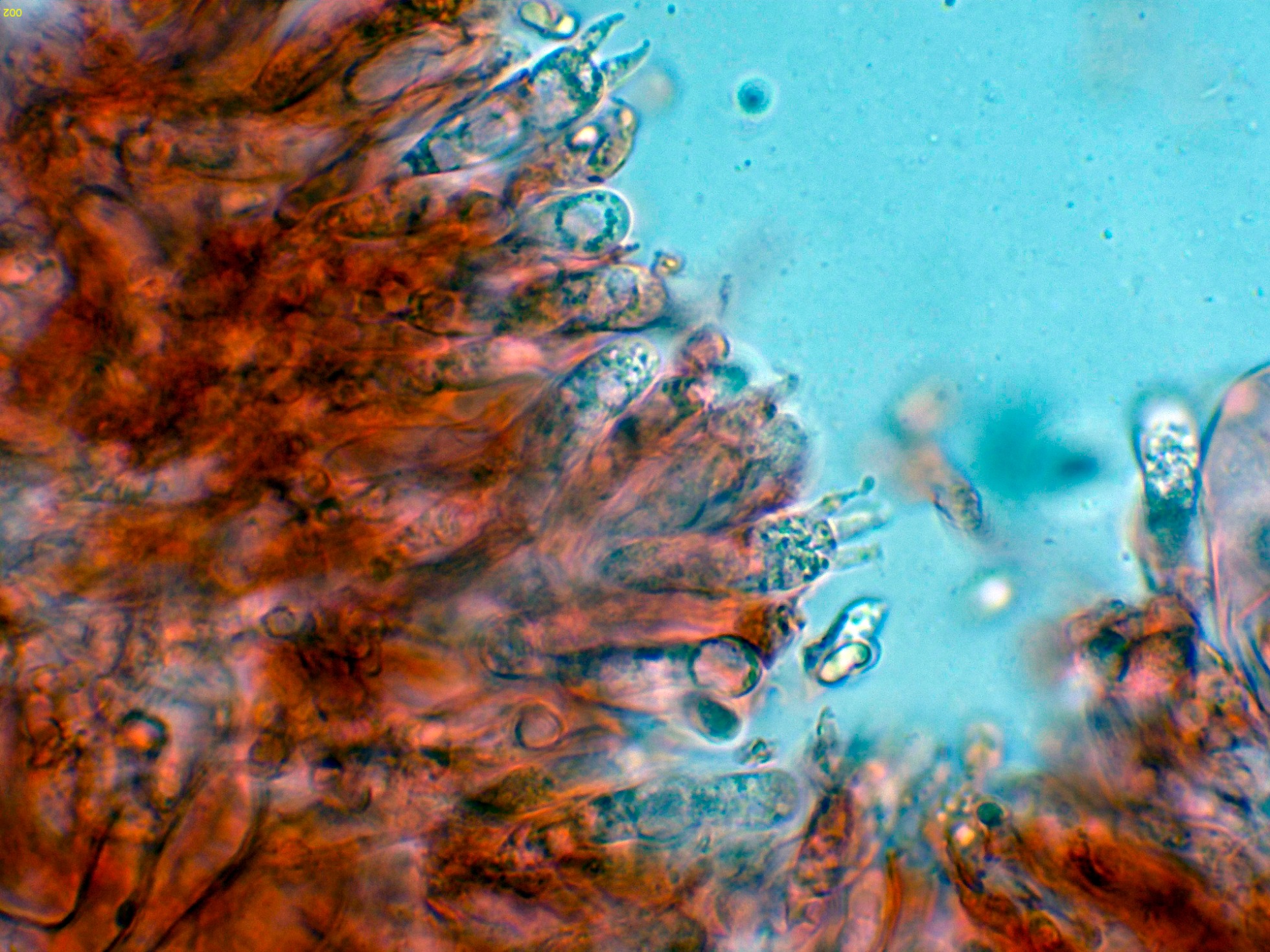 Queilocistidios ventrudos, fusiformes y terminados en un largo cuello estrecho.