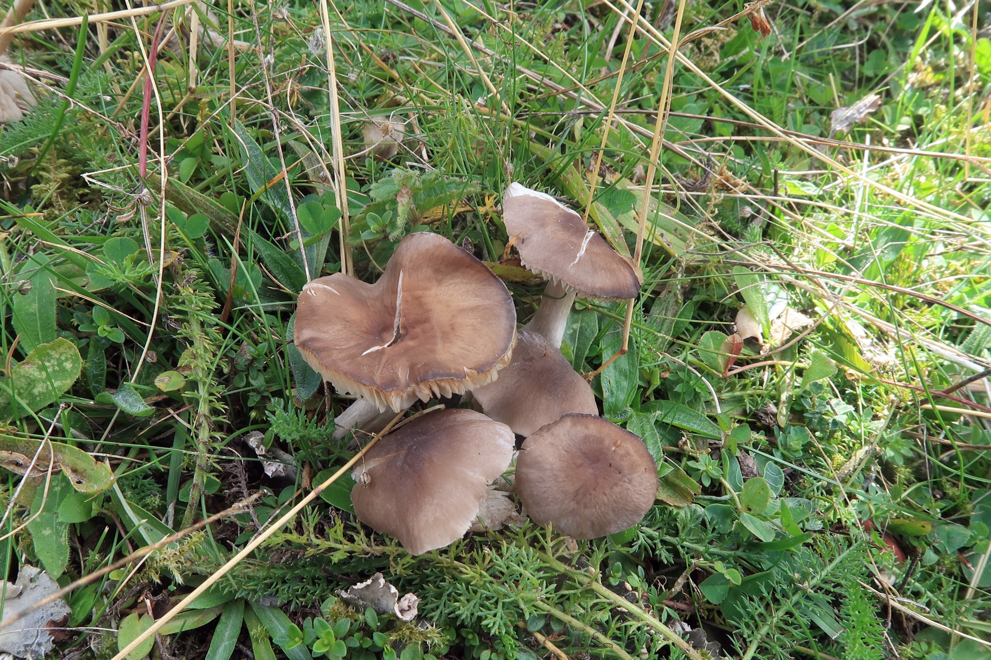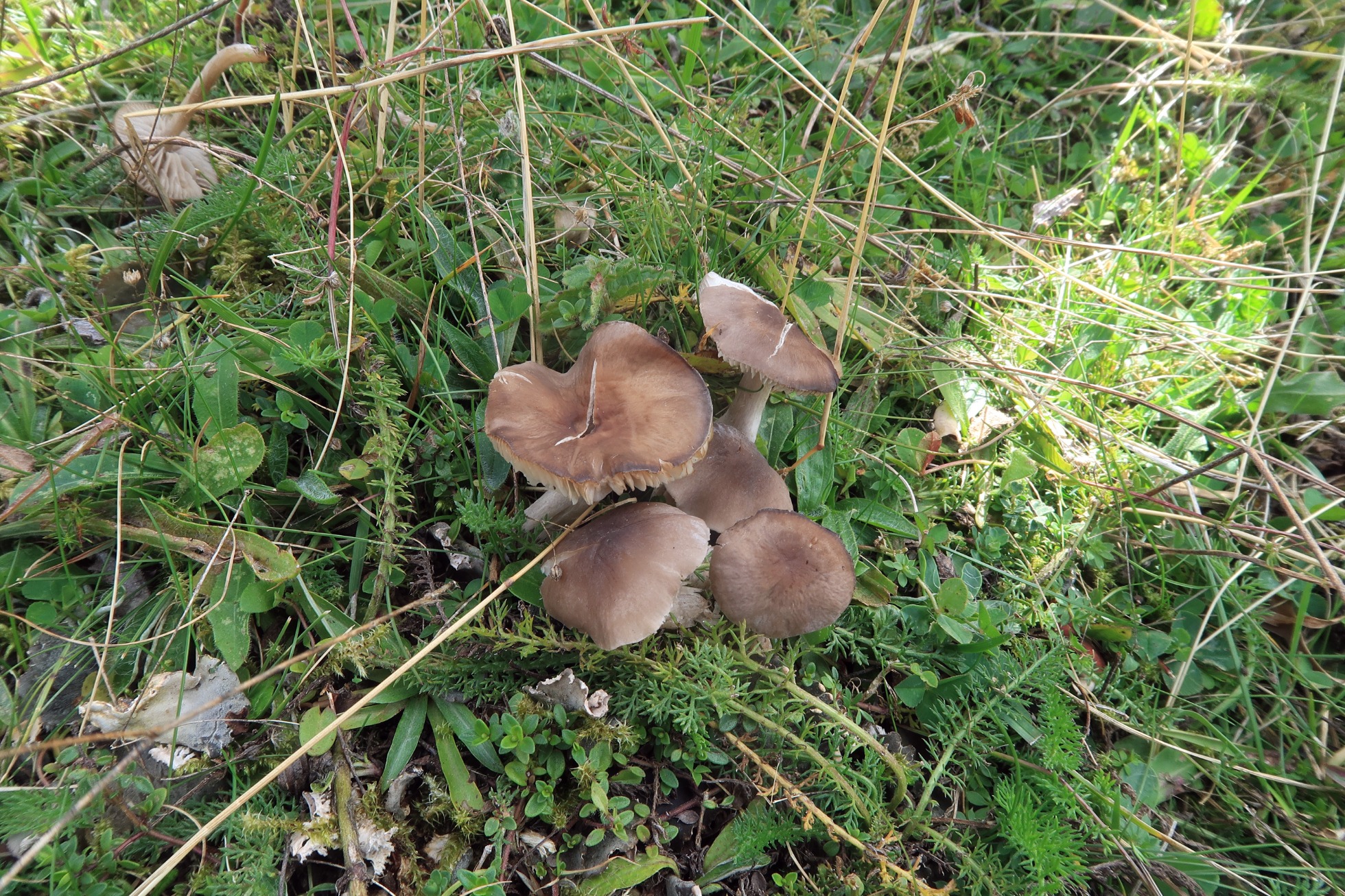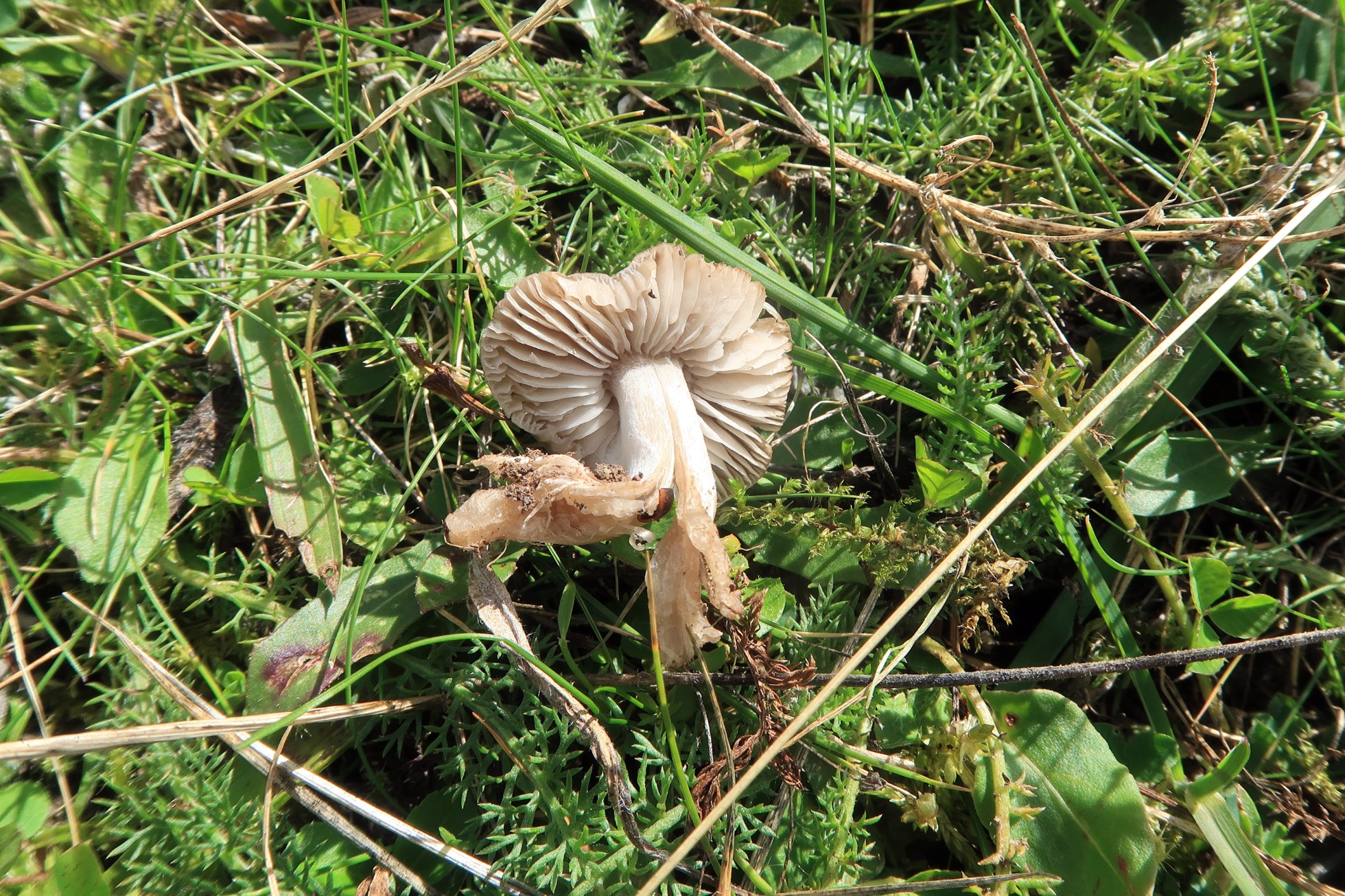 Un hongo de pequeño tamaño con aspecto de Tricholoma fotografiado el 18 de septiembre en la zona de Somport, sobre suelo herboso en un punto cercano al refugio y zona de recreo.